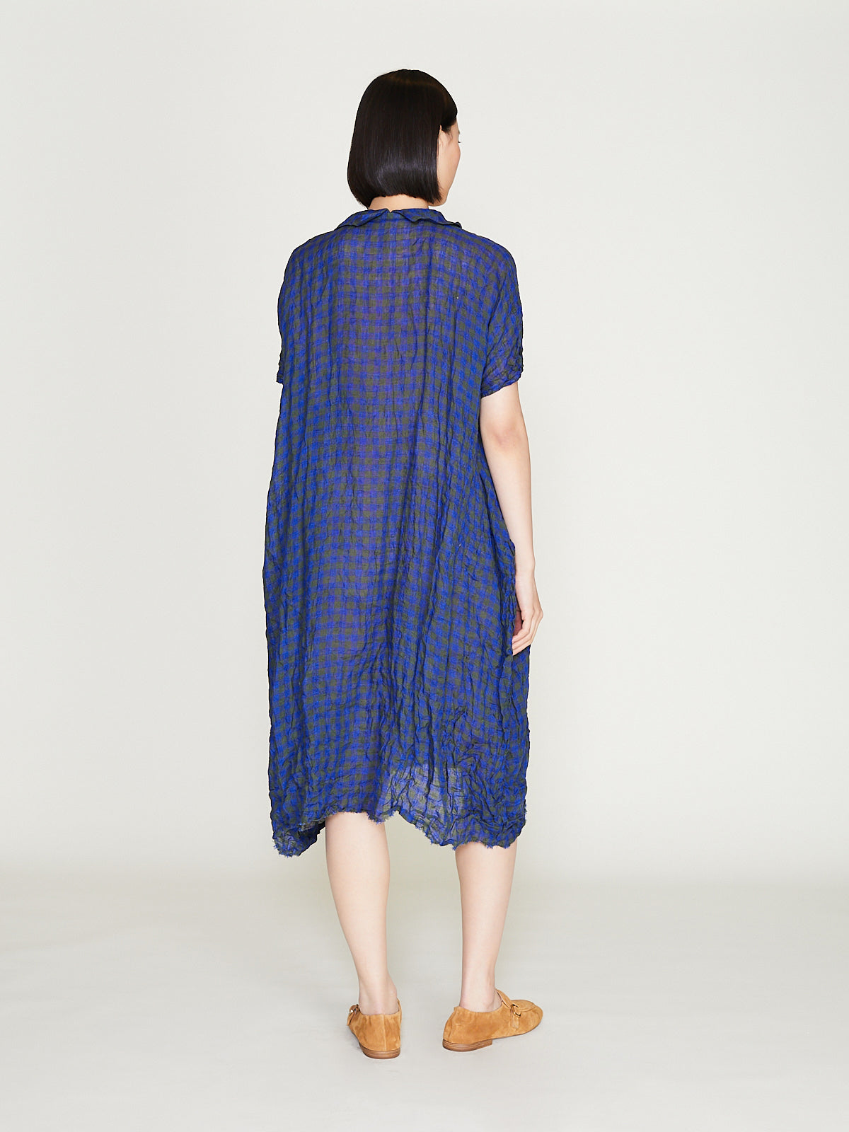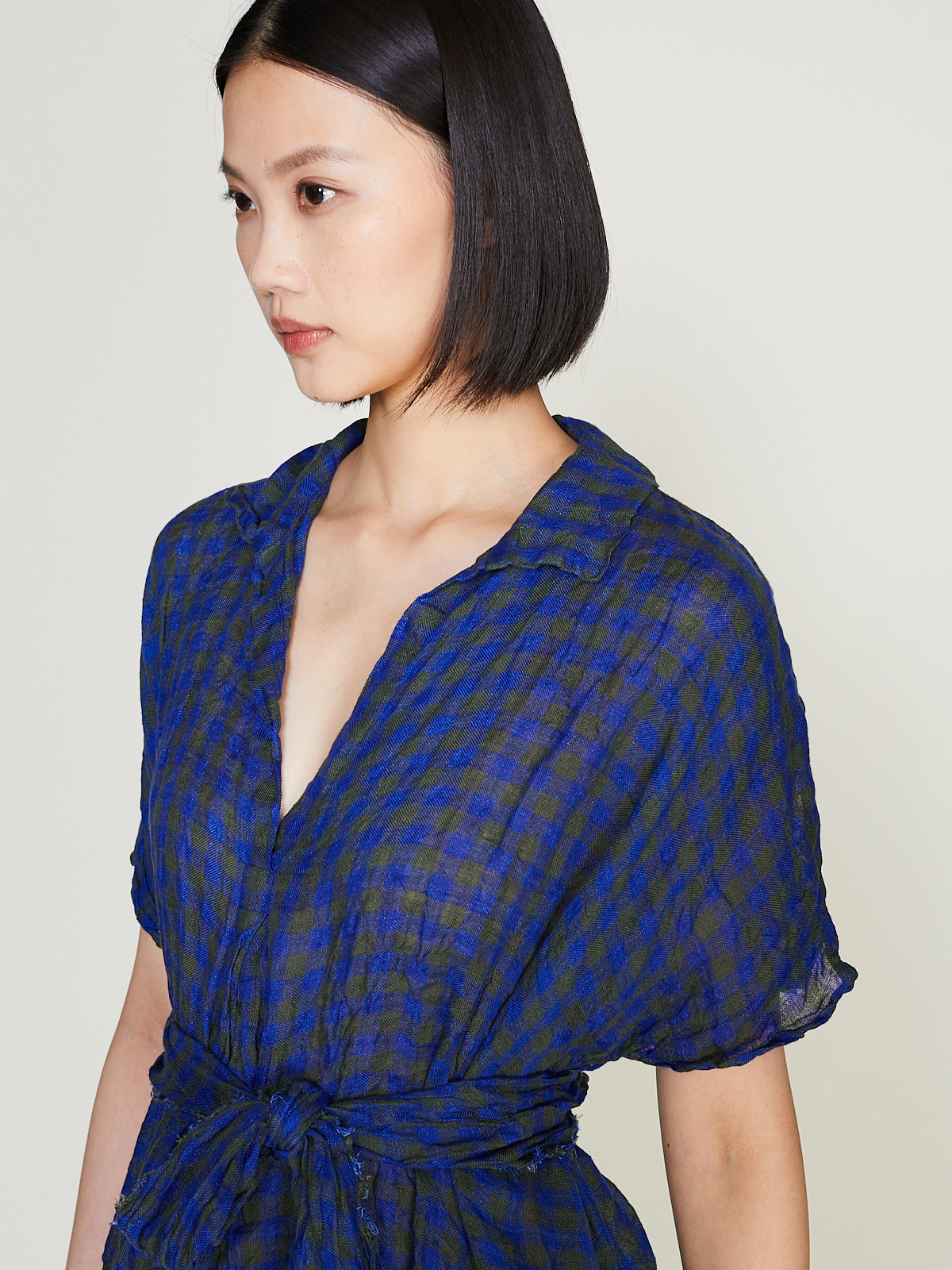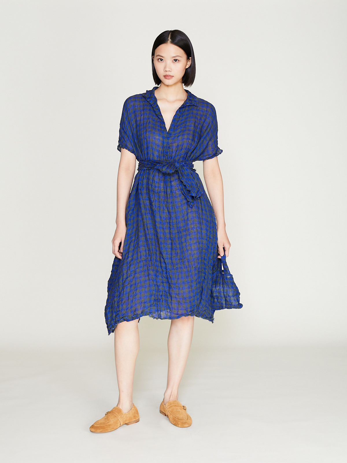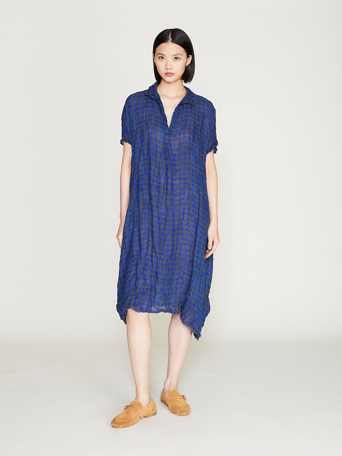 Relaxed dress in washed khaki green/blue checked linen. V-neckline with a small collar and short dolman sleeves. Side seam pockets and midi length. Cinch the silhouette with the removable fabric belt.1cm checks.