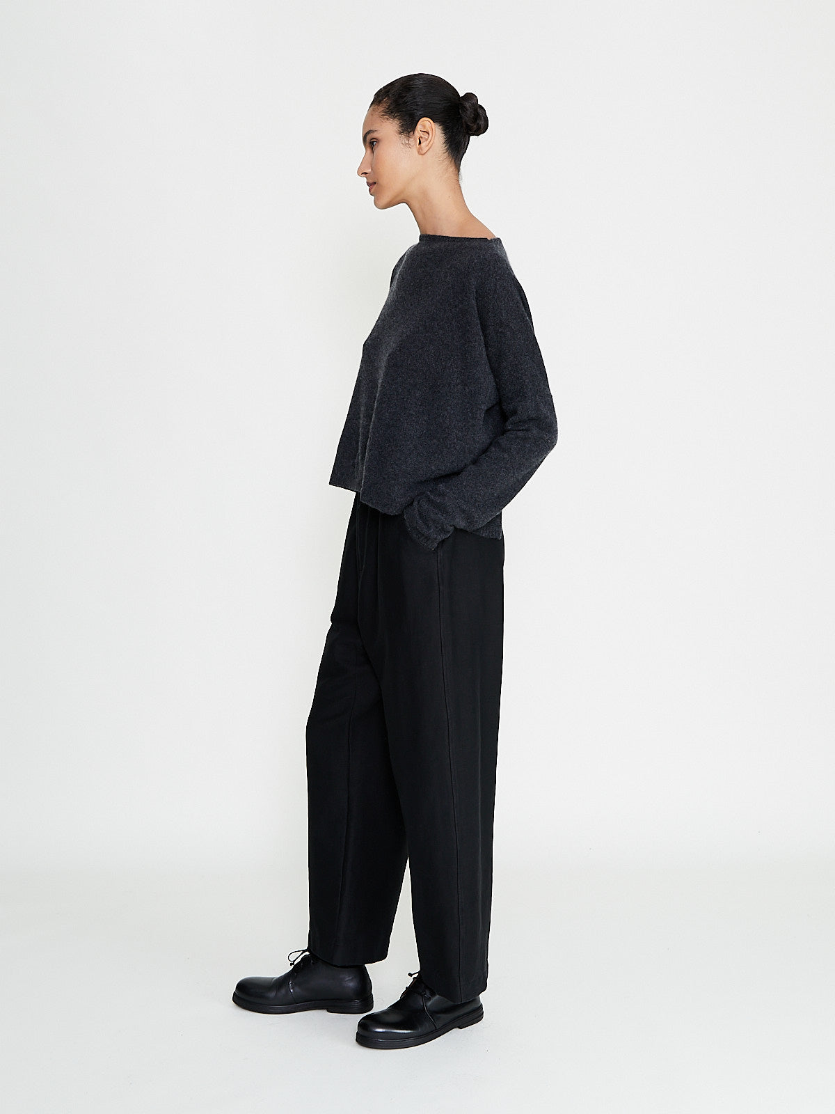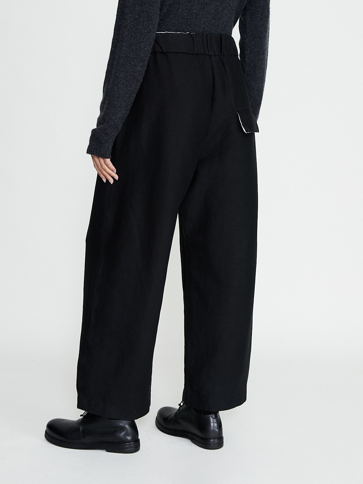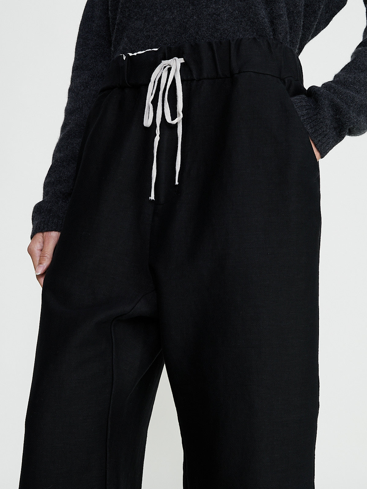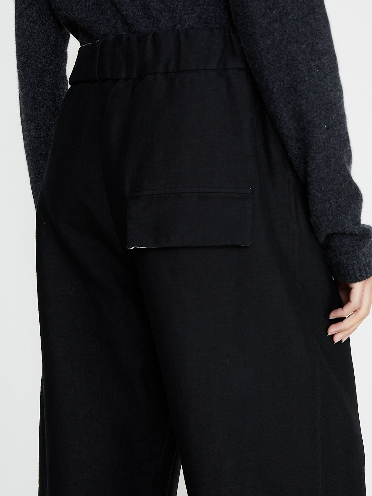 Wide-leg trouser in a black virgin wool blend with diagonal stretch. Pull-on style with an elasticated waistband and adjustable drawstring. Slash pockets on the front and a single flap pocket on the back.