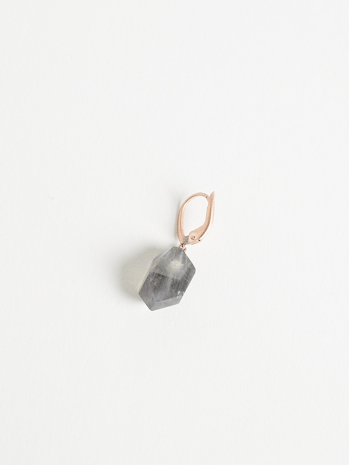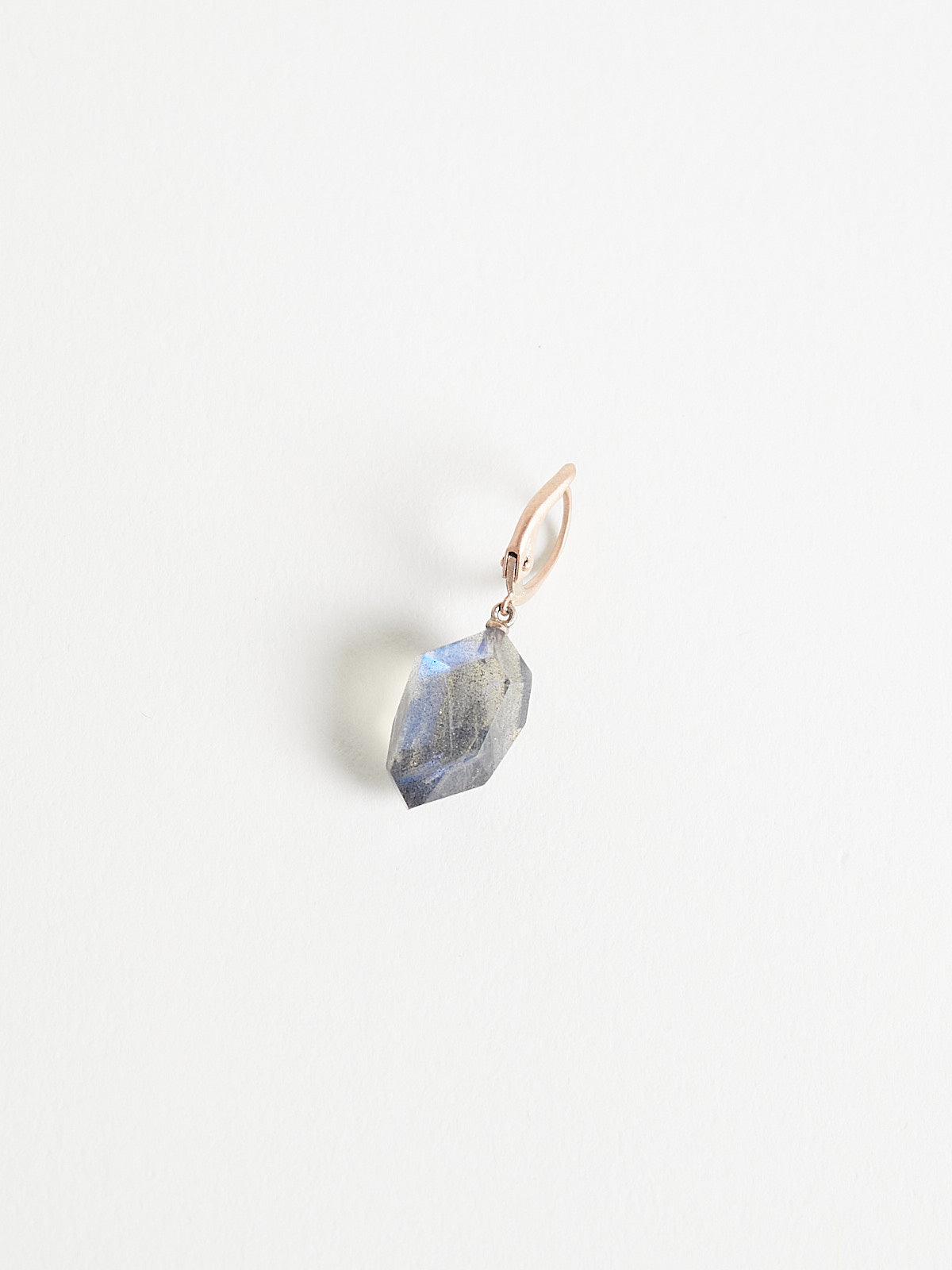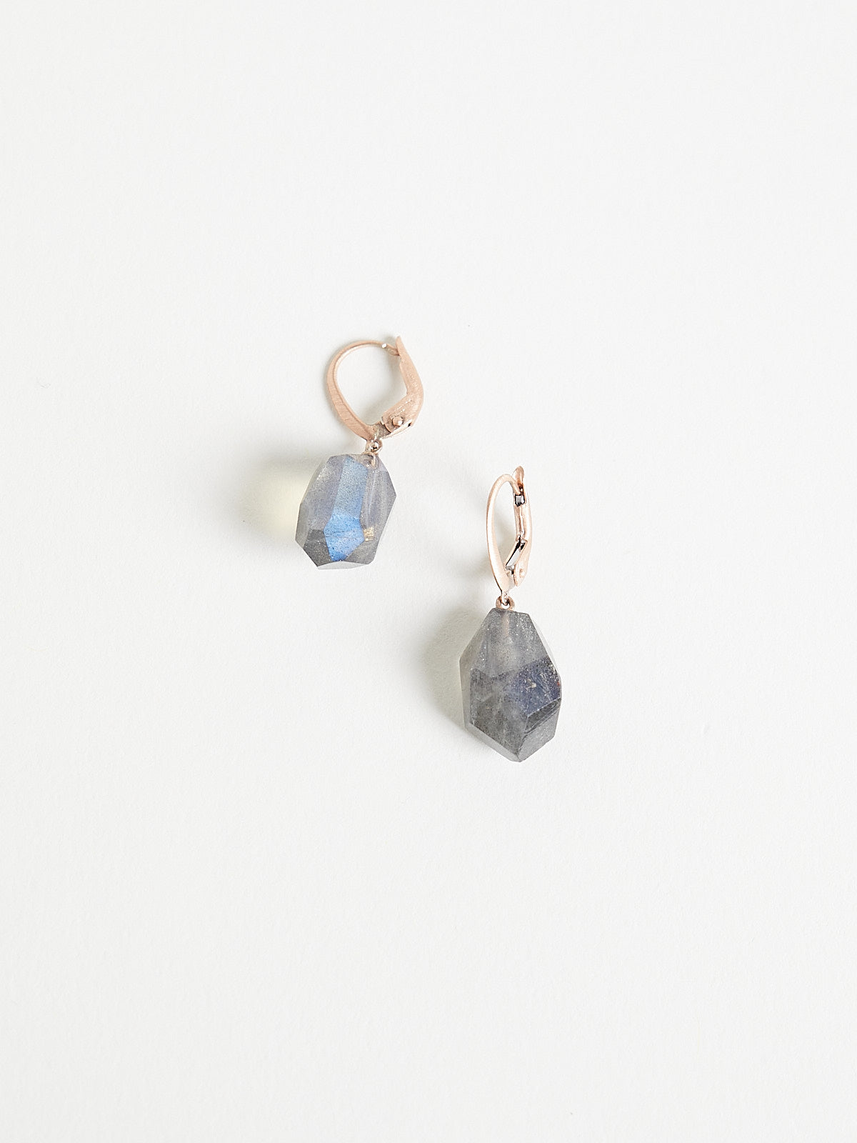 Earrings in 9k rose gold with irregular-shaped 16.59ct grey labradorite drops. Features a lever fastening.