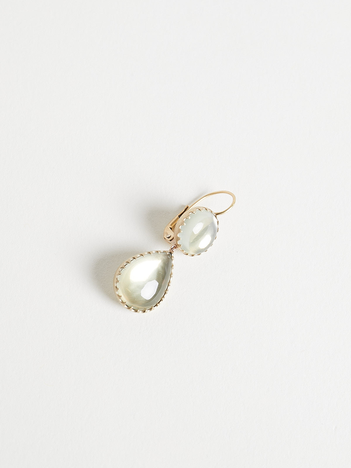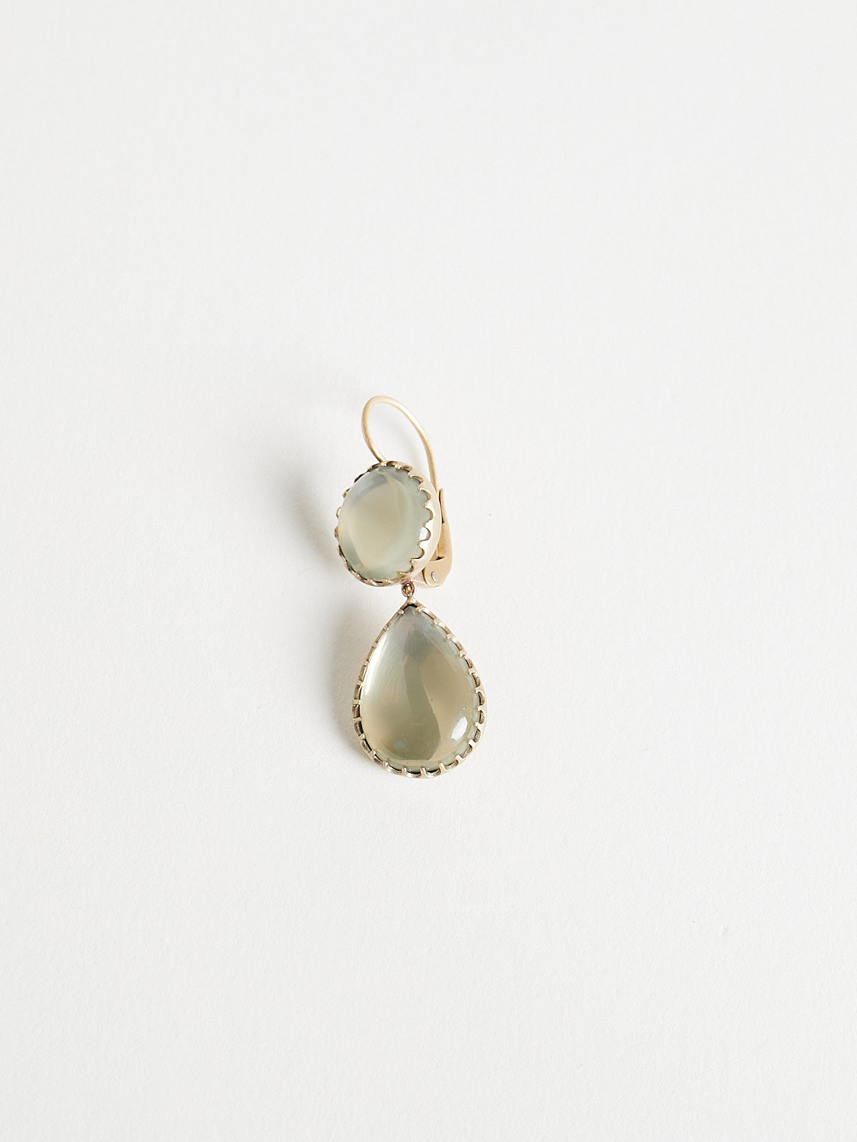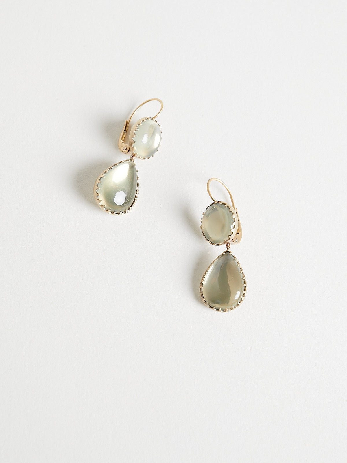 Earrings in 9k yellow gold and 20.95ct green moonstone double drops with a scalloped setting. Features a leverback fastening.