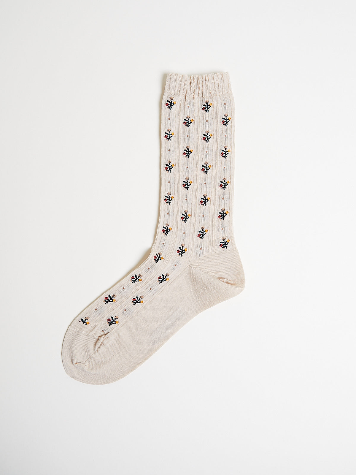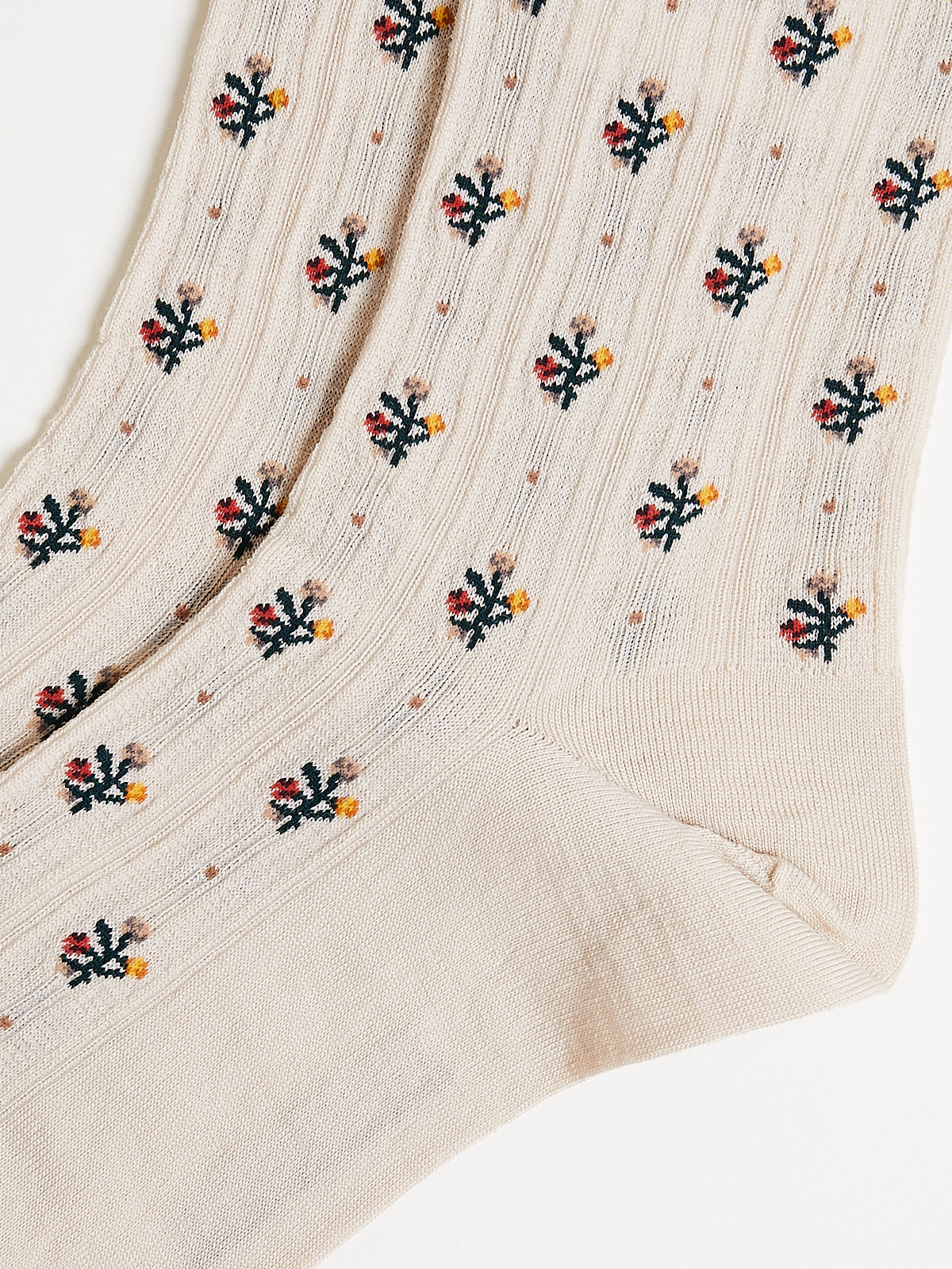 Crew socks in a light beige wool blend with a textured stripe base and a floral motif. Features a ruched cuff.