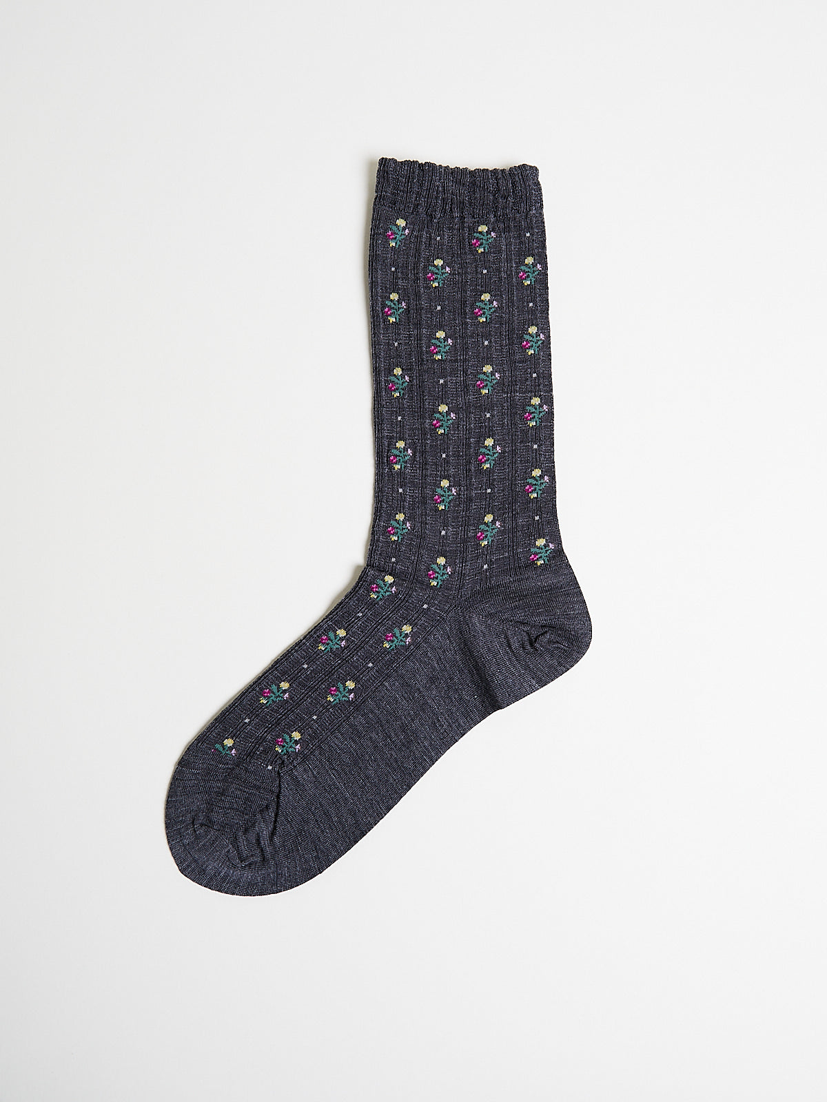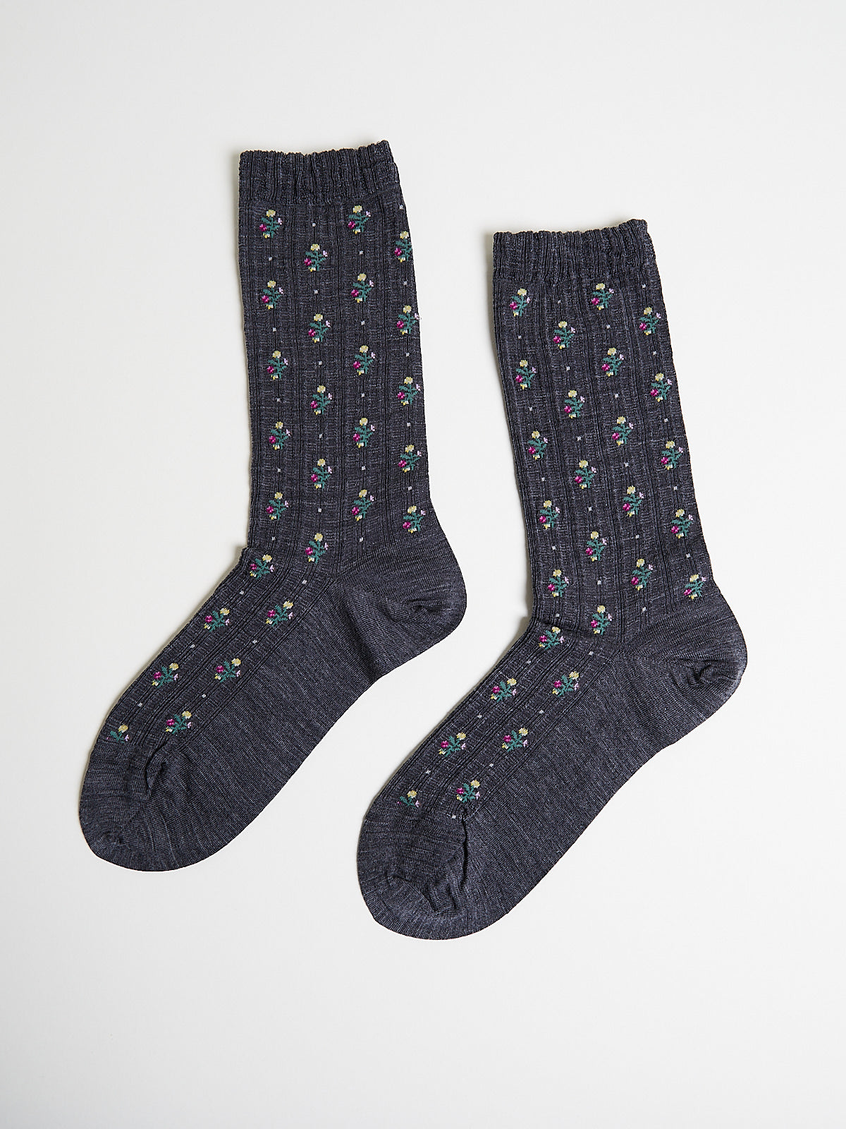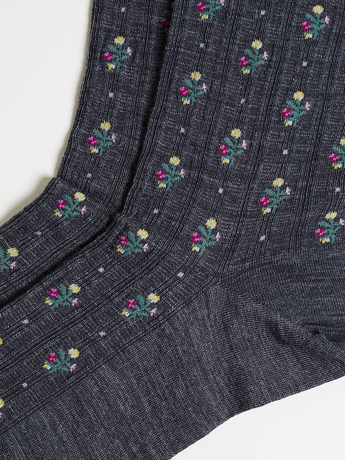 Crew socks in a grey wool blend with a textured stripe base and a floral motif. Features a ruched cuff.