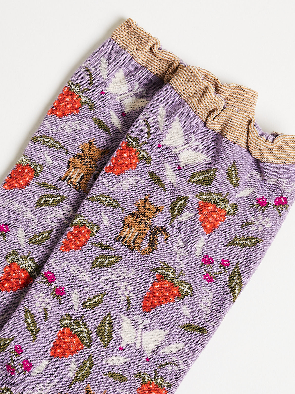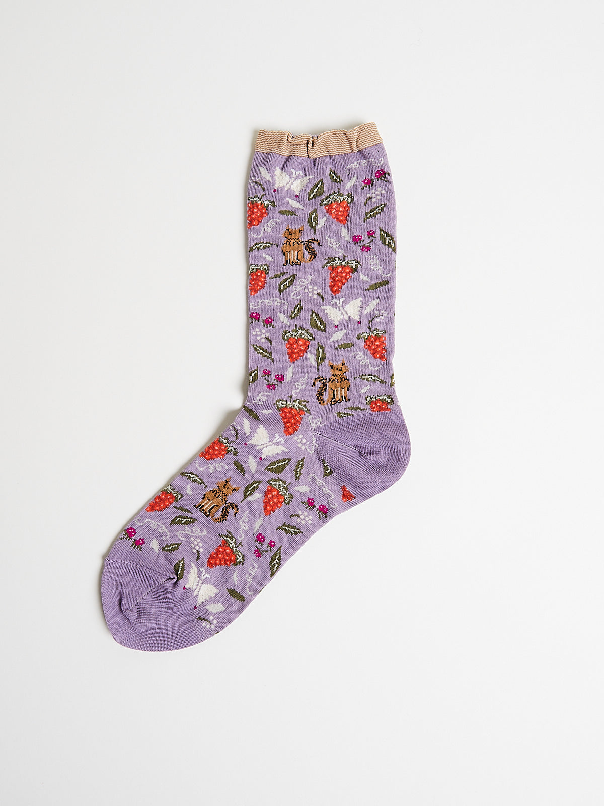 Crew socks in a lilac cotton blend with a cat and garden motif. Features a beige ruched cuff.