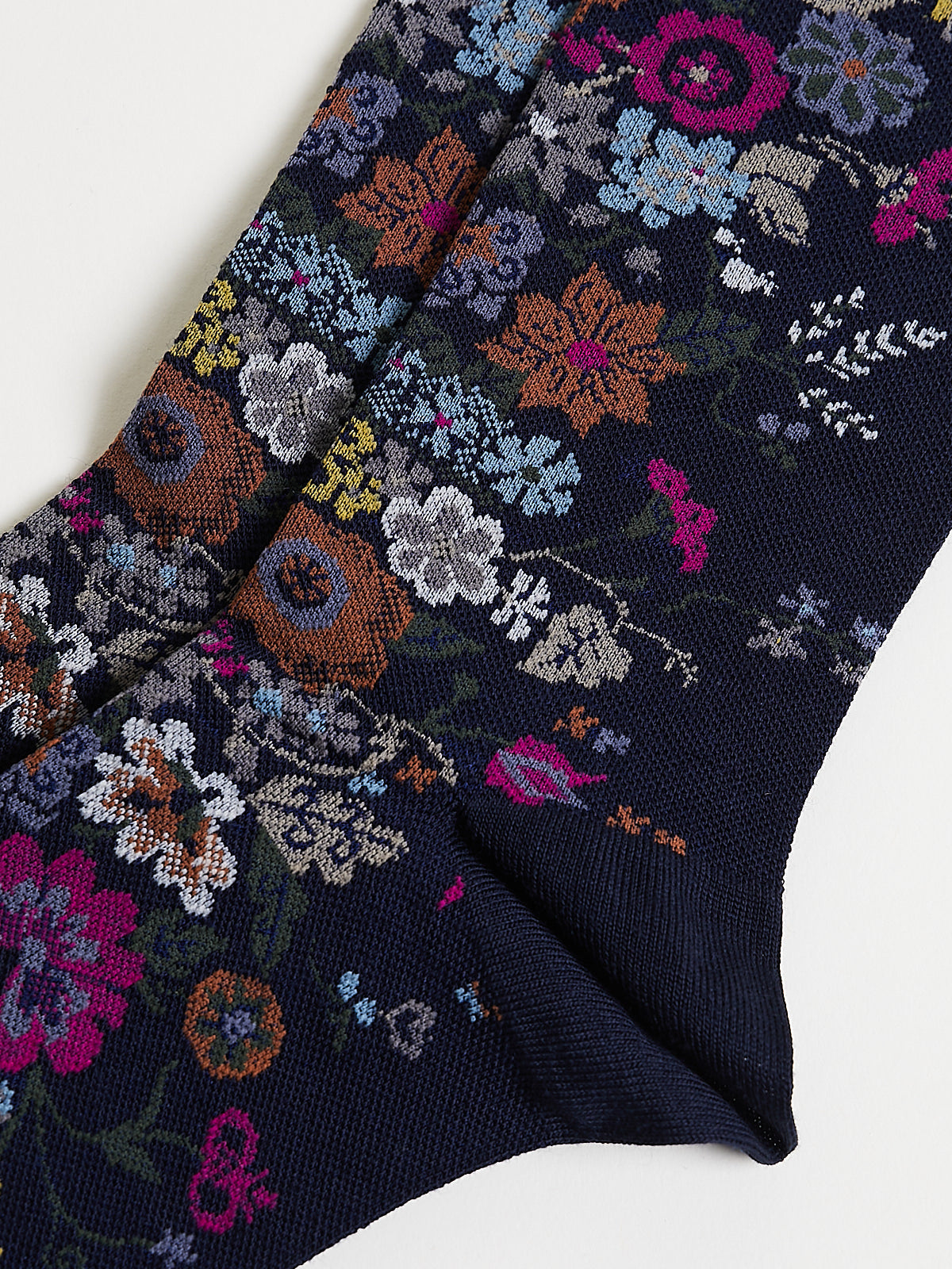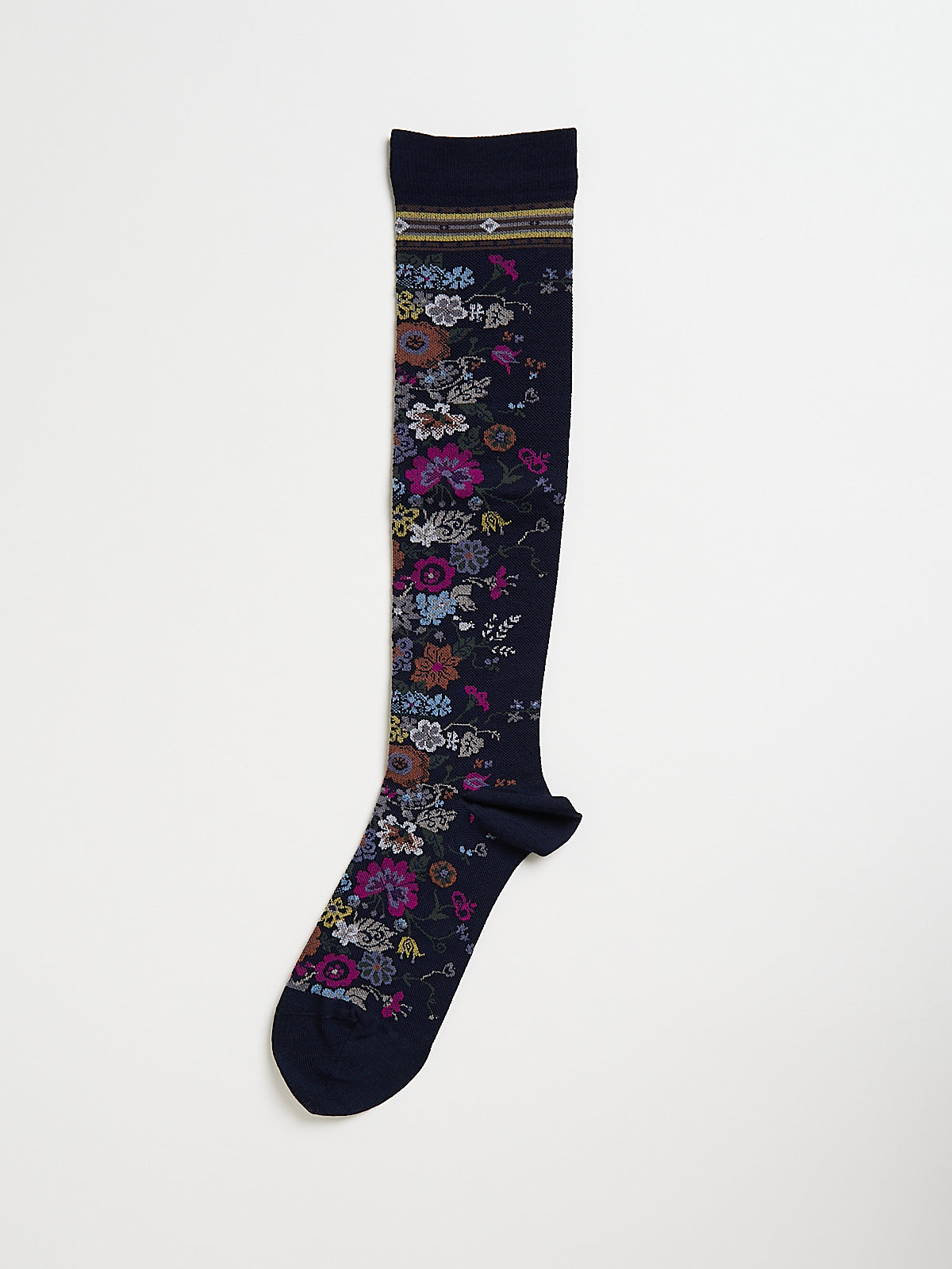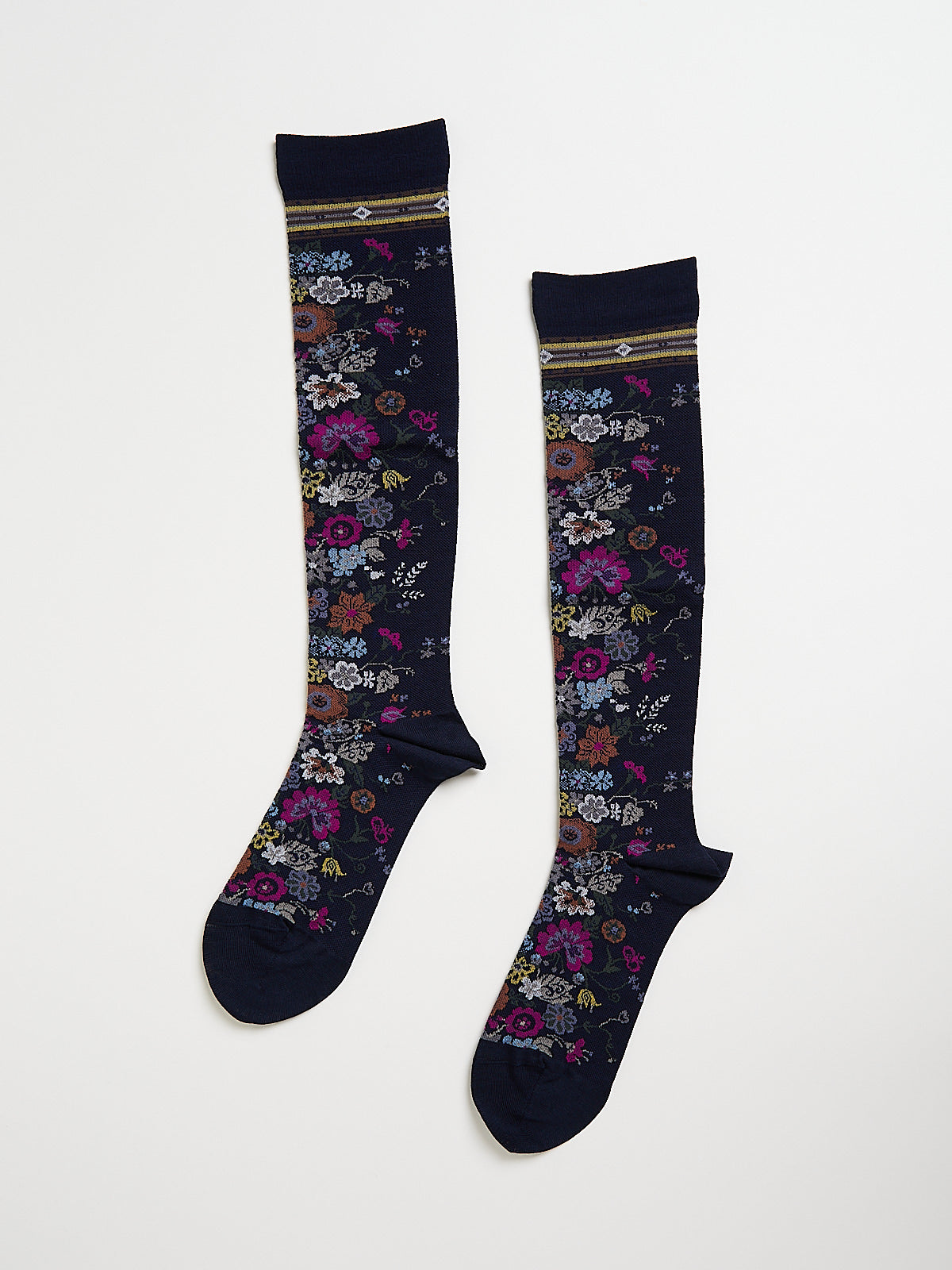 High compression socks in a navy wool blend with a floral motif. Features a reinforced cuff and contoured heel and toe.