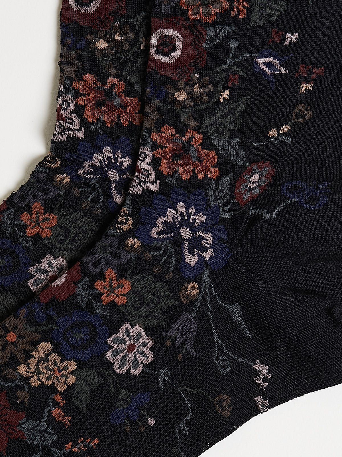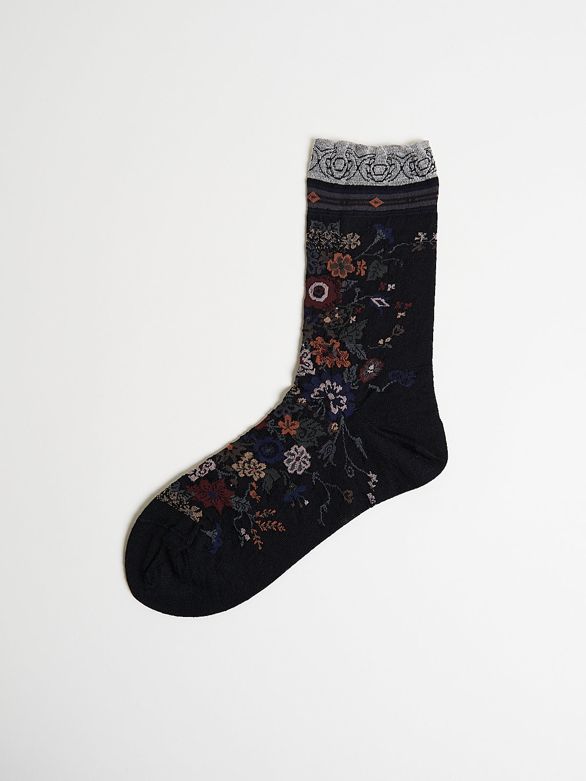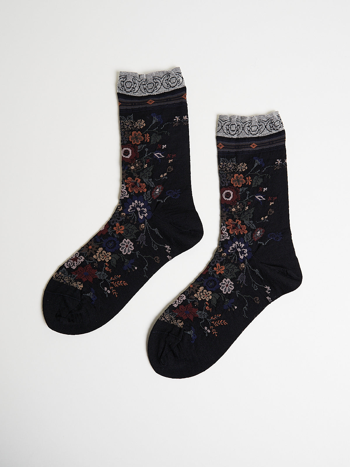 Mid-crew socks in a black wool blend with a floral motif. Features a grey ruched cuff.
