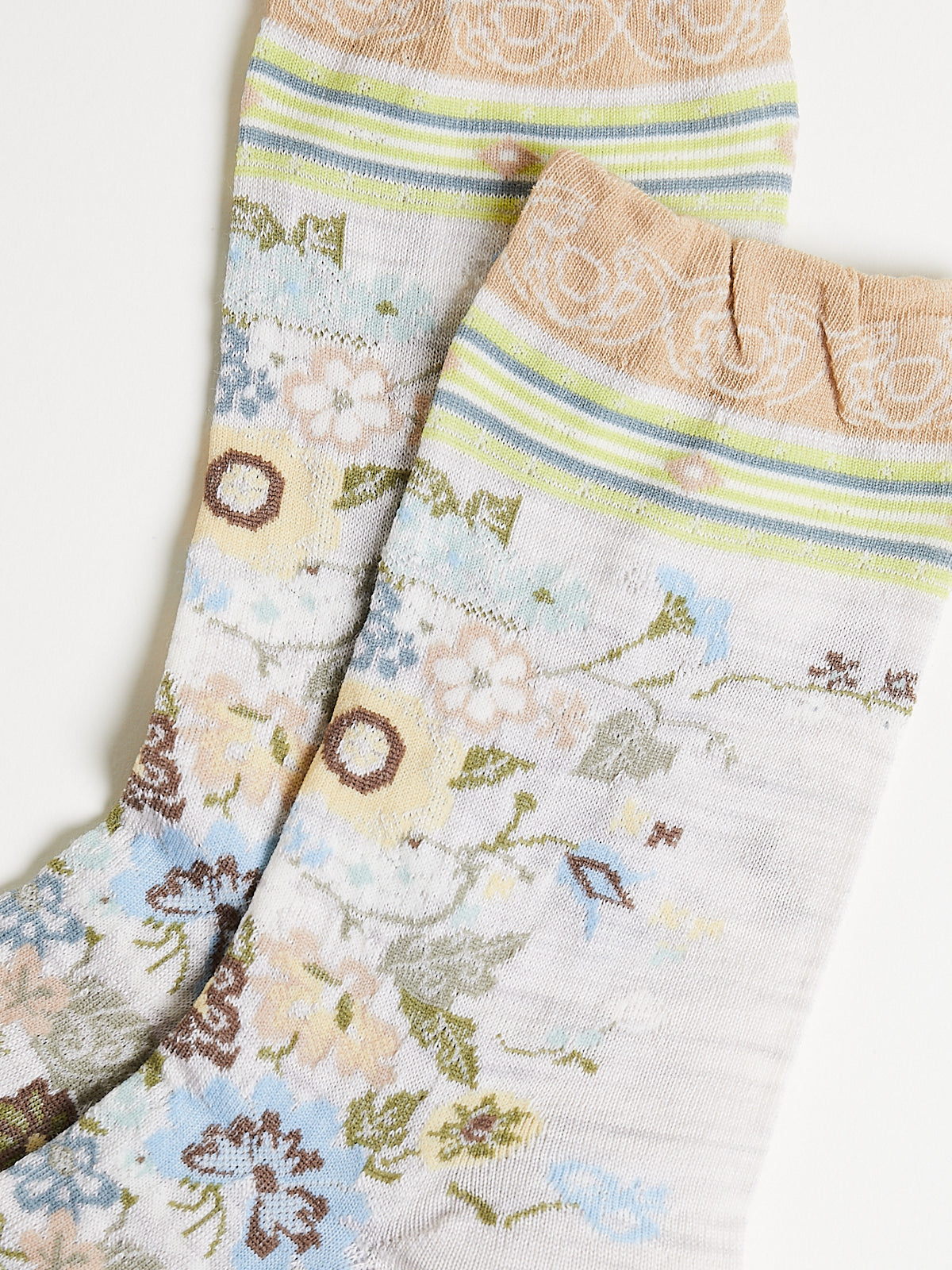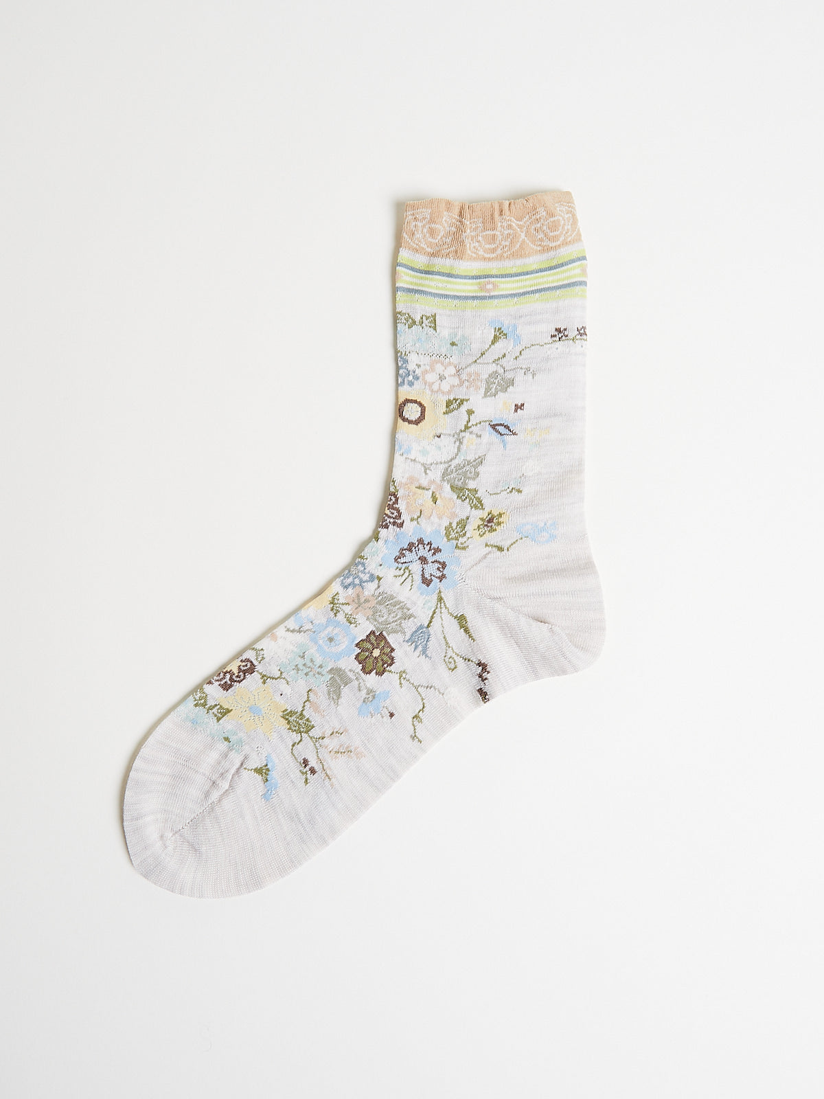 Mid-crew socks in a white wool blend with a floral motif. Features a ruched cuff.