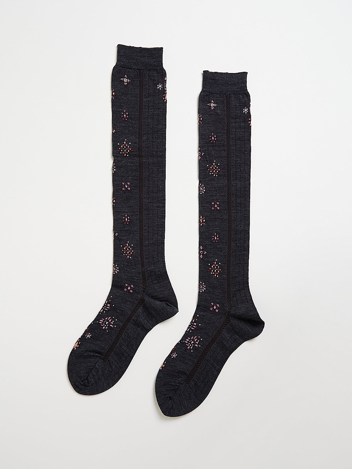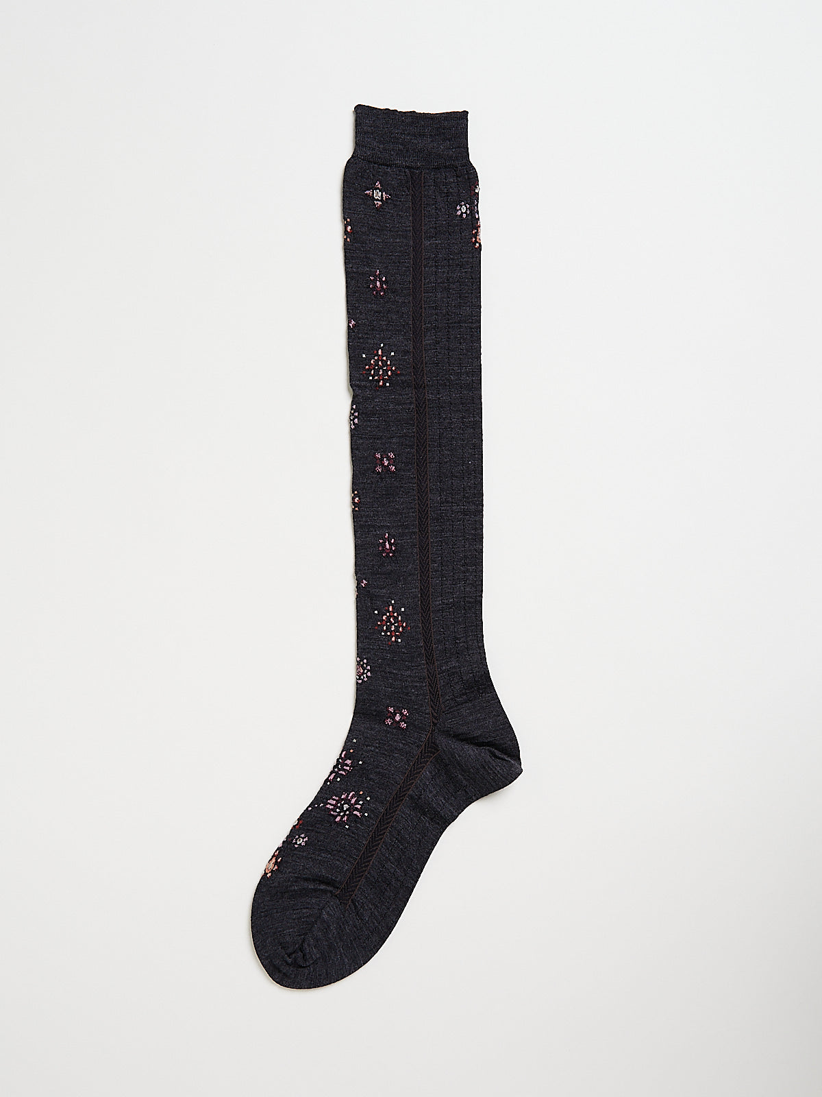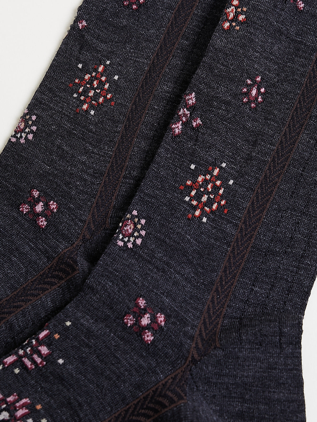 Knee-high socks in a charcoal grey wool blend with a multicoloured gemstone-inspired motif and a herringbone stripe on the side. Features a fine-rib cuff.