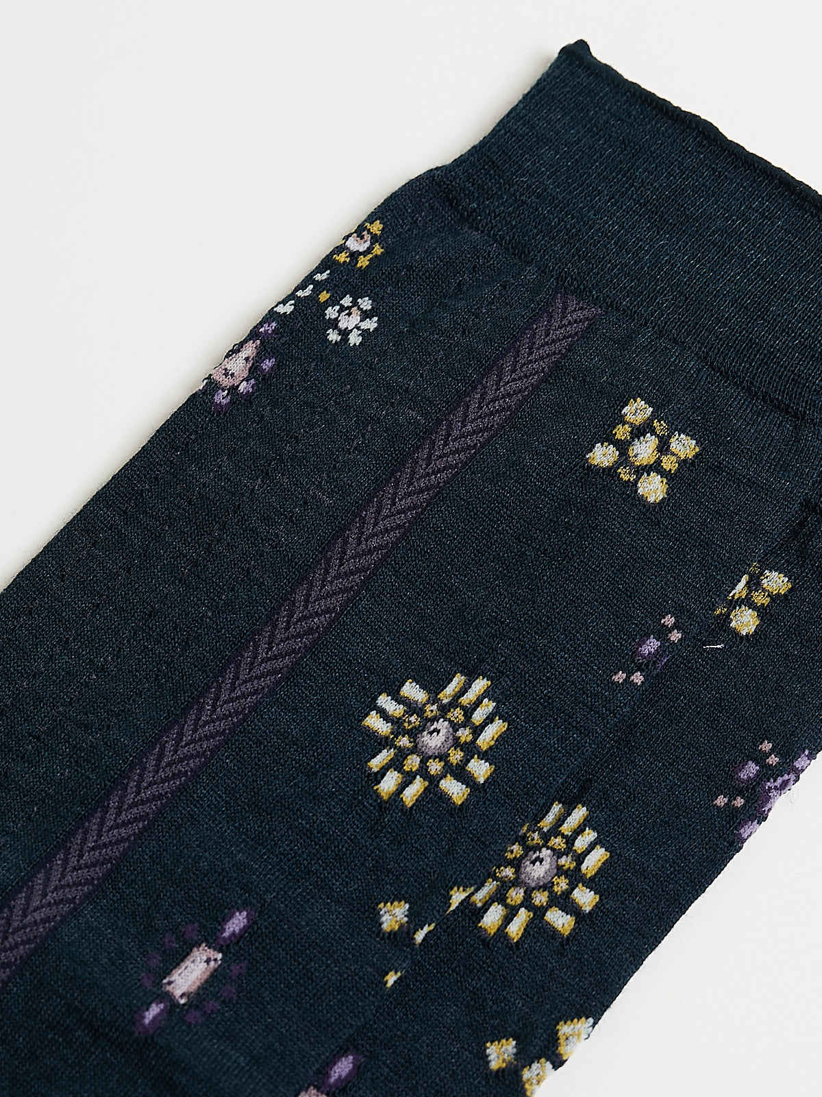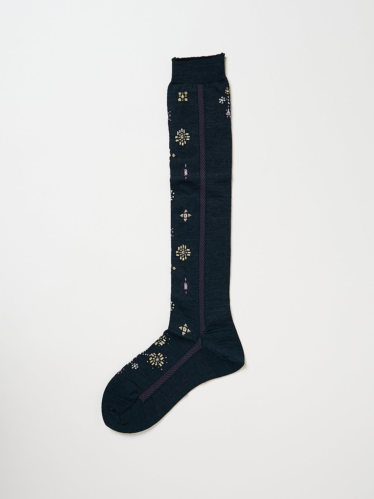 Knee-high socks in a dark green wool blend with a multicoloured gemstone-inspired motif and a herringbone stripe on the side. Features a fine-rib cuff.