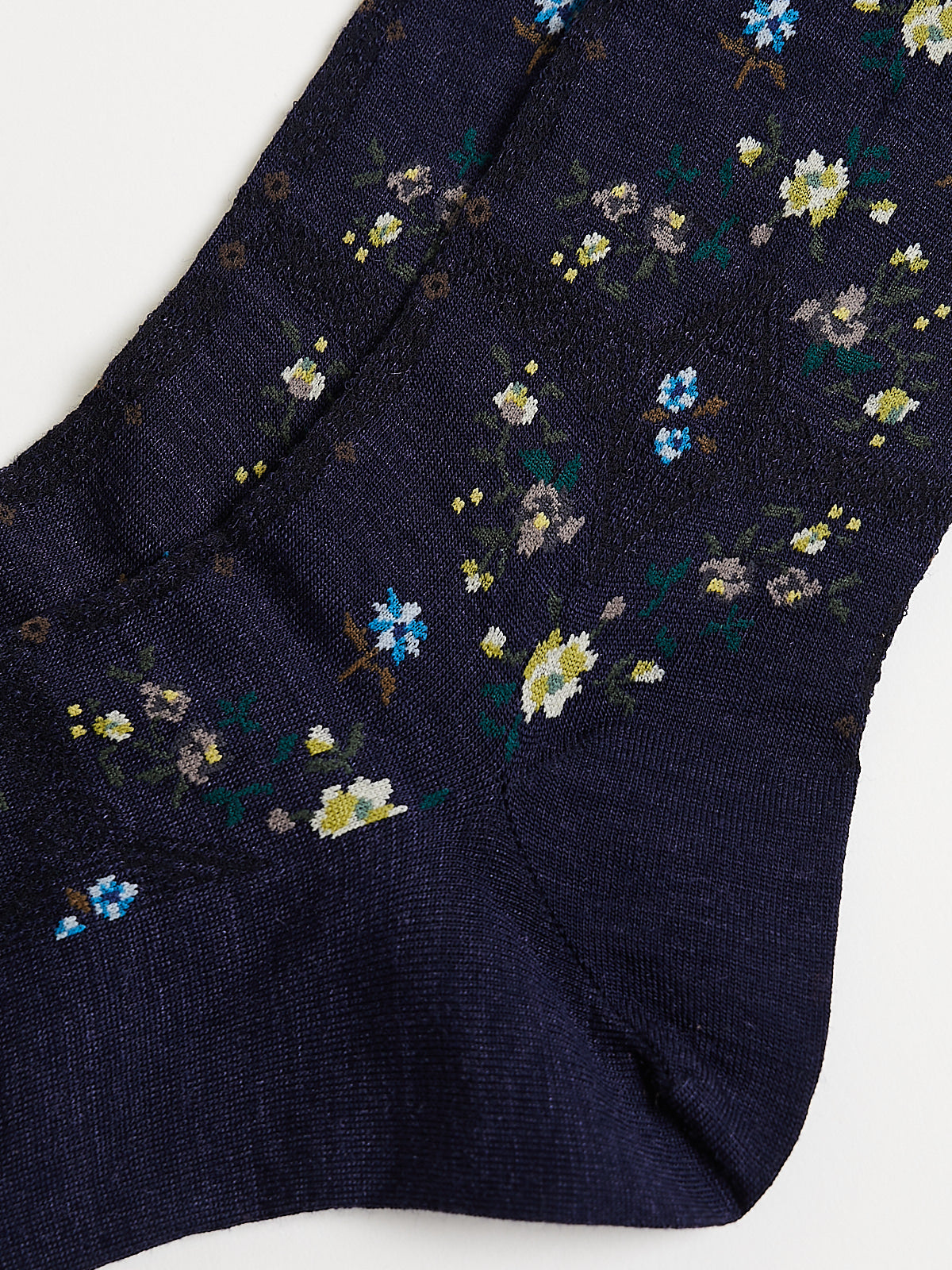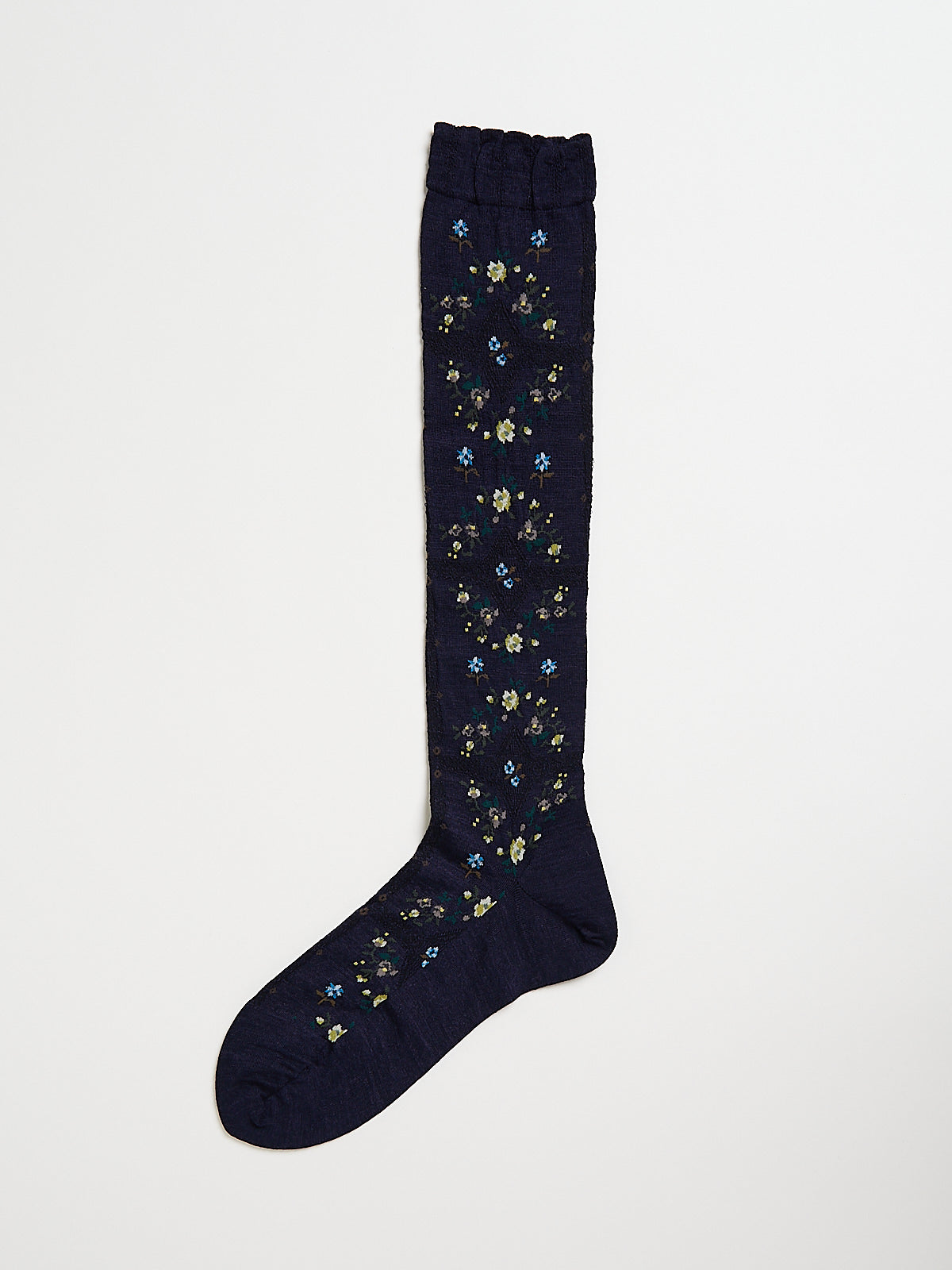 Knee-high socks in a navy wool blend with a rose motif. Features a ruched cuff.