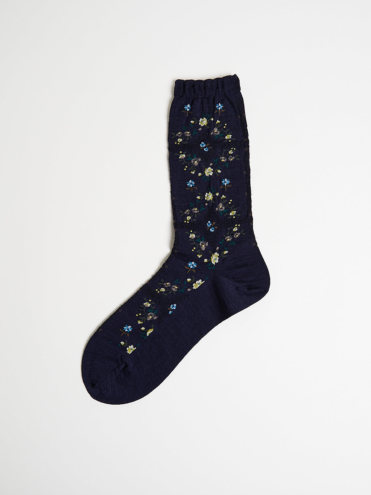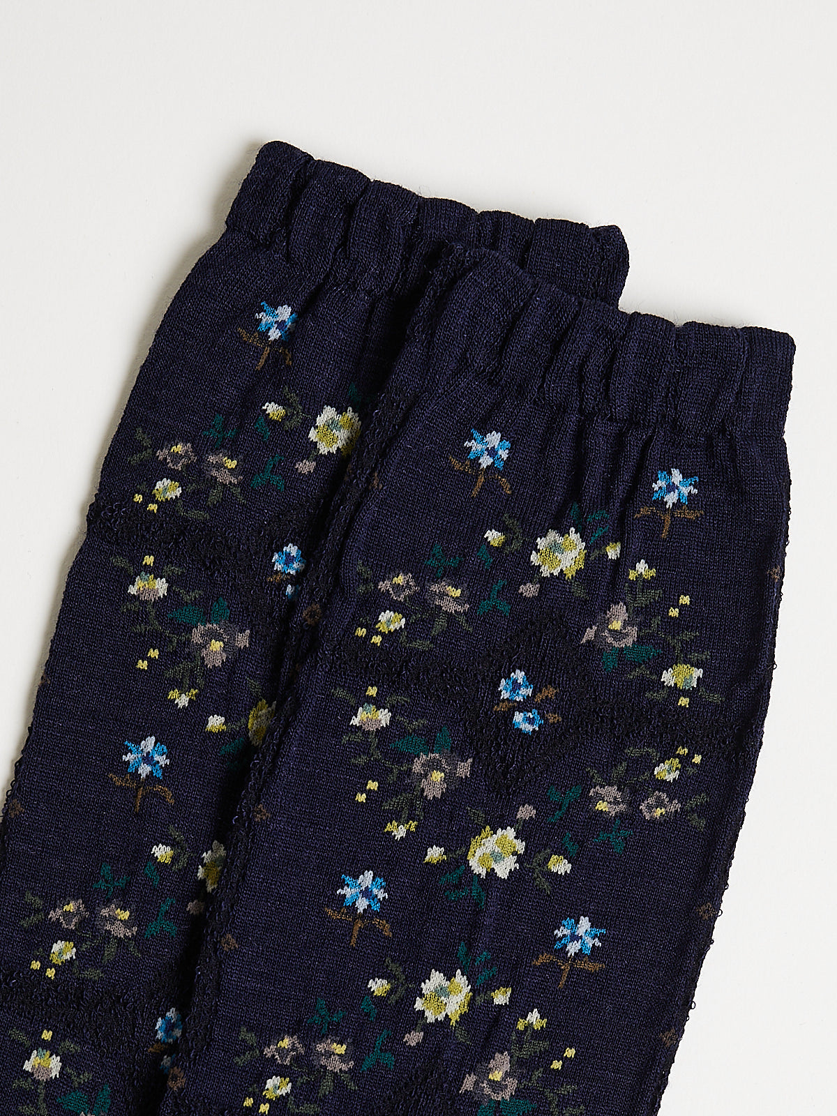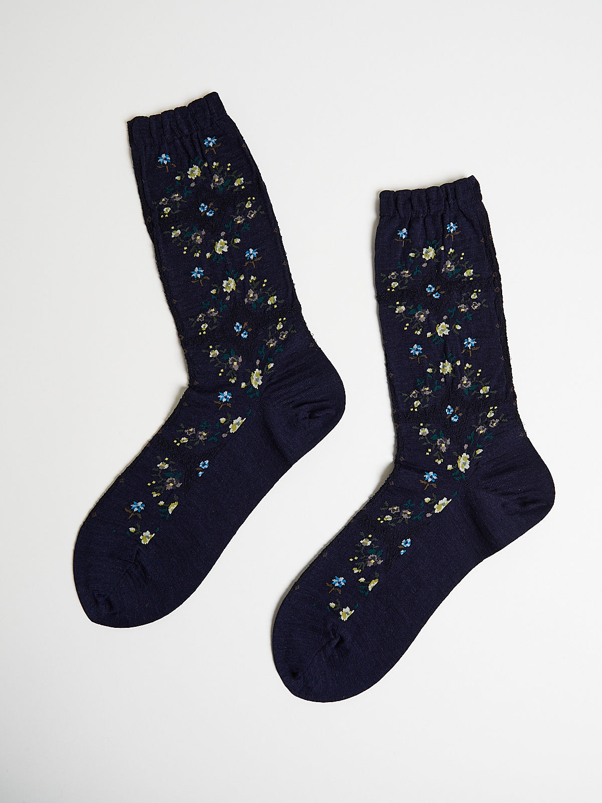 Crew socks in a navy wool blend with a rose motif. Features a ruched cuff.