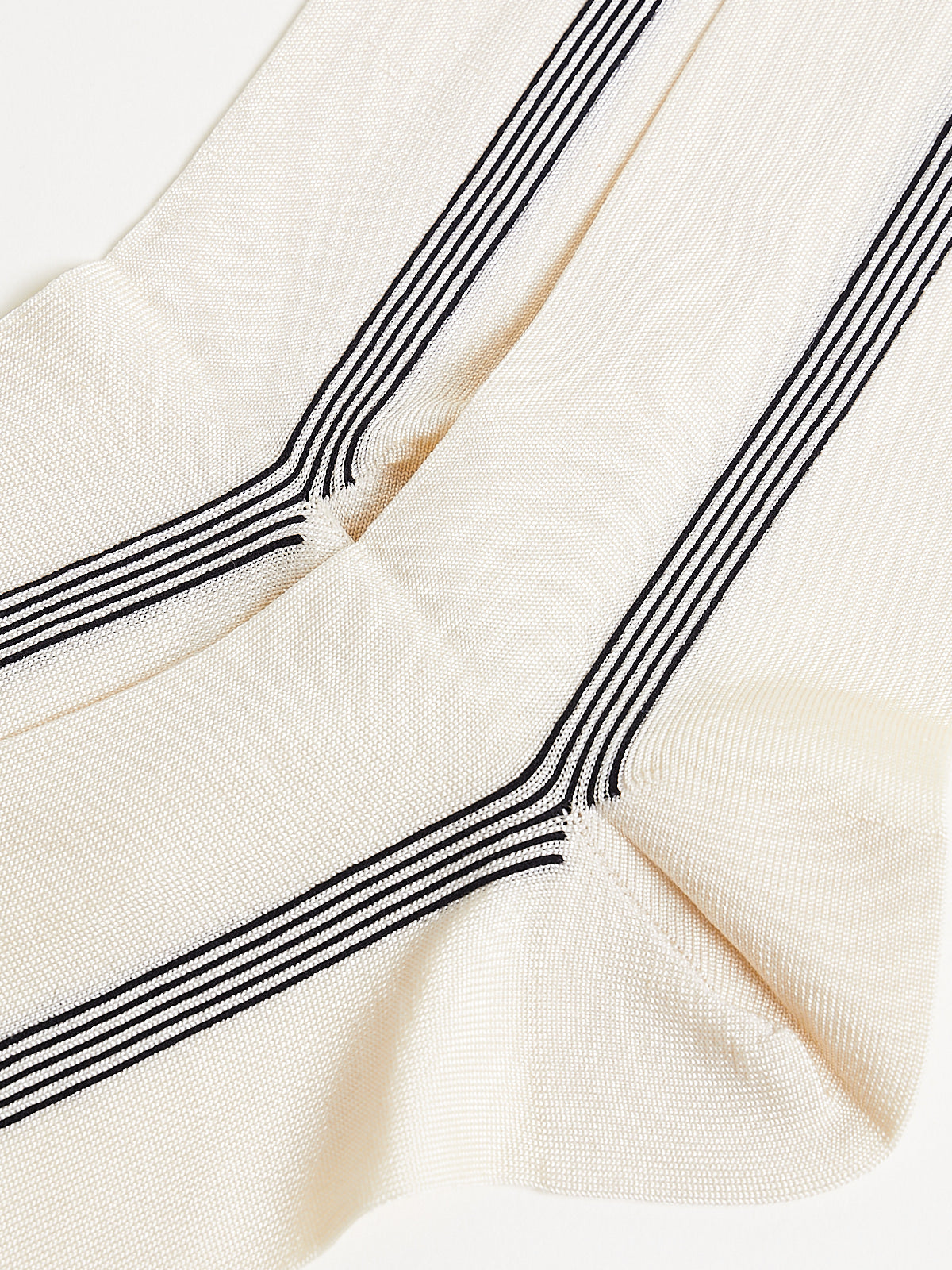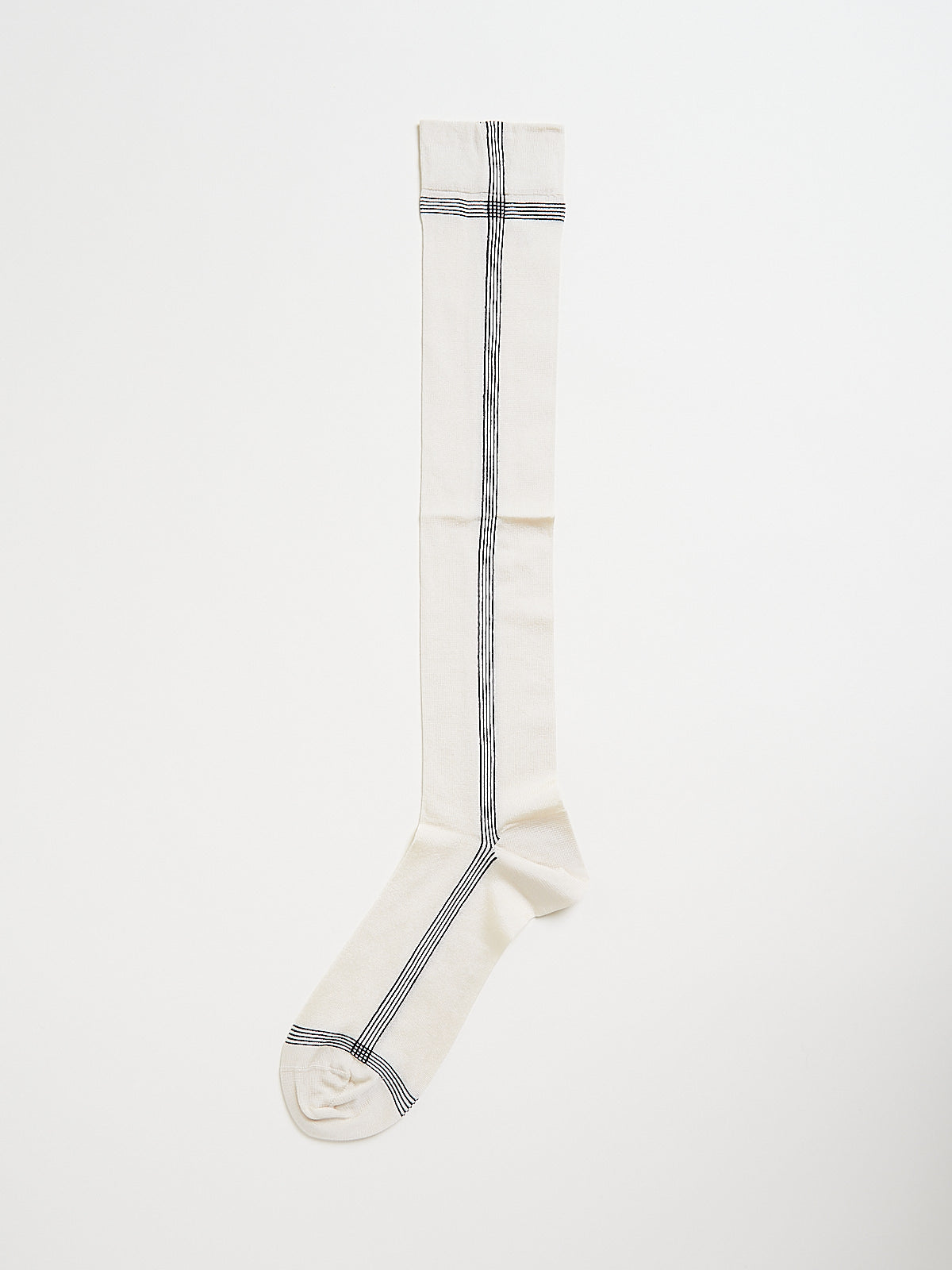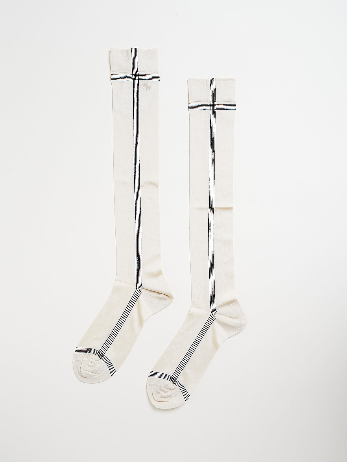 Knee-high socks in an ivory silk blend with a slight sheen. Features a stripe design and Antipast's signature bee motif on the leg.