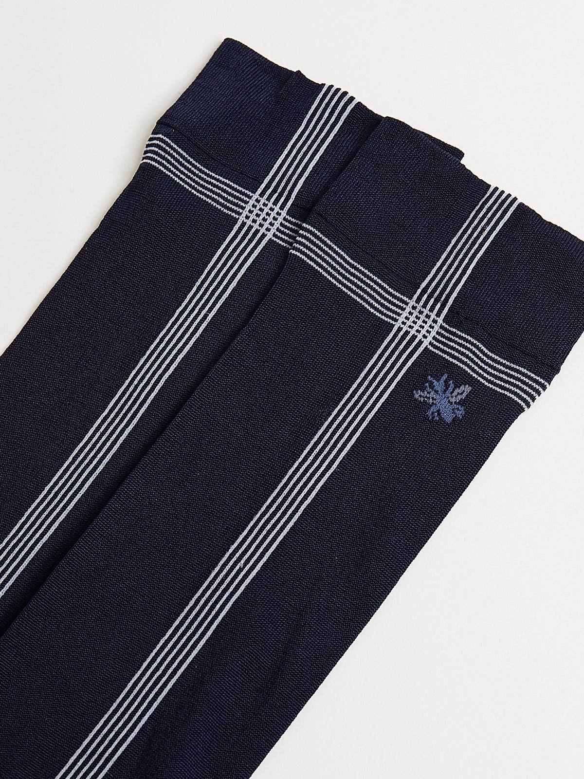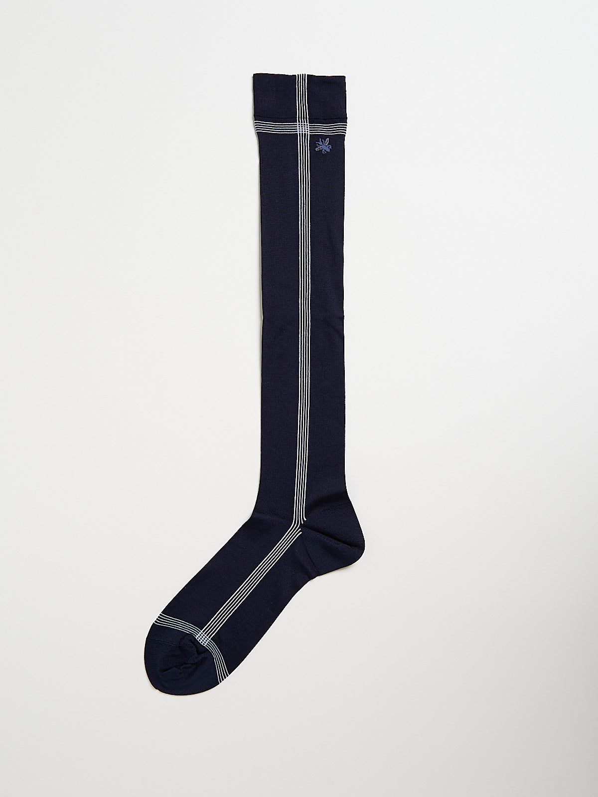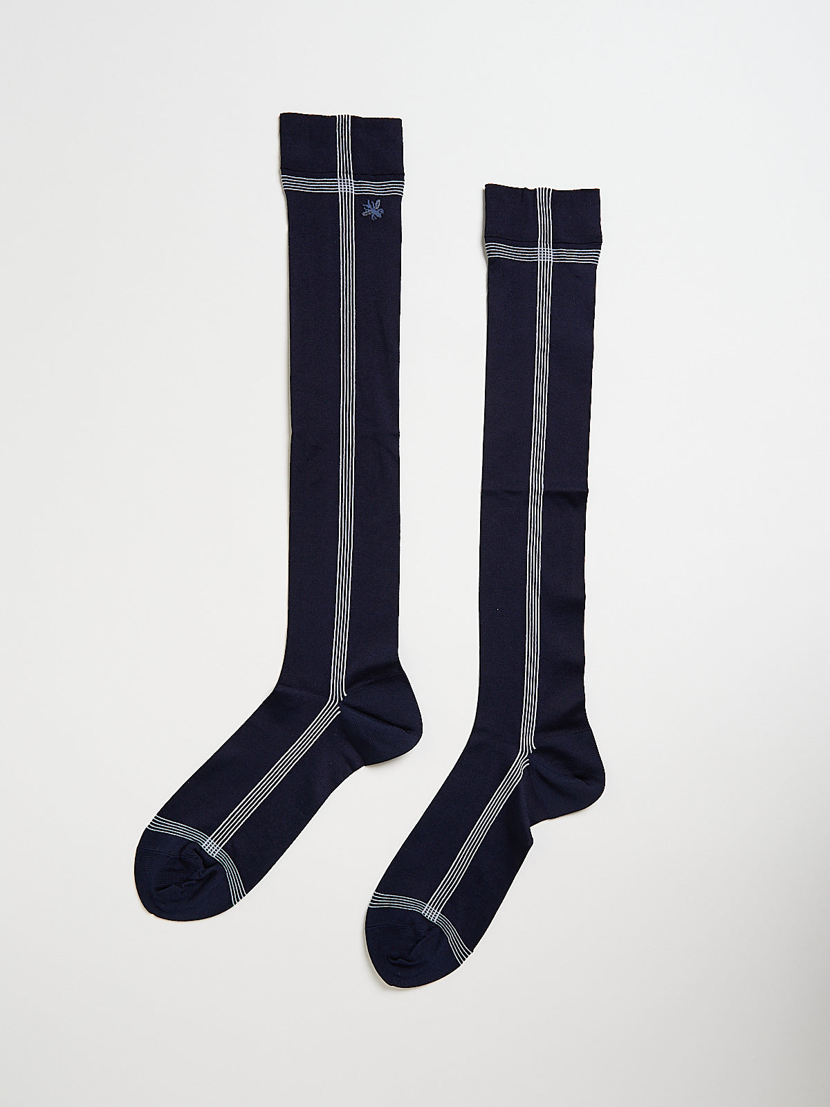 Knee-high socks in a navy silk blend with a slight sheen. Features a stripe design and Antipast's signature bee motif on the leg.