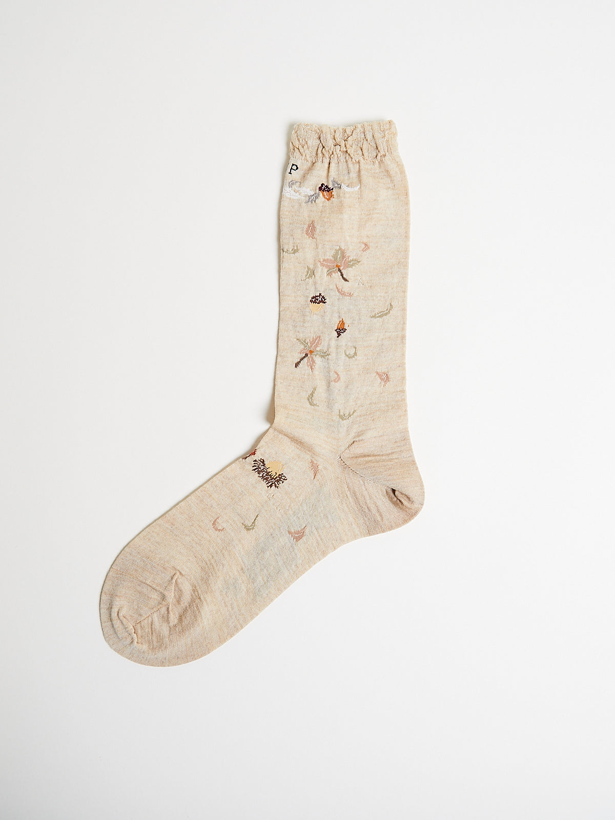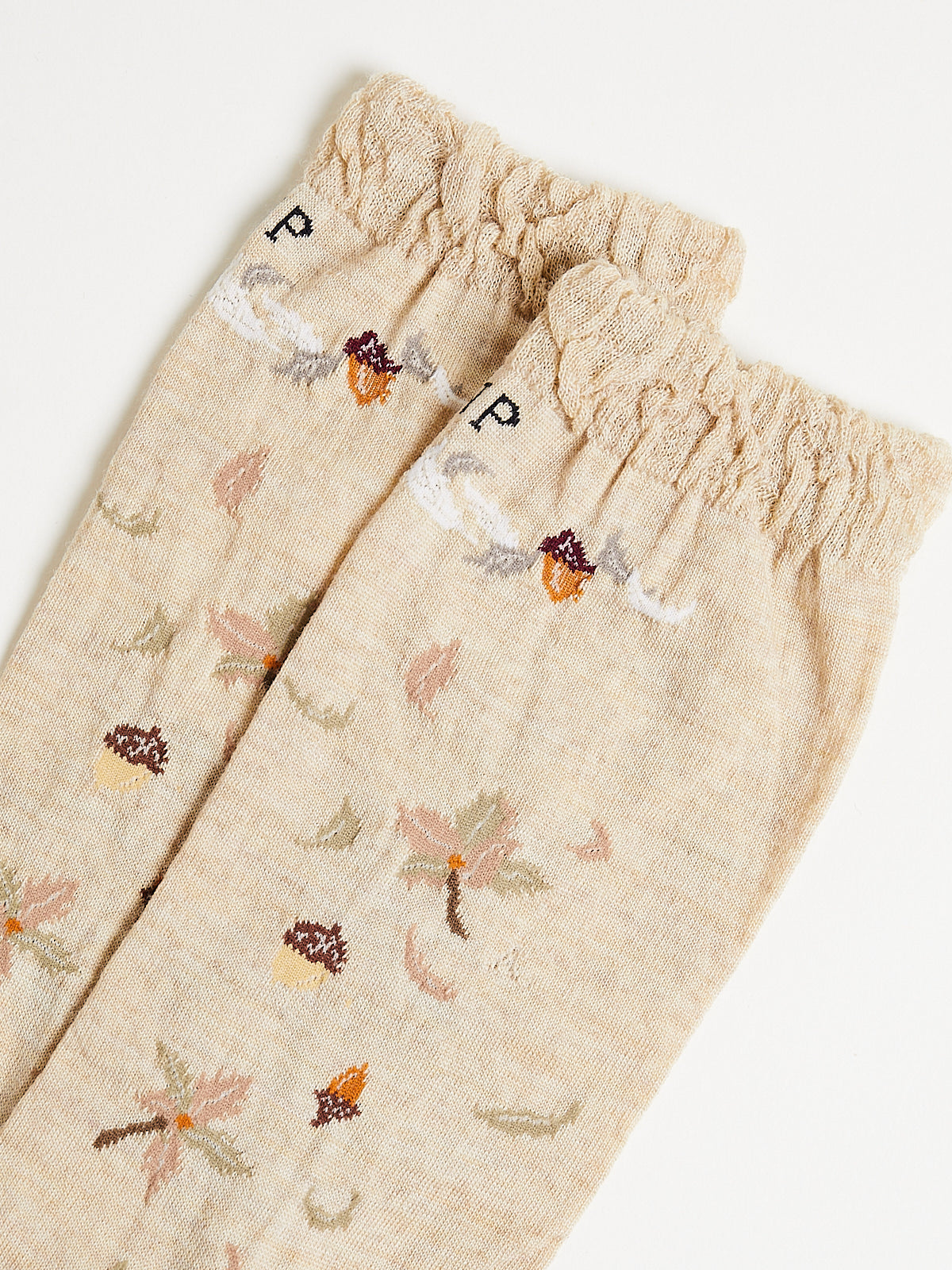 Crew socks in a beige wool blend with a windy acorn tree motif. Features a ruched cuff.