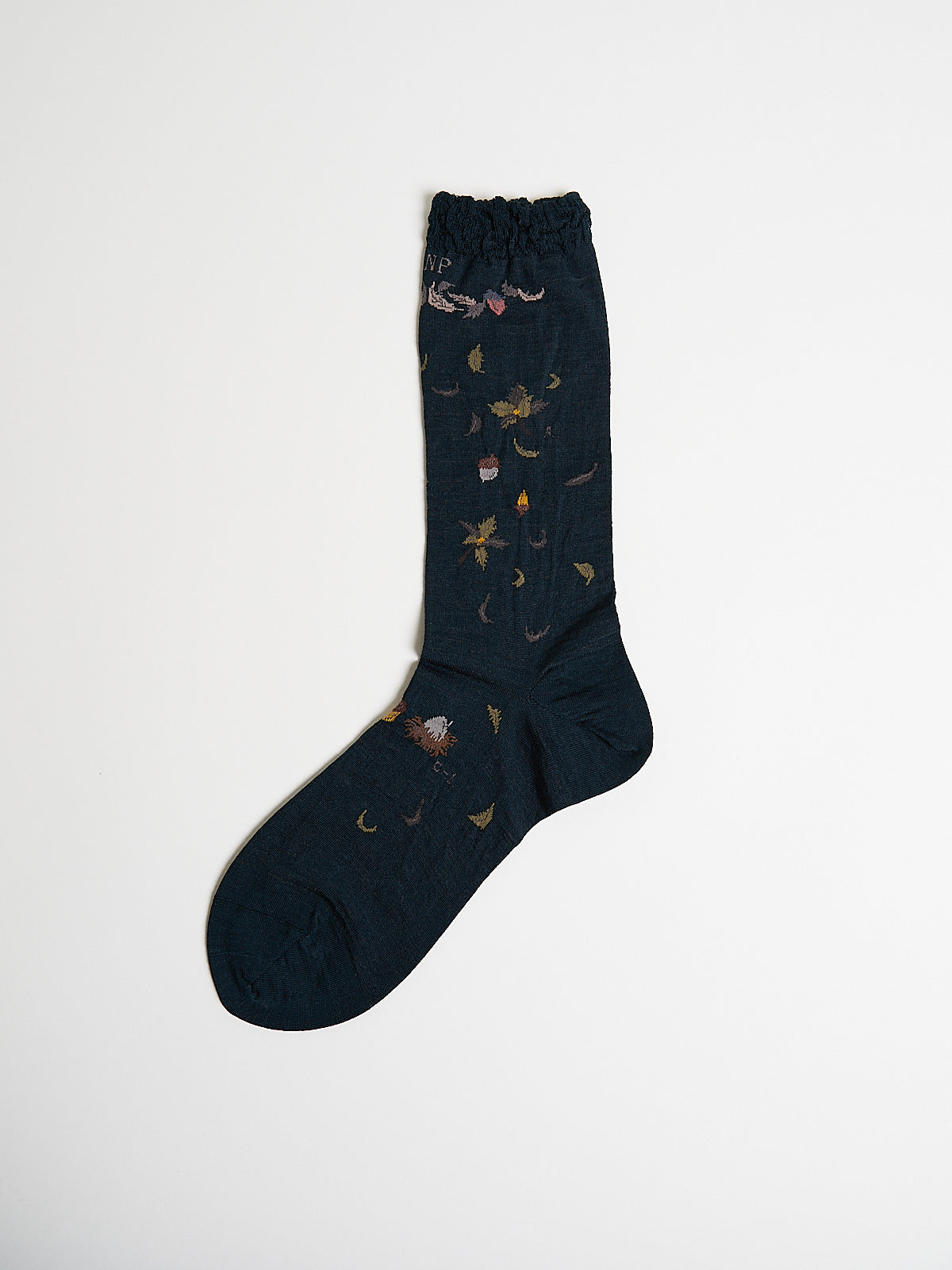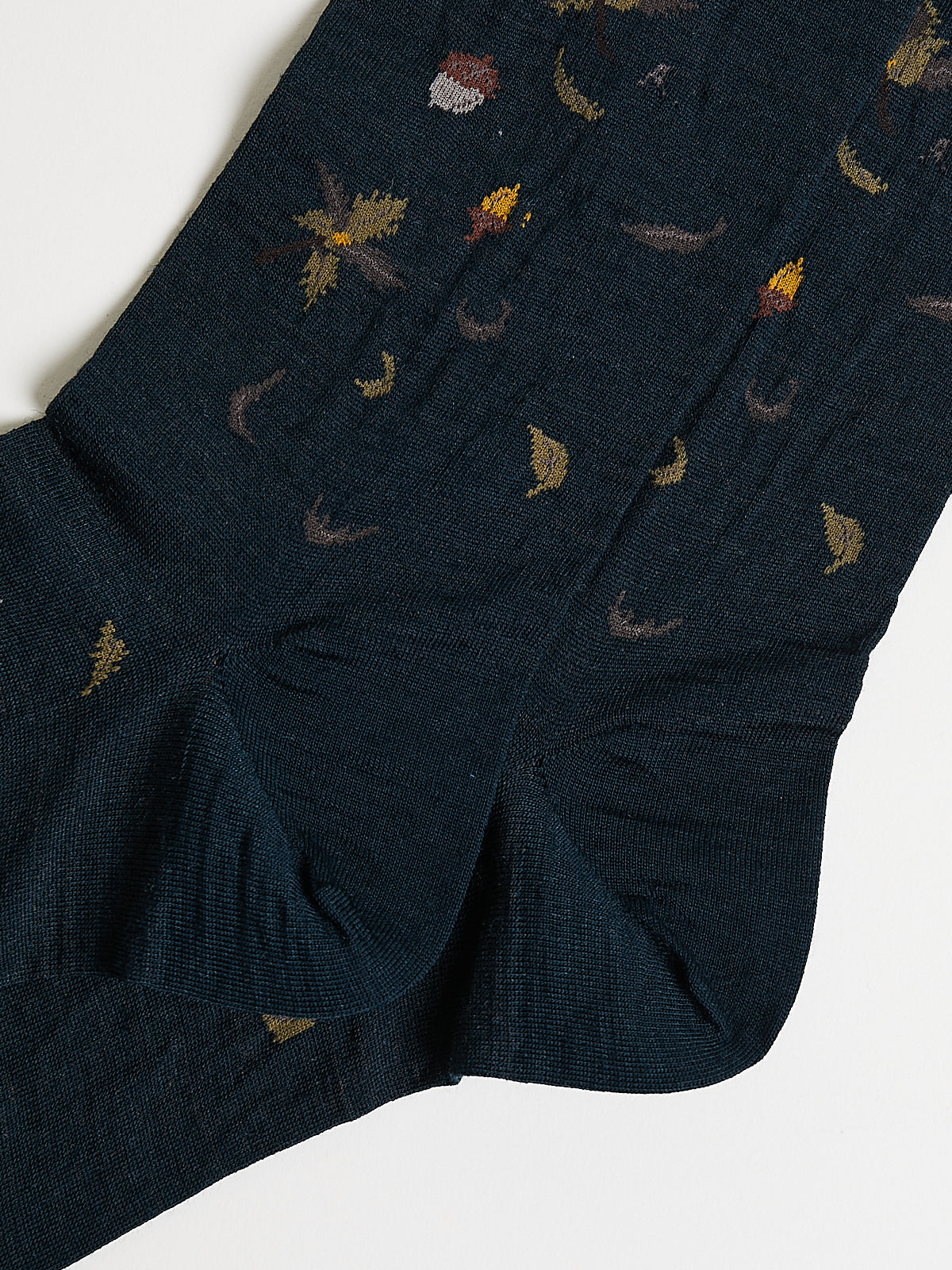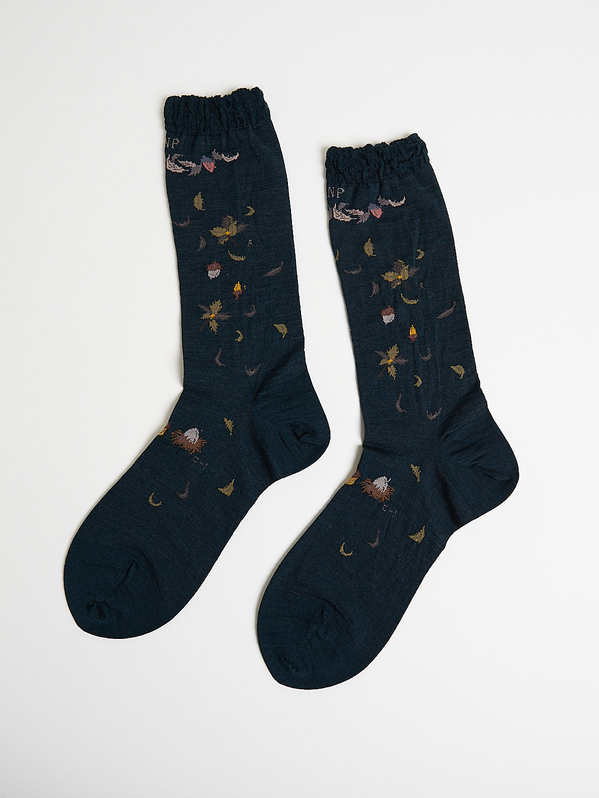 Crew socks in a dark green wool blend with a windy acorn tree motif. Features a ruched cuff.