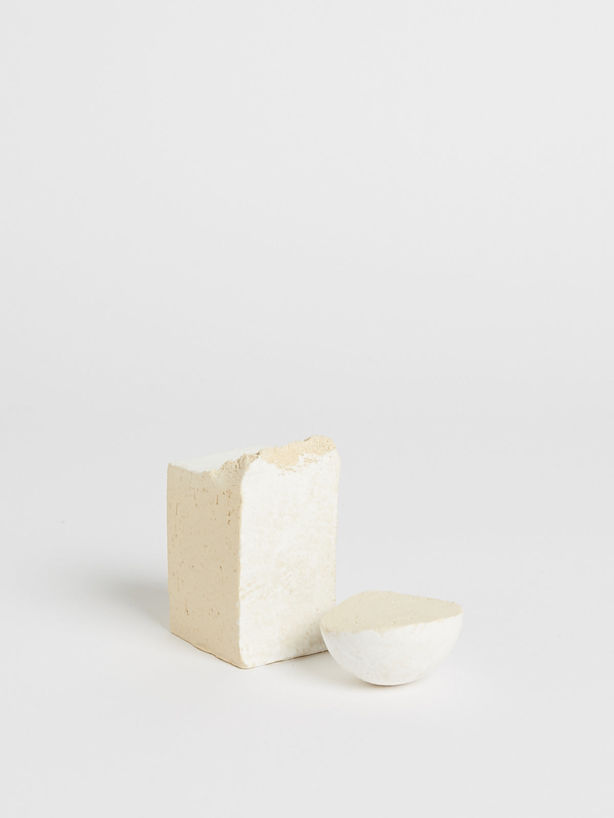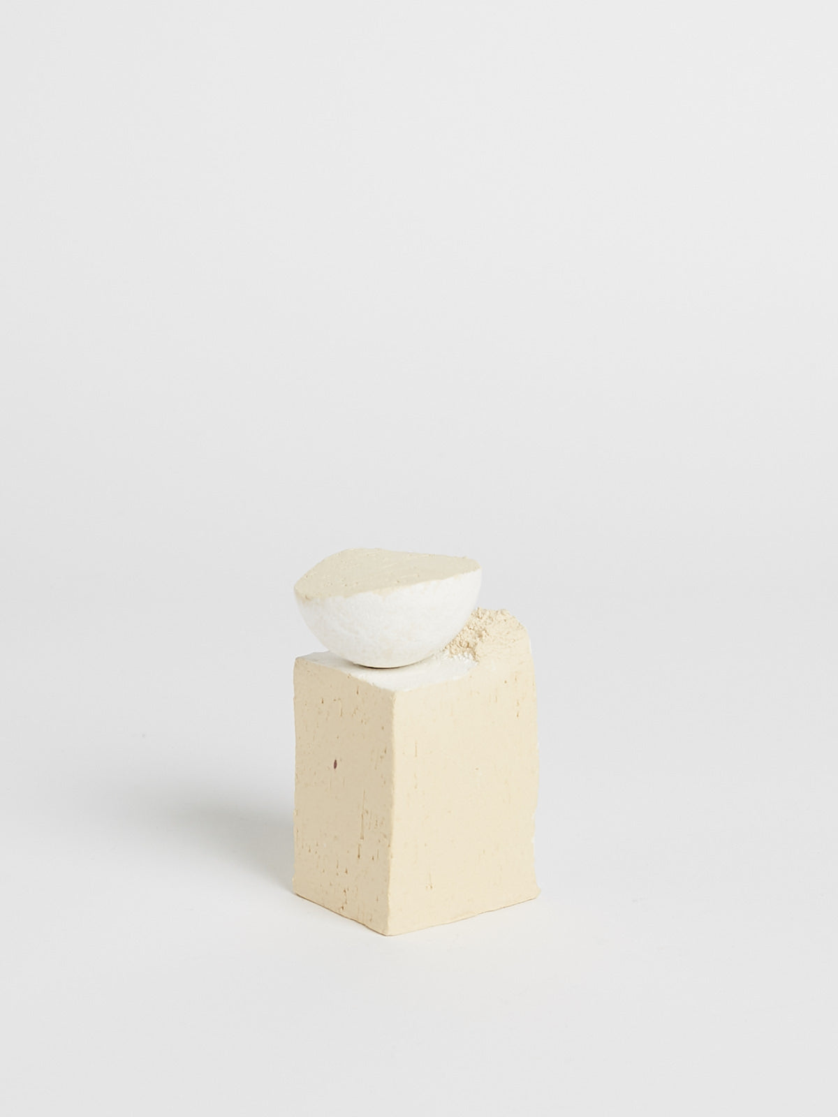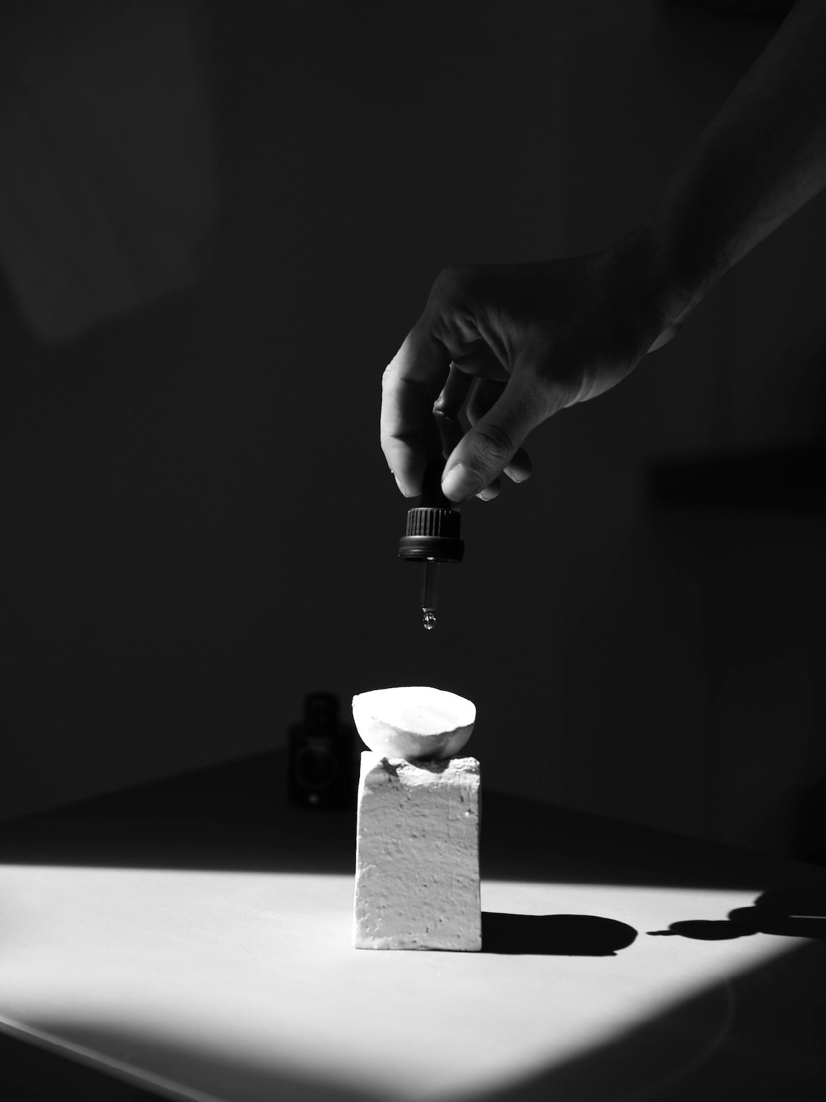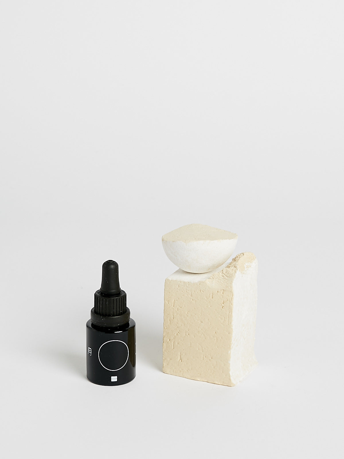 Hakudo moon diffuser set comes with a 15ml bottle of botanical essence and two ceramic objects, a half circle and a pillar. The organically contoured ceramic objects have raw surfaces, where it's ideal to drip the essence. Other facets are glazed in matte white.