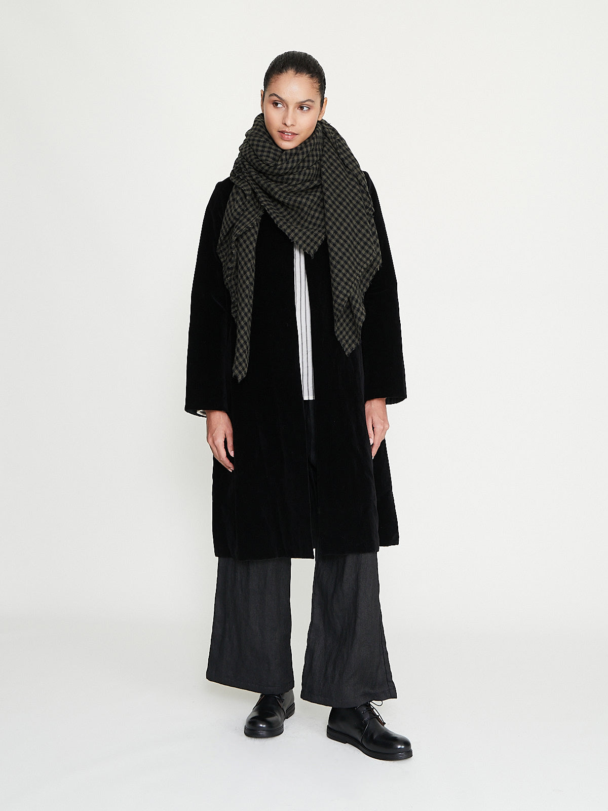 Large square scarf in checked khaki/black cashmere. Features frayed edges.
