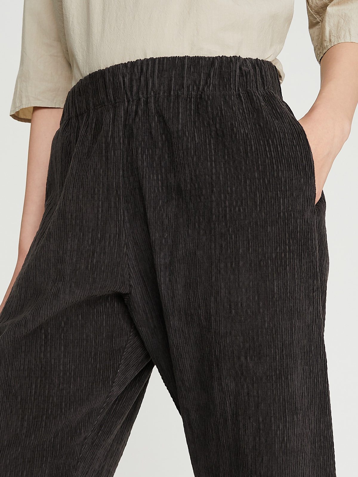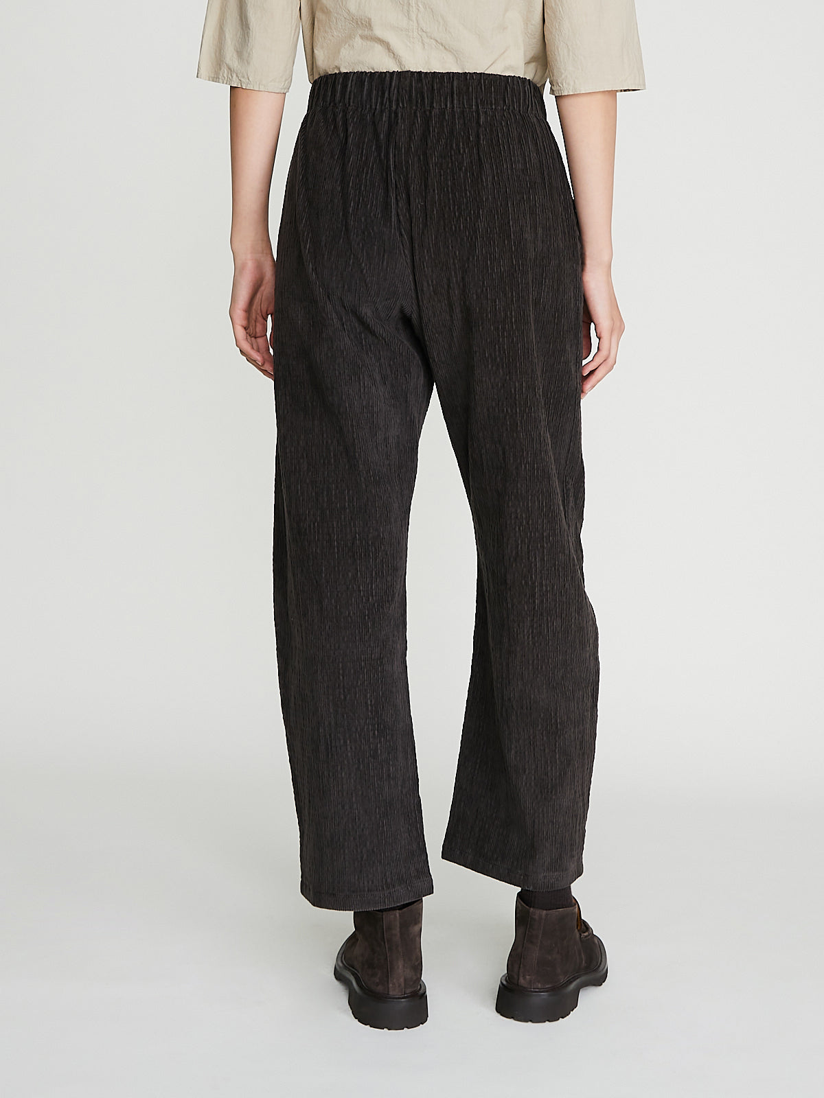 Relaxed cropped trouser in brown cotton corduroy with a subtle stretch. Pull-on style with an elasticated waistband and side seam pockets. Slightly curved legs.