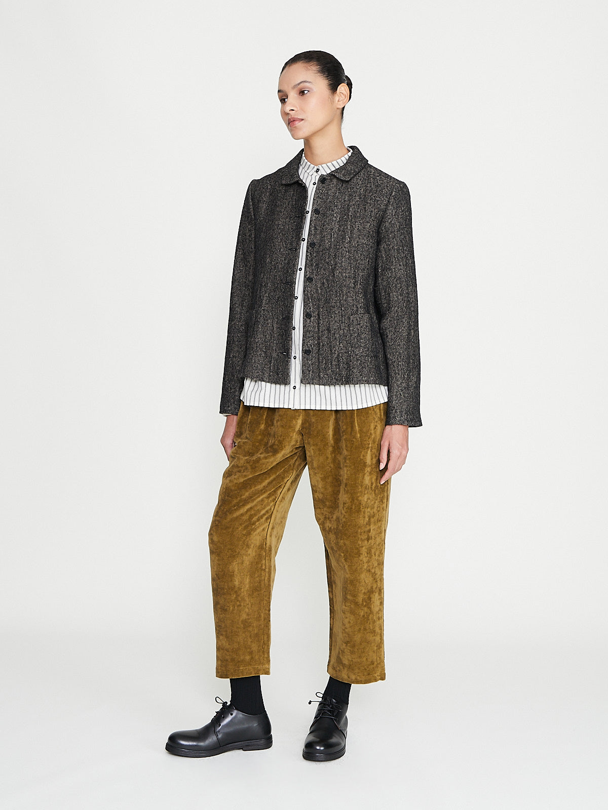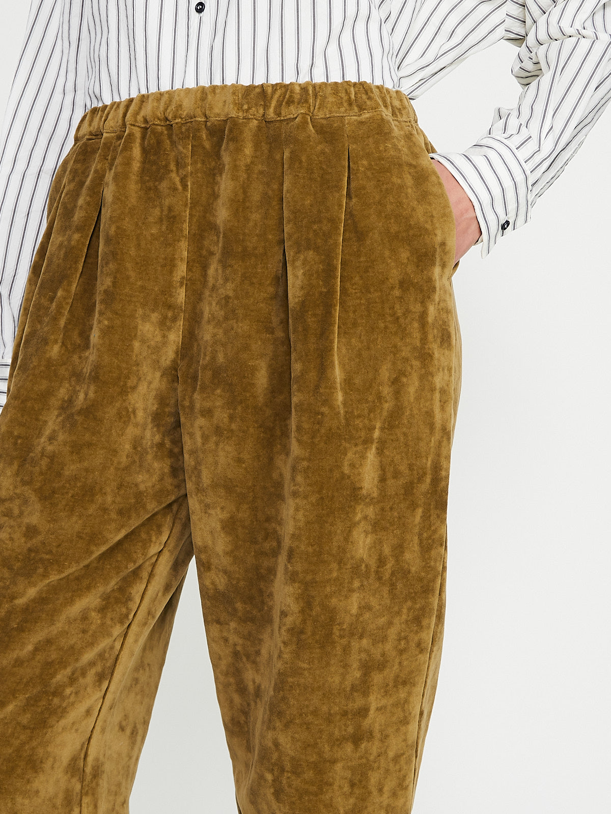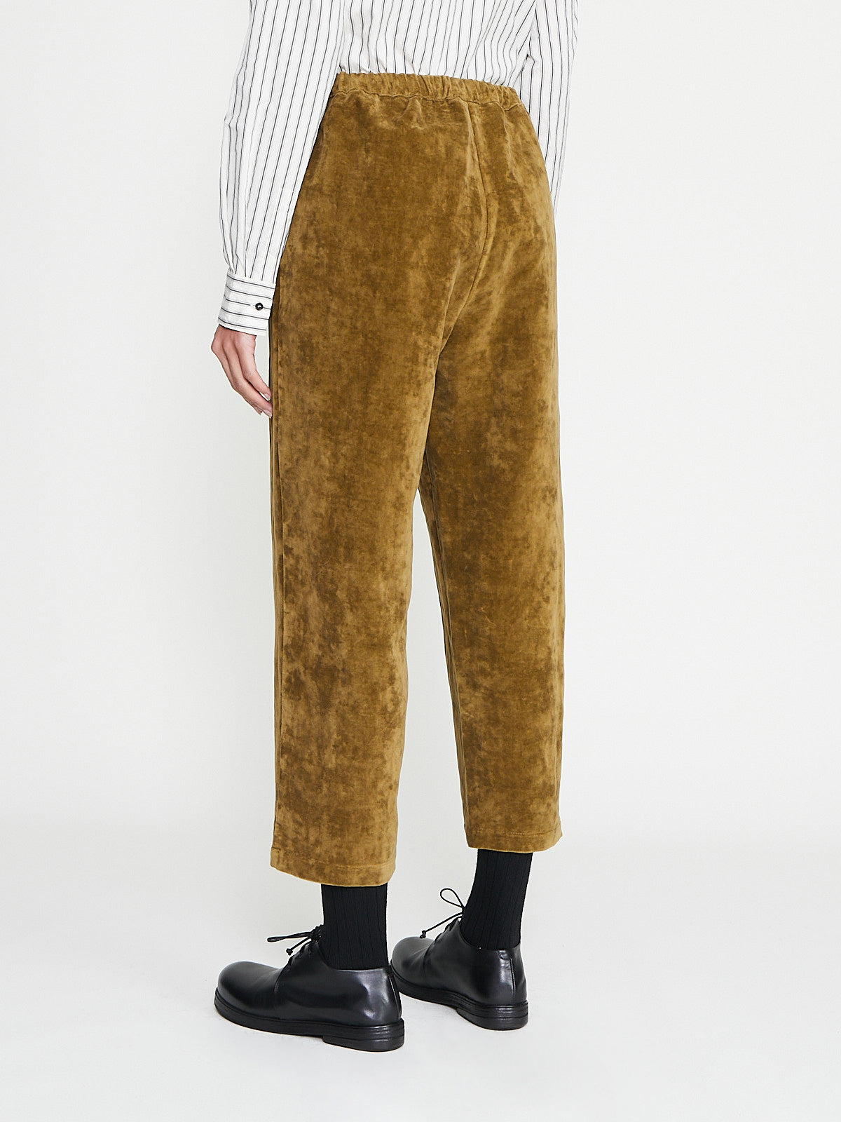 Cropped trouser in a mustard cotton/linen velvet. Pull-on style with an elasticated waistband and pleats on the front. Side seam pockets. Legs slightly taper at the cuffs.