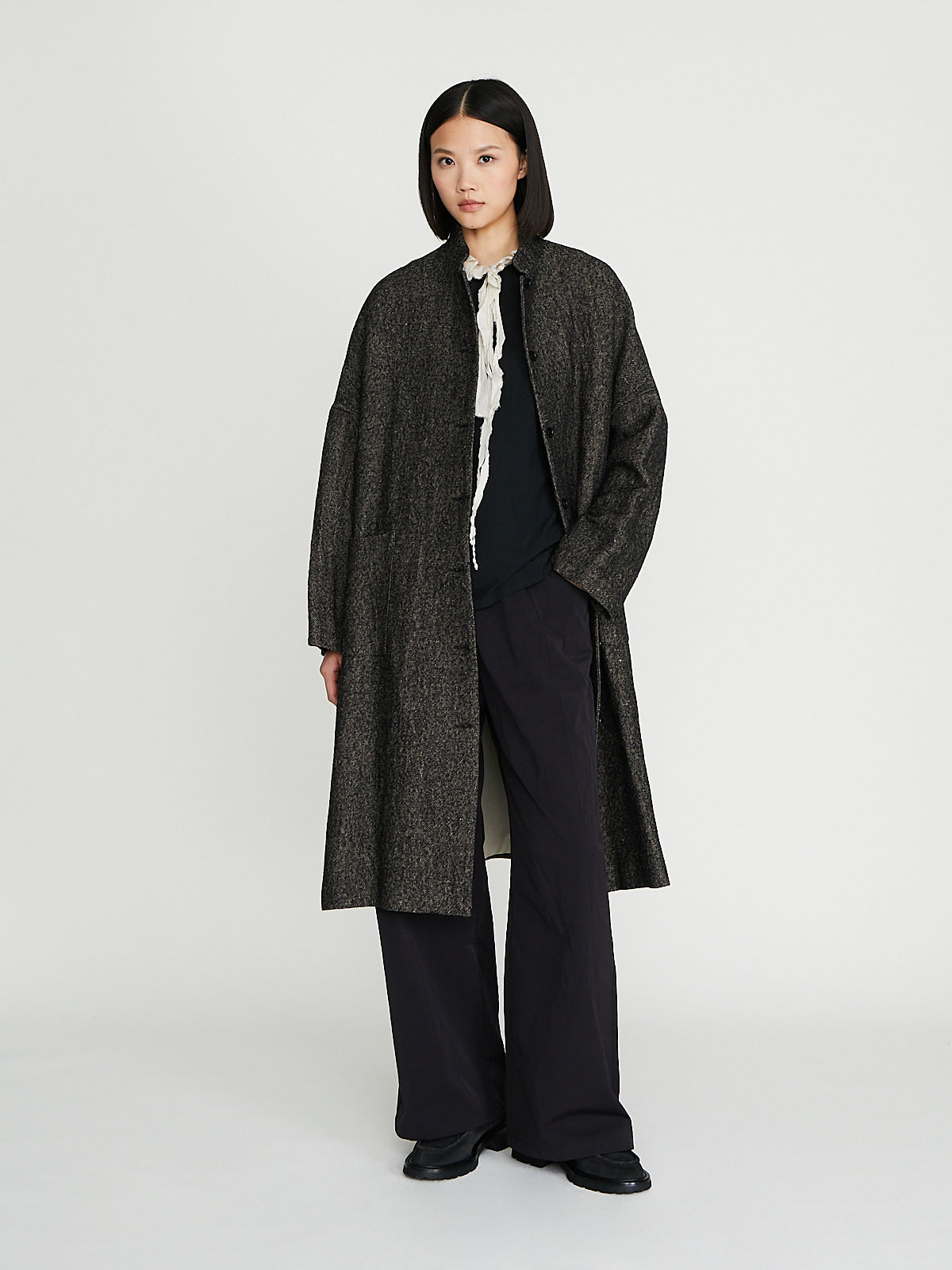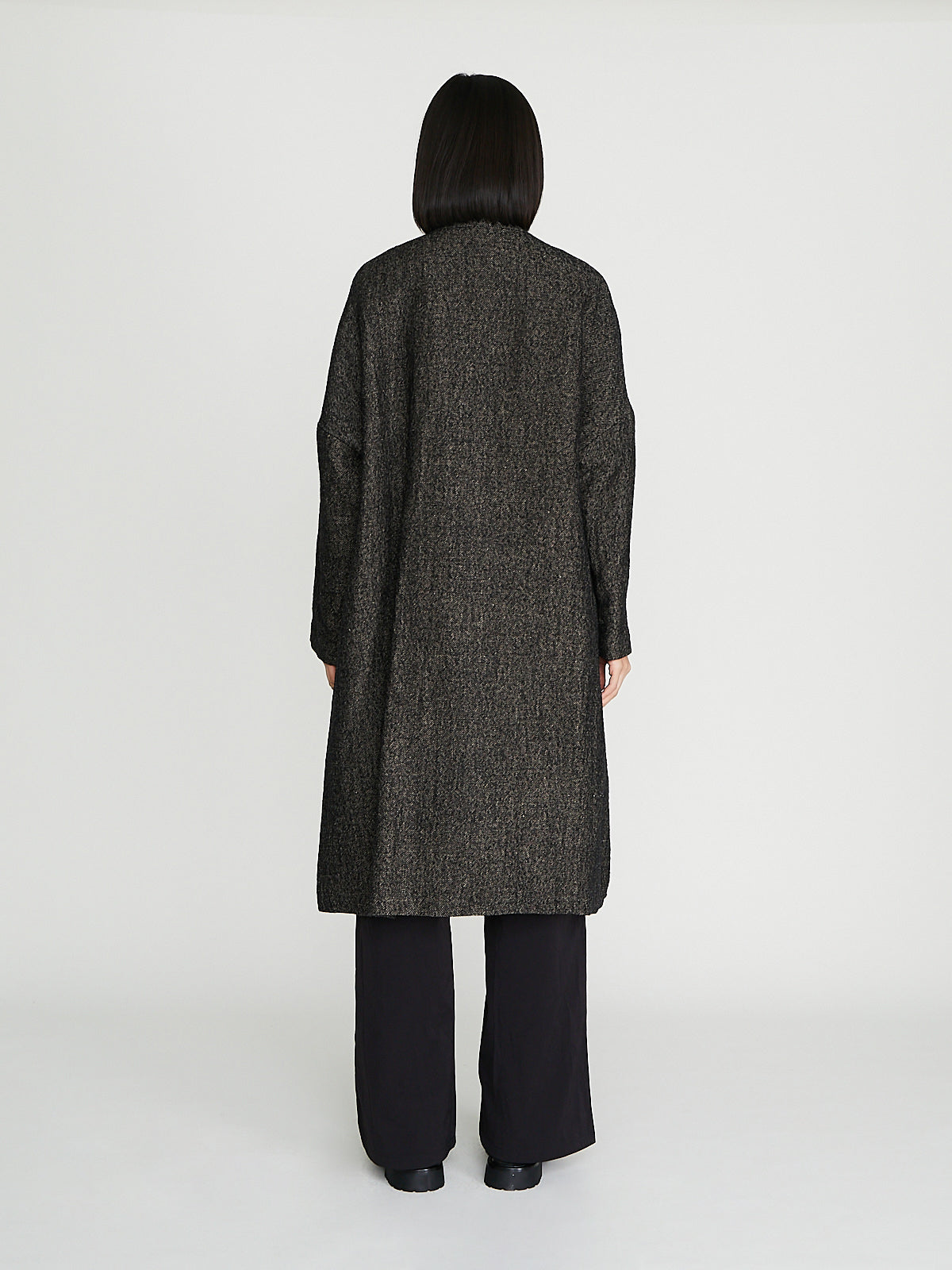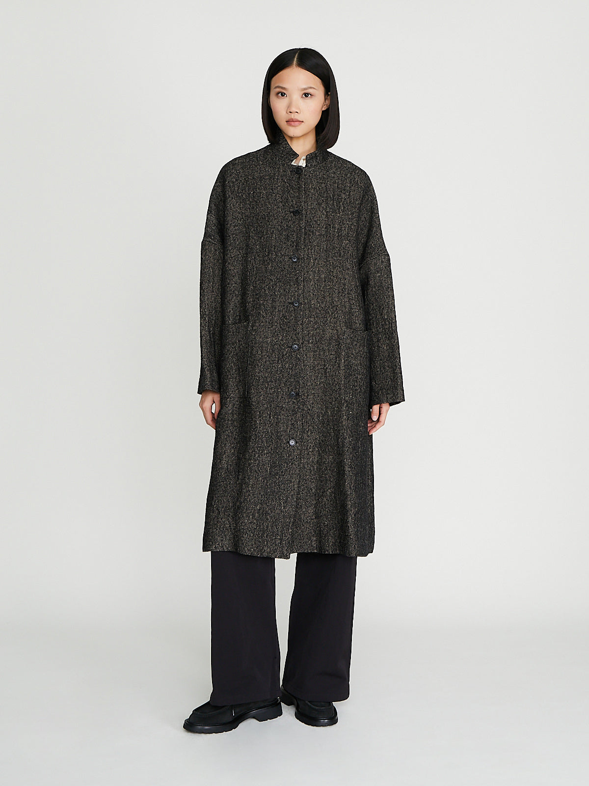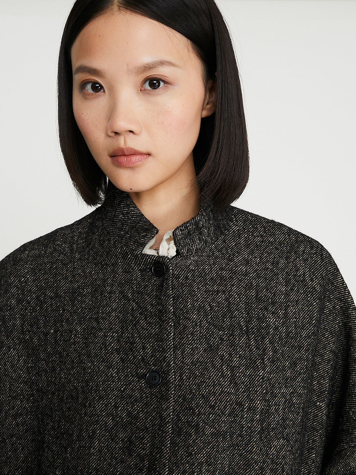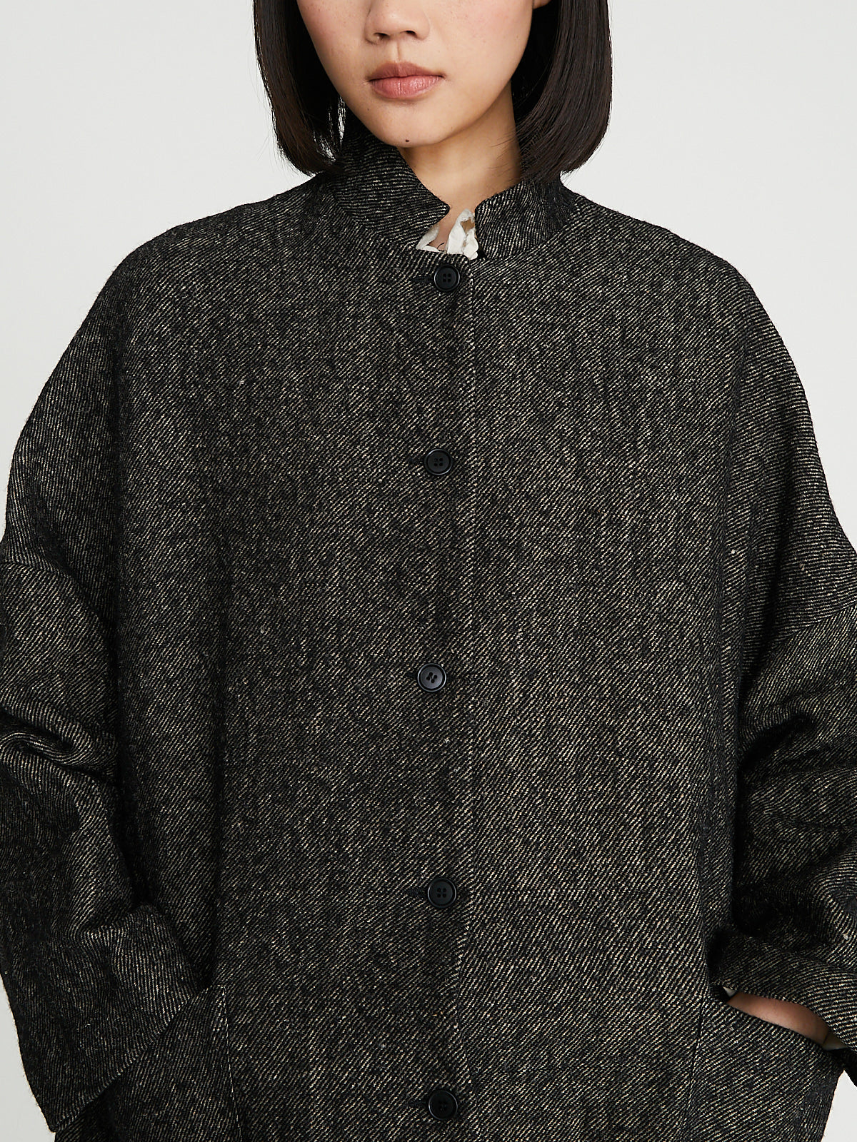 Oversized coat in a black heavy hemp/virgin wool twill. Stand collar, front button fastening and long sleeves with an exaggerated dropped shoulder. Patch pockets on the front. Subtle a-line silhouette.