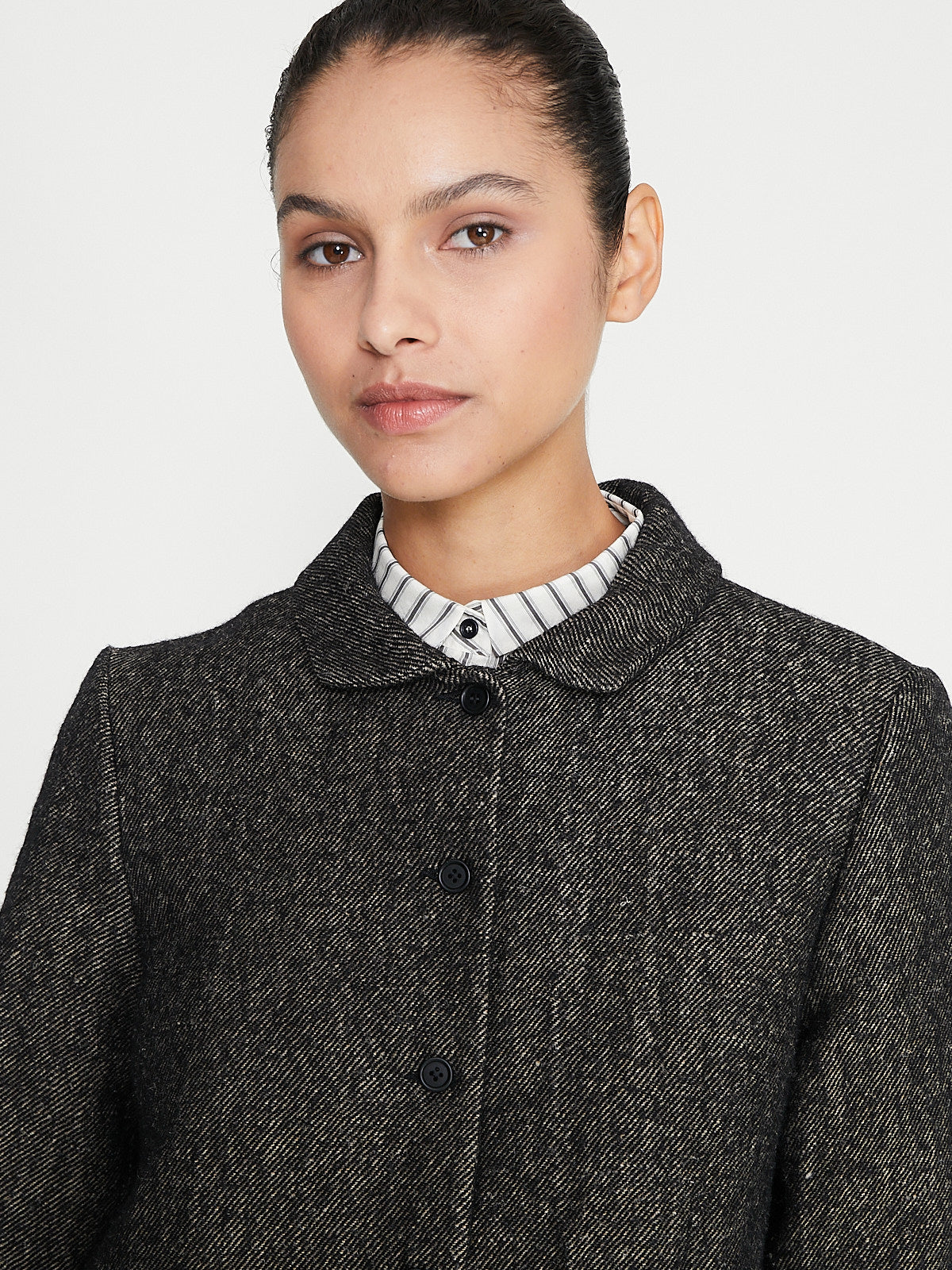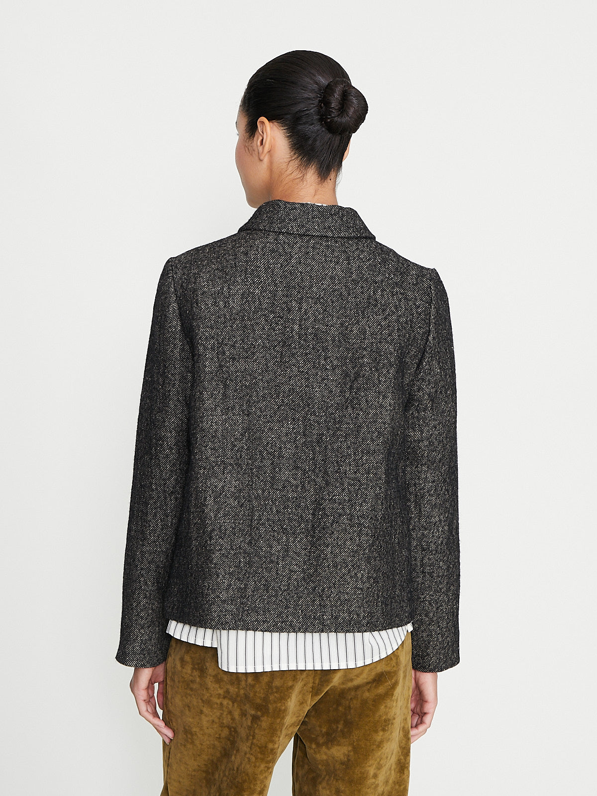 Structured jacket in a heavy black wool/hemp twill. Spread collar, front 6-button fastening and long sleeves with a structured shoulder. Patch pockets on the front. Straight cut.