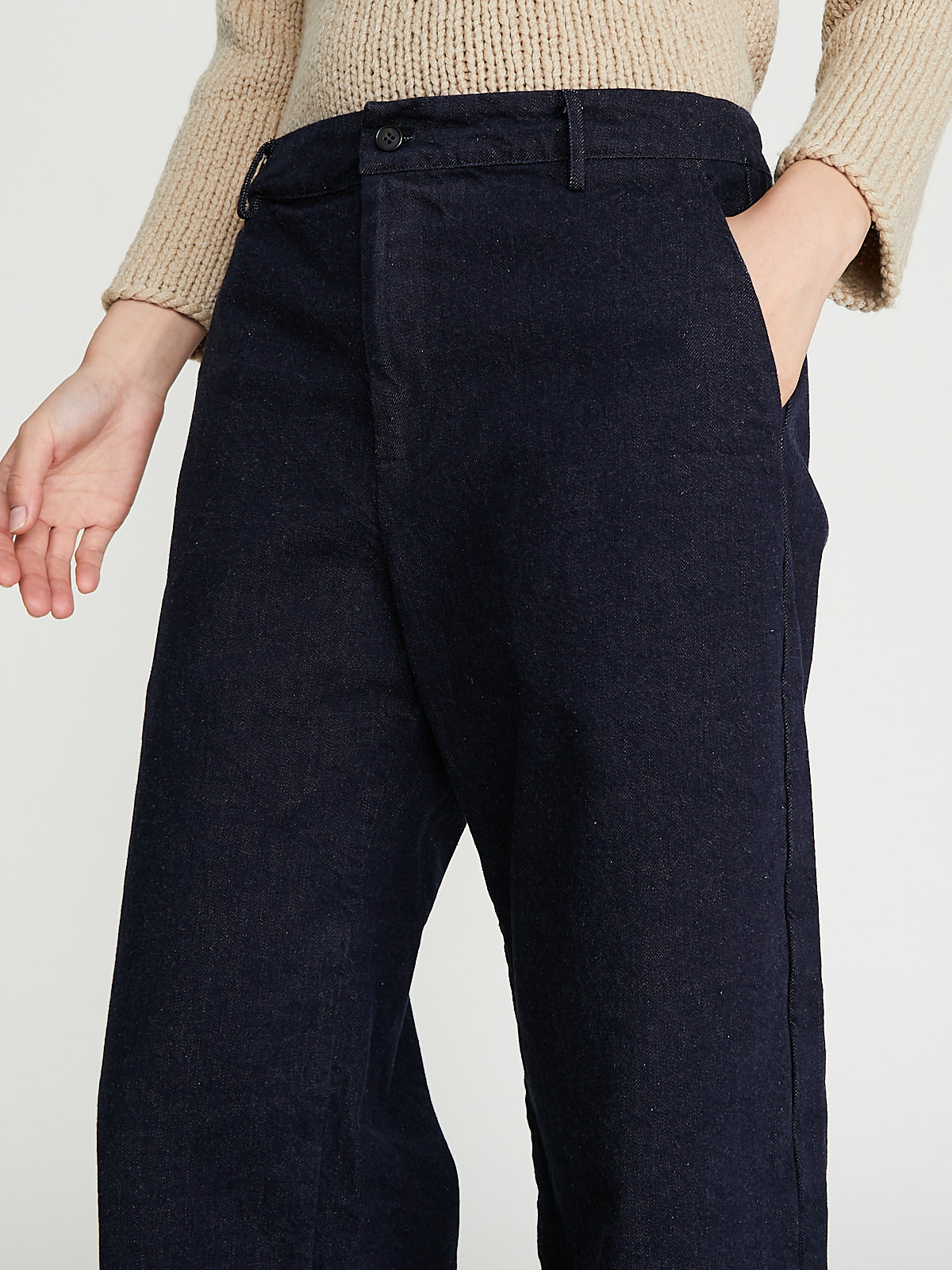 Wide-leg trouser in Japanese indigo cotton denim. Belt loops, single button and zip fly fastening. Slash pockets on the front and one welted pocket on the back. Barrel leg.