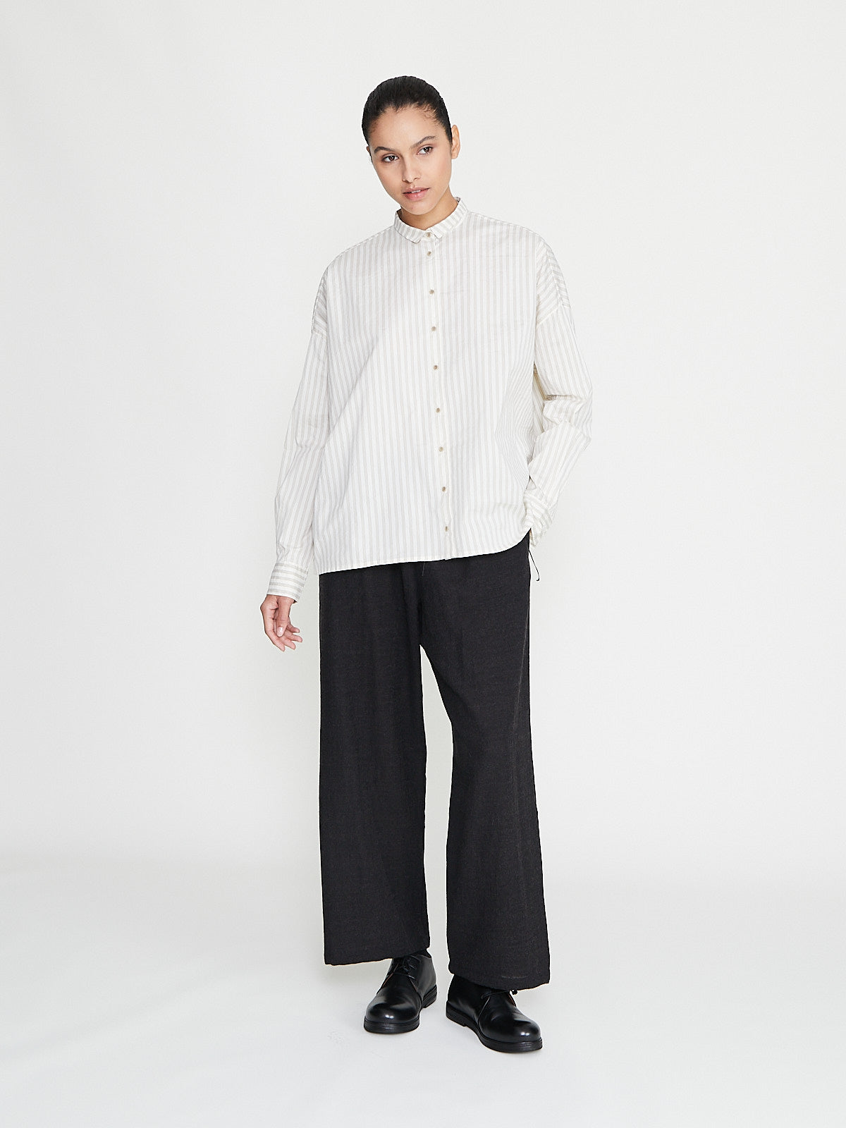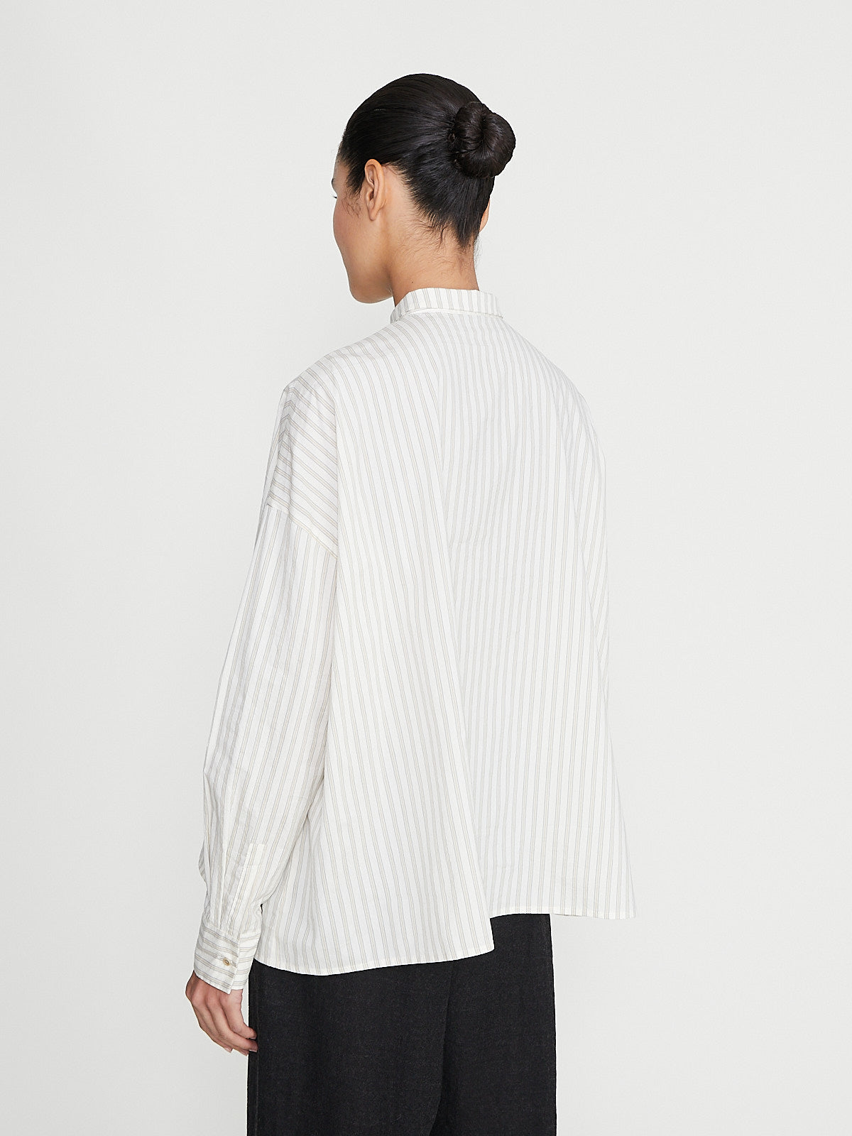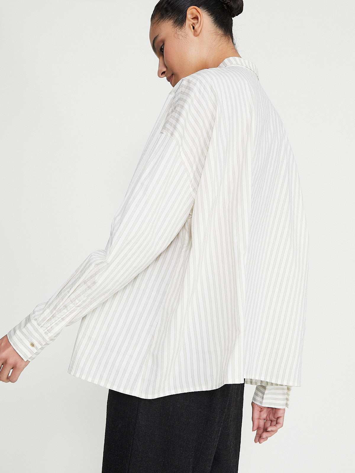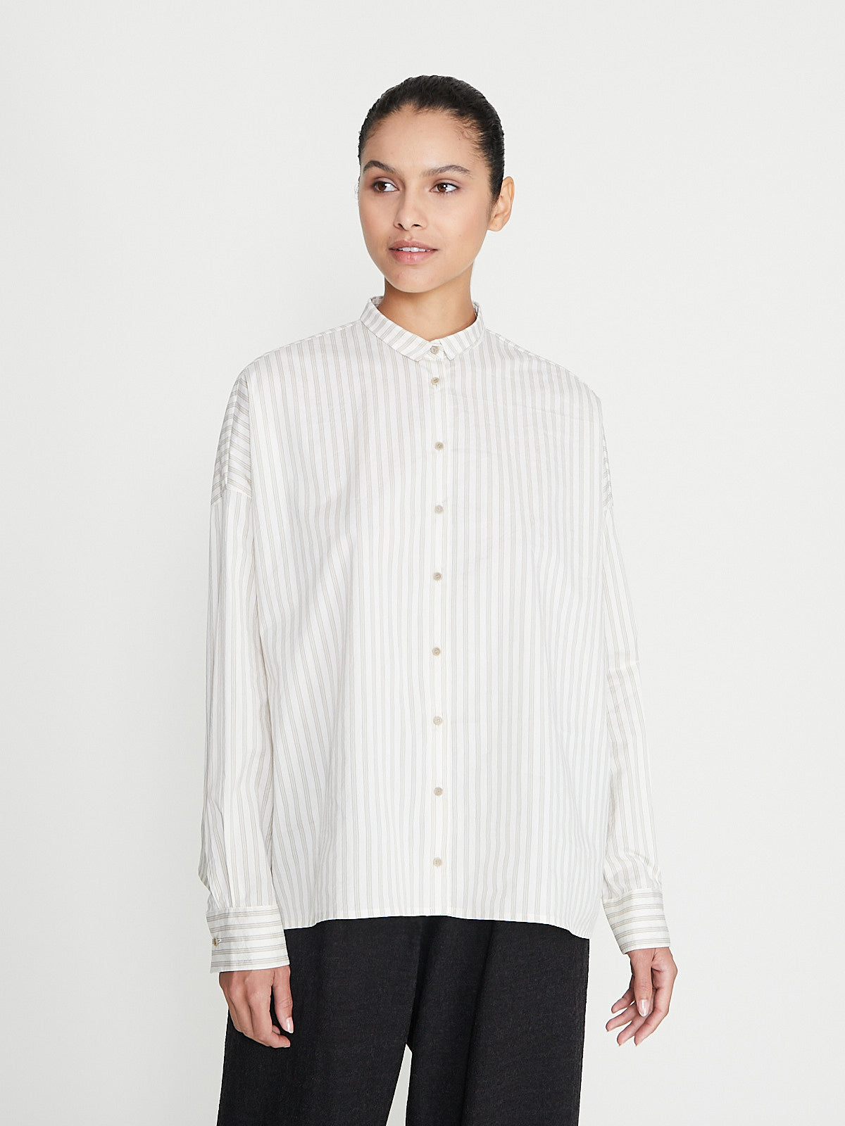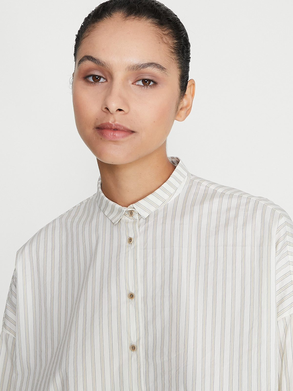 Oversized shirt in natural cotton/silk with beige stripes. Small shirt collar, front button fastening and long sleeves with a dropped shoulder and buttoned cuffs. Boxy fit.