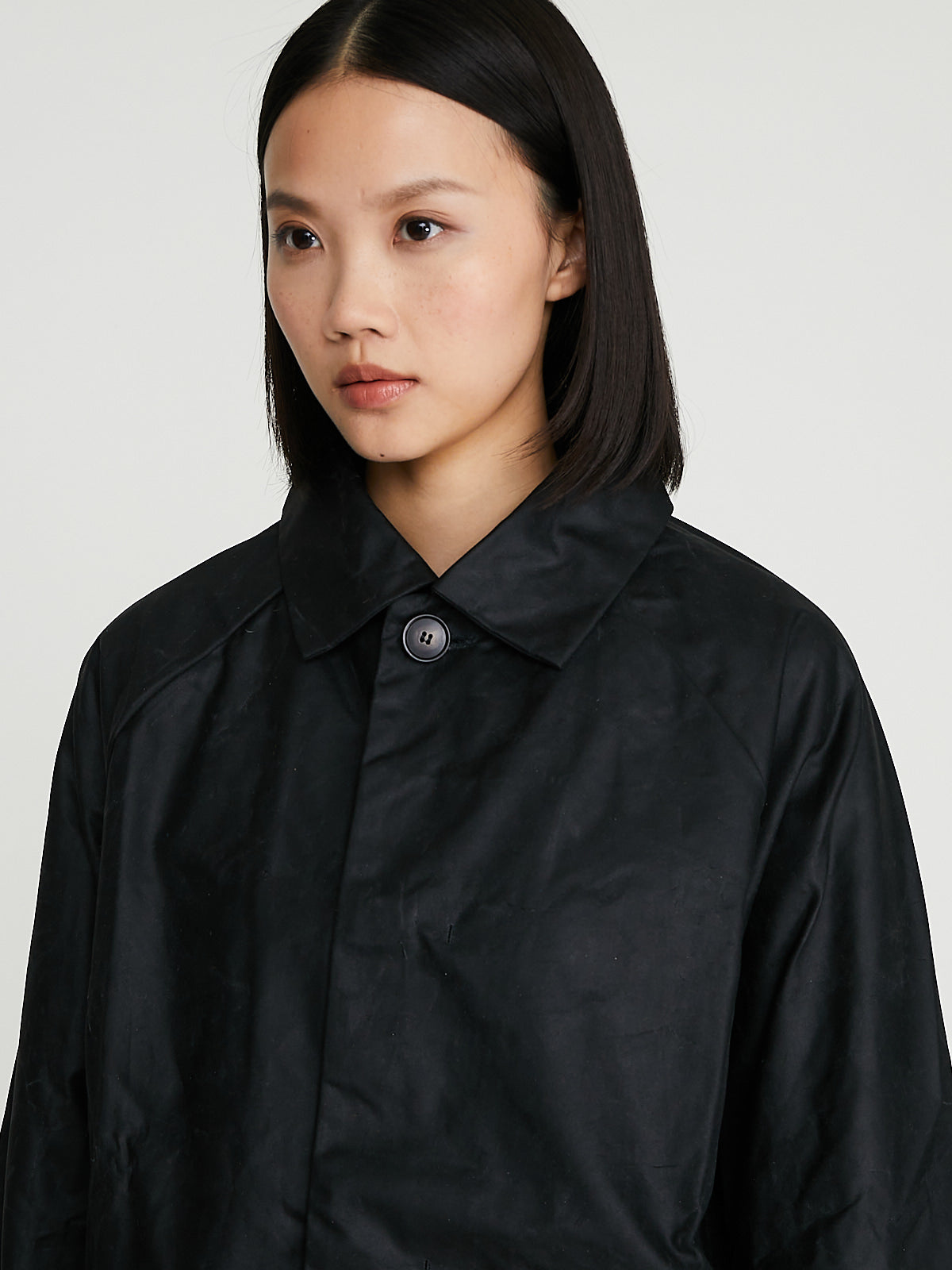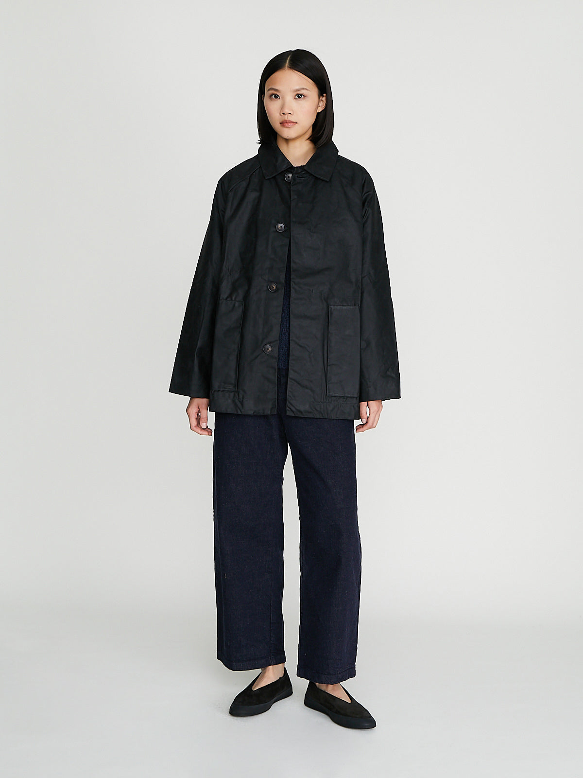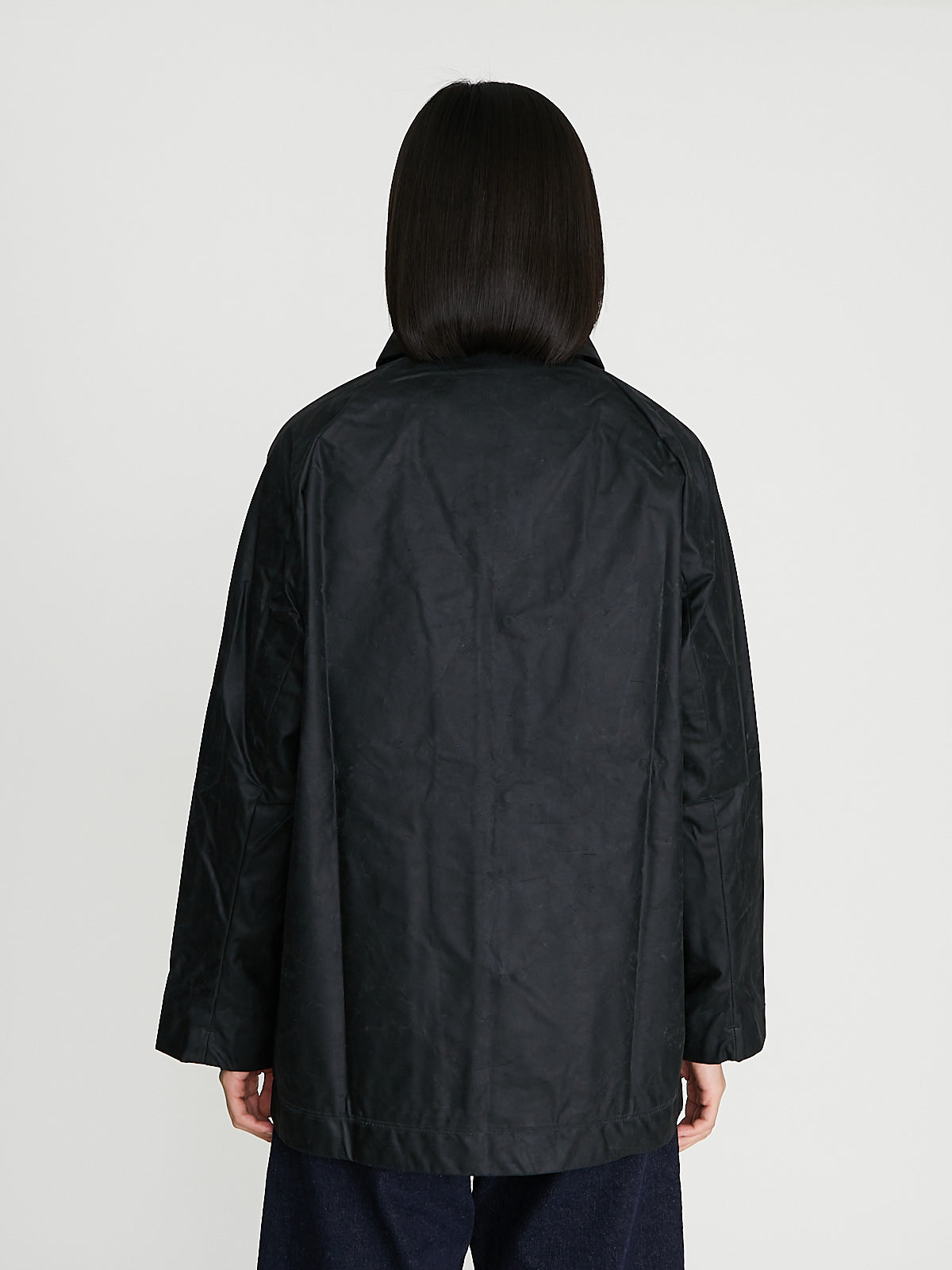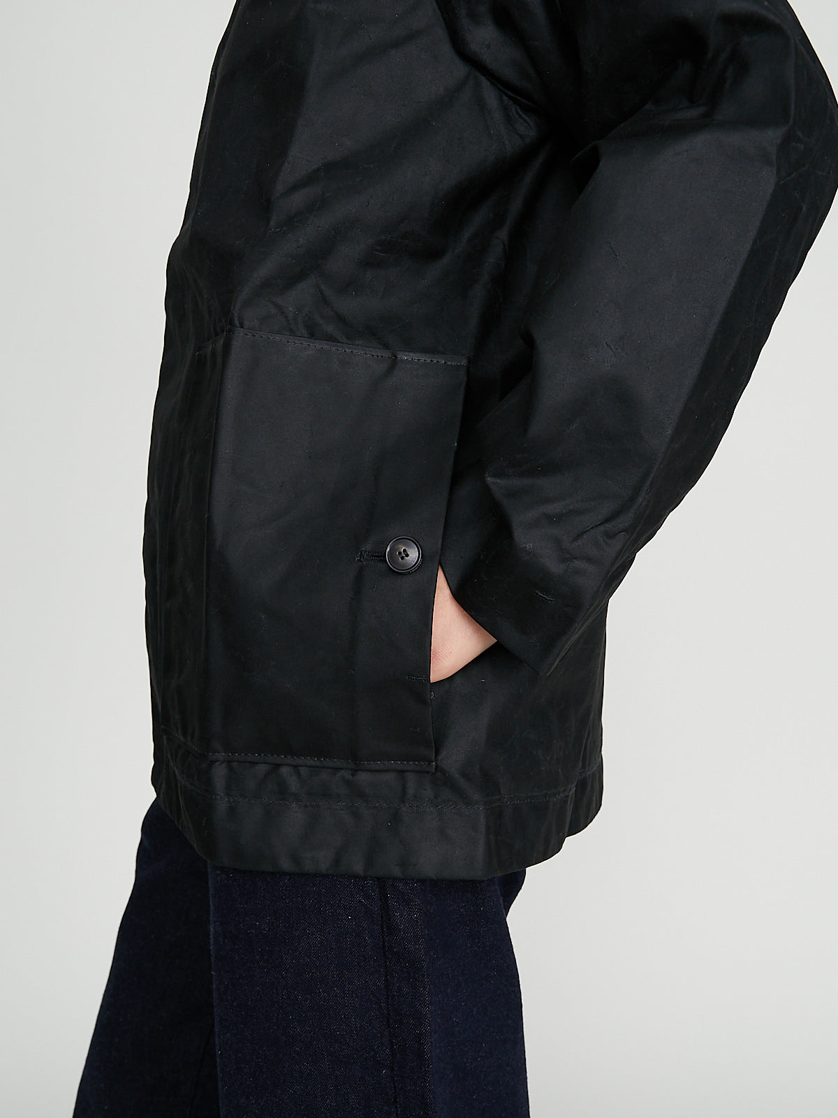 Unisex jacket crafted from black waxed BCI cotton from Scotland, by Halley Stevensons. This cotton has been treated with biodegradable oil, and is both water-repellent and breathable. With regular use, it will develop a unique patina, adding character to the garment over time.