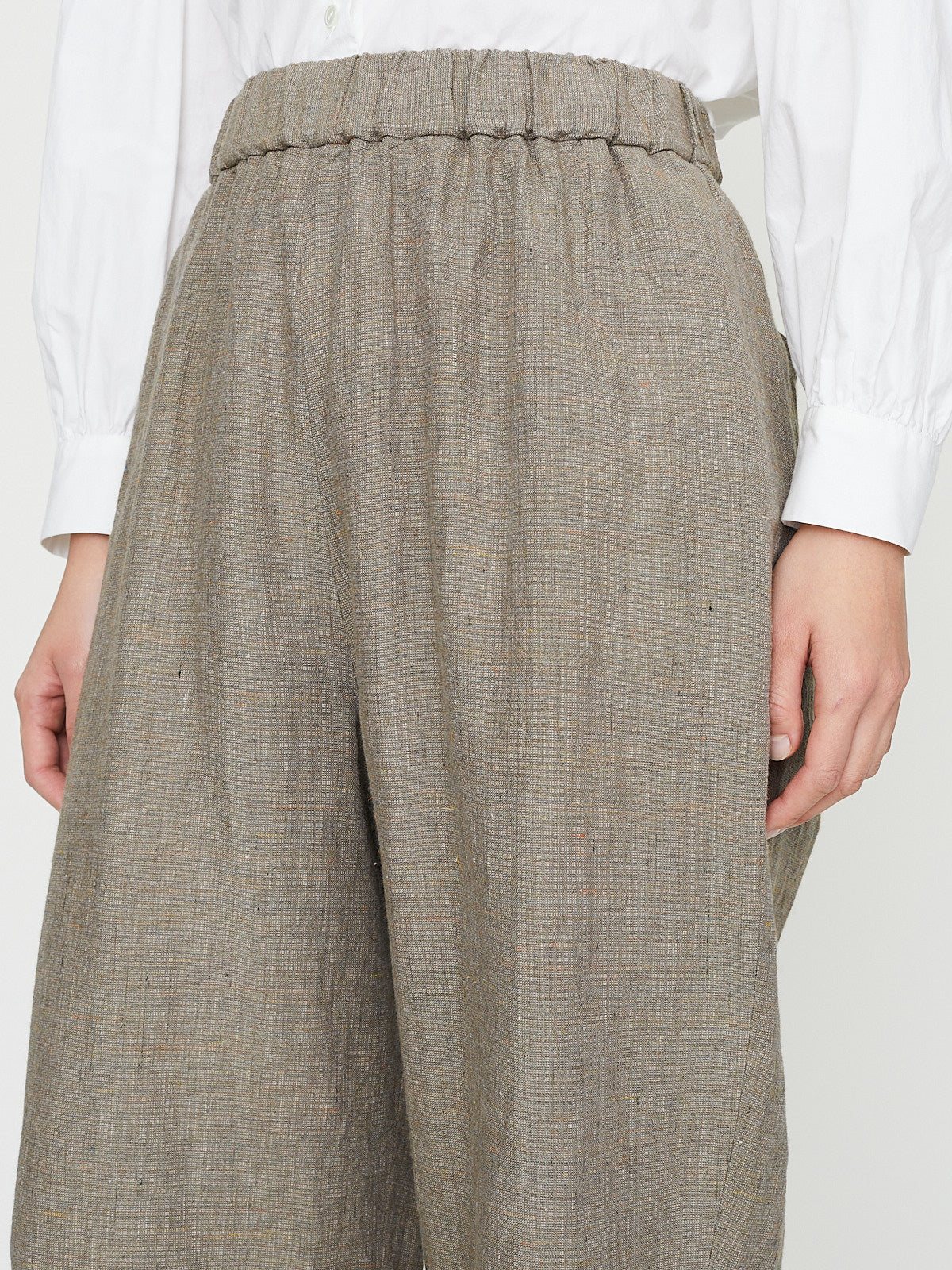 Oversized easy pants in khaki linen/wool Hakeme chambray. Pull-on style with an elasticated waistband and side seam pockets. One welted slip pocket and a flap pocket on the back. Cropped wide legs that taper at the cuffs.