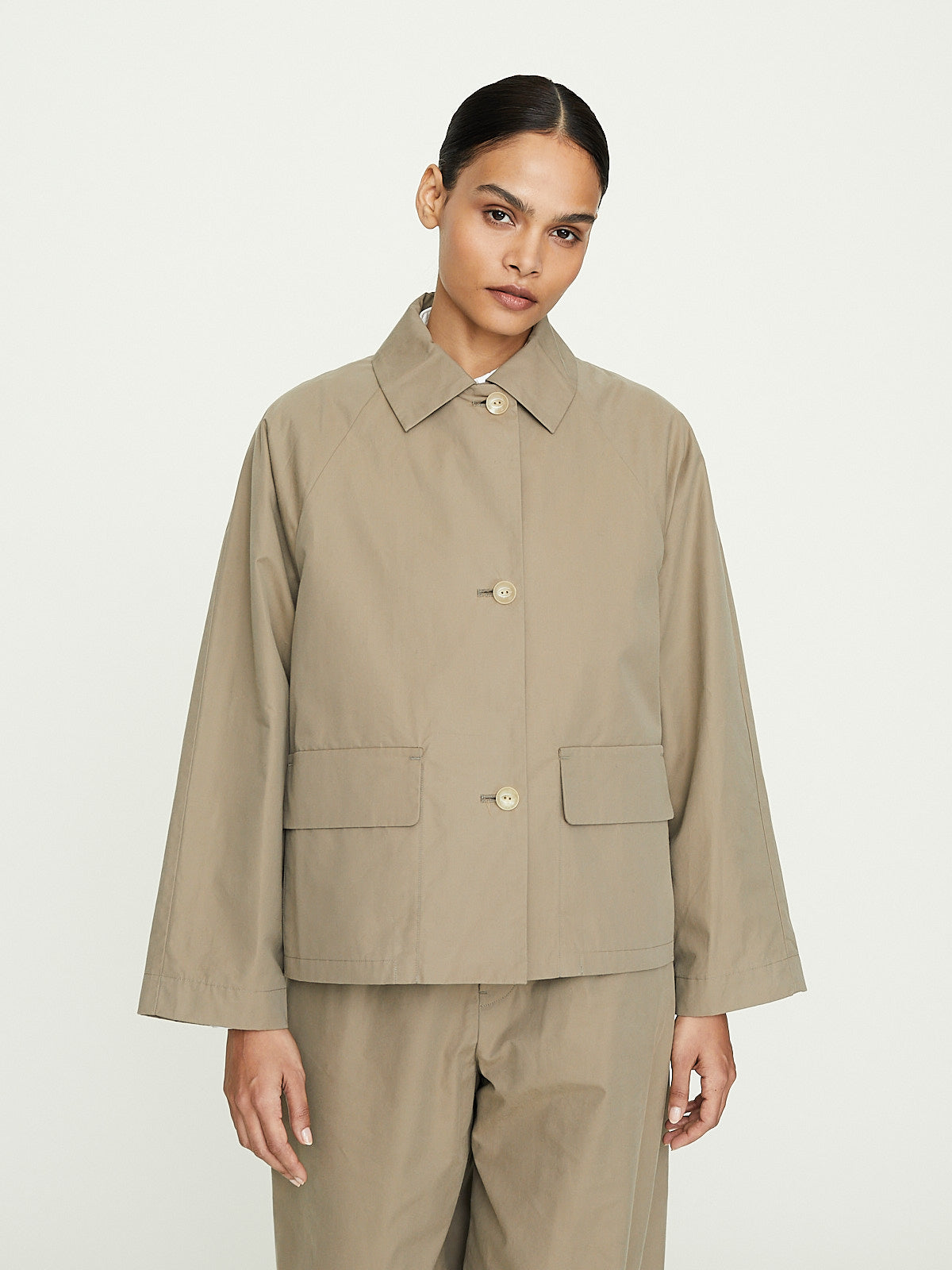 Cropped boxy jacket in a khaki cotton canvas. Bal collar, front button fastening and wide raglan bracelet sleeves. Flap pockets on the front. Oversized fit.