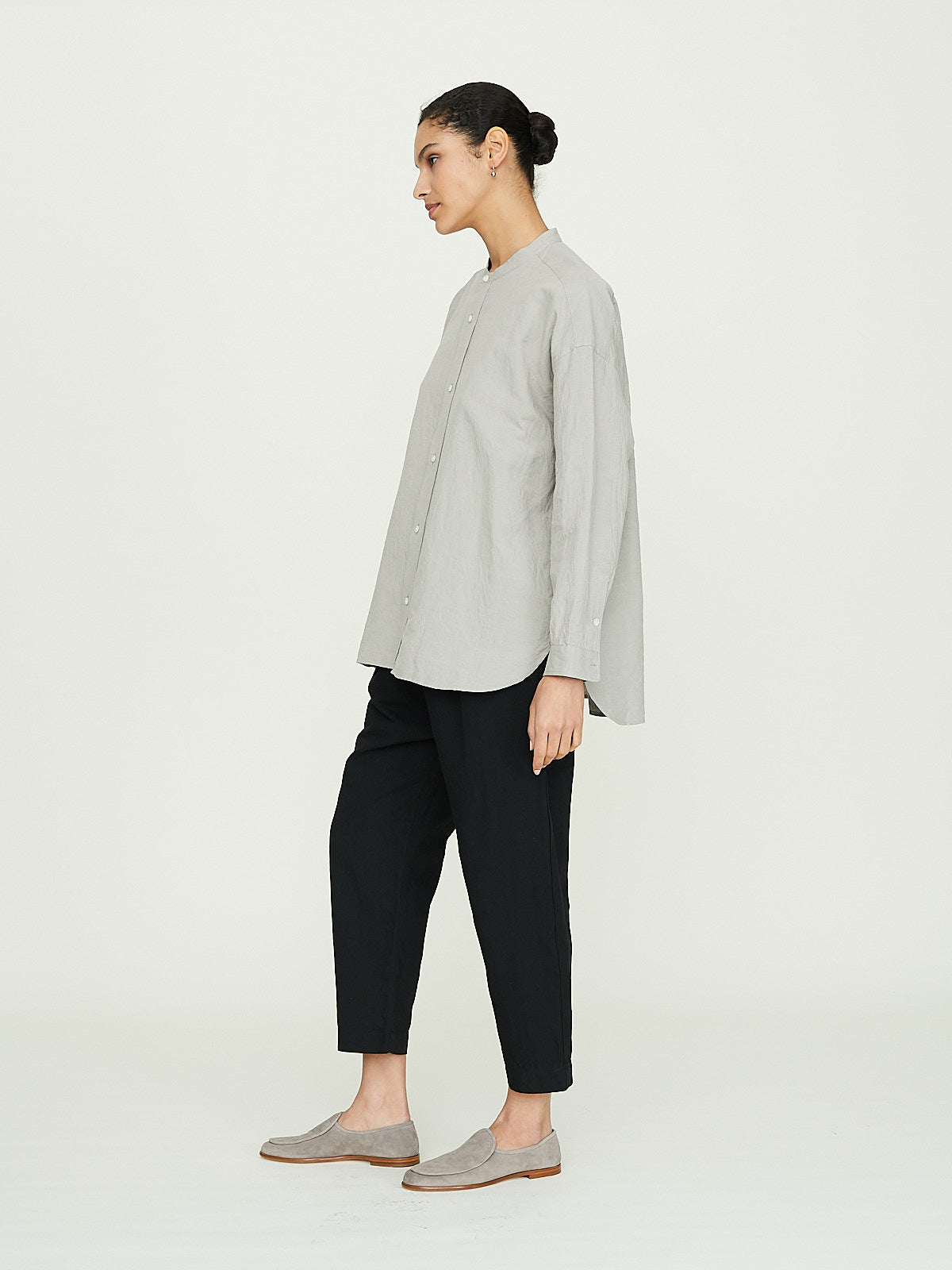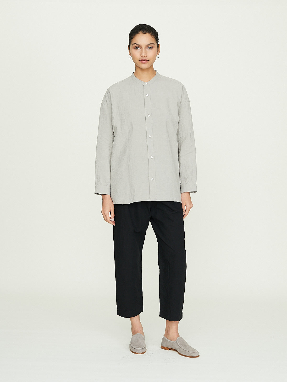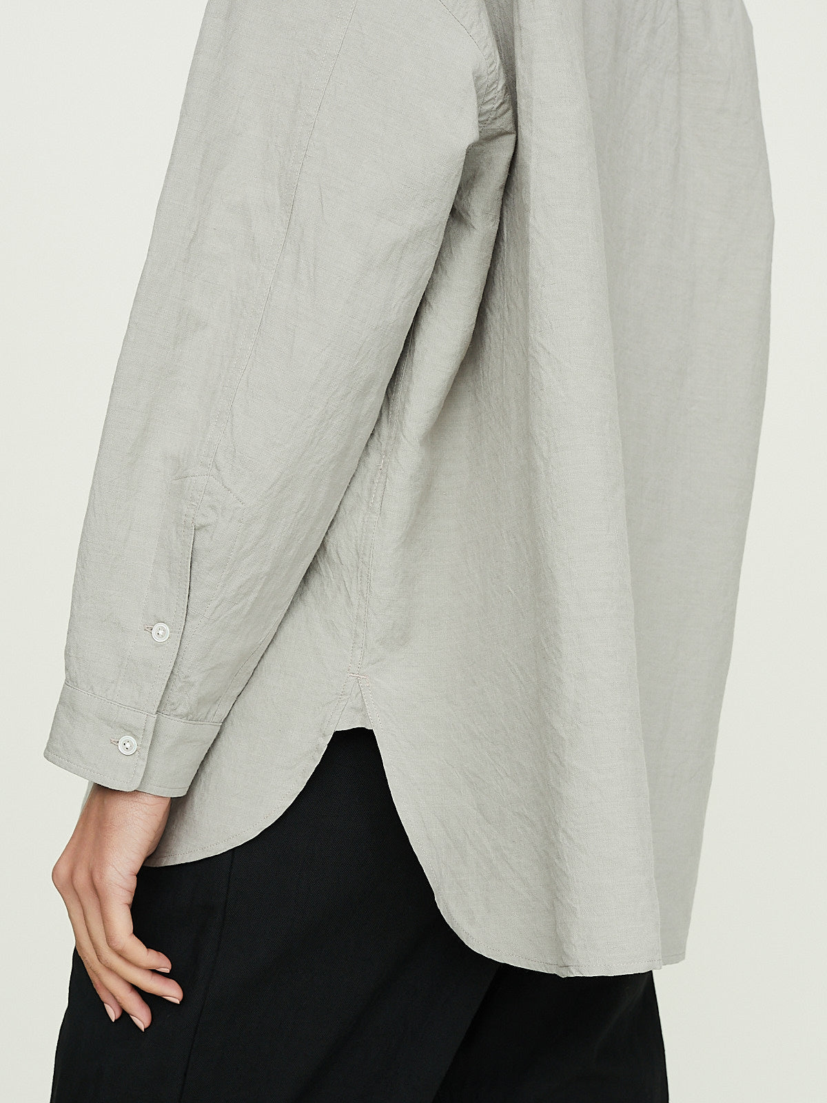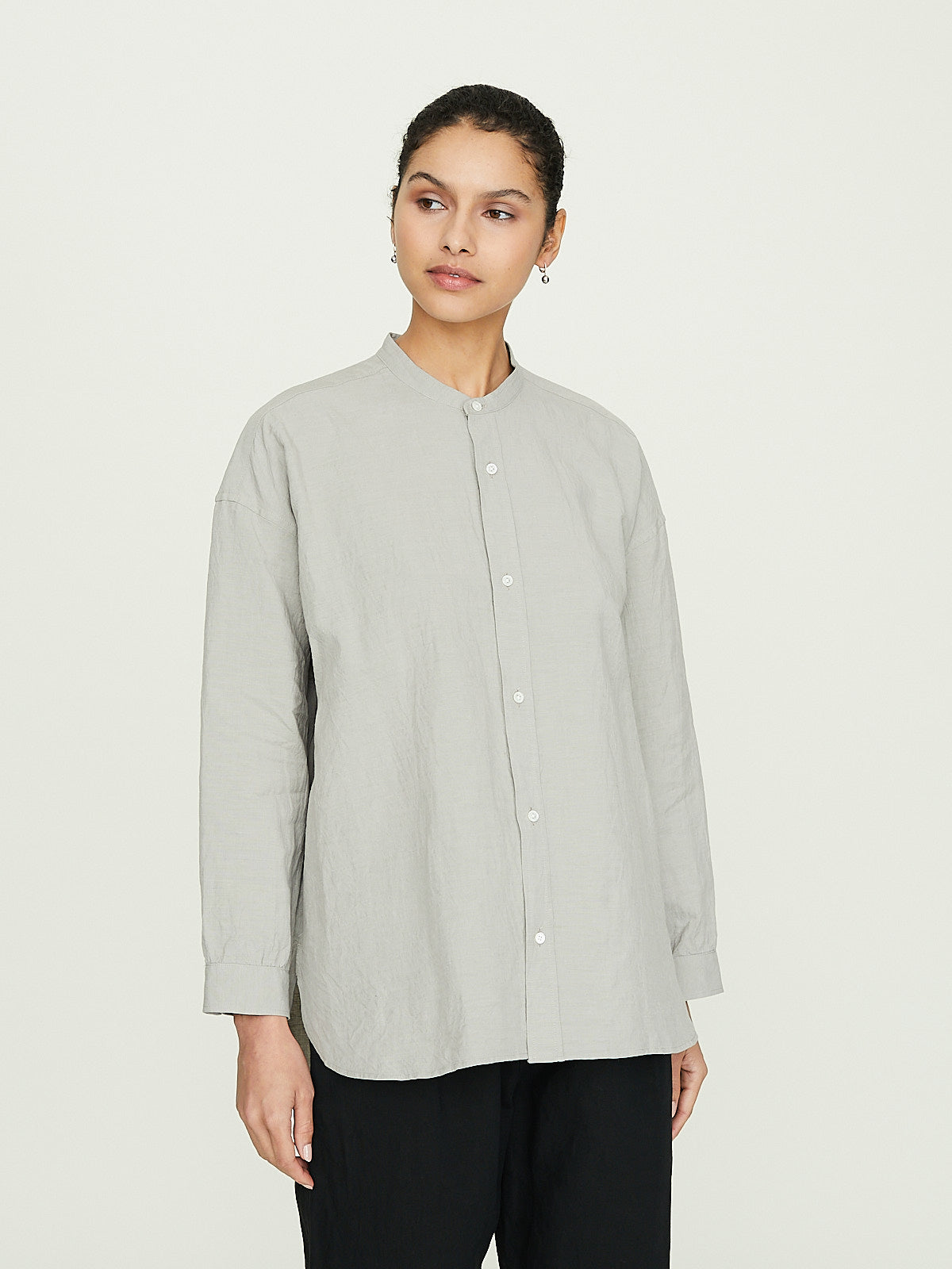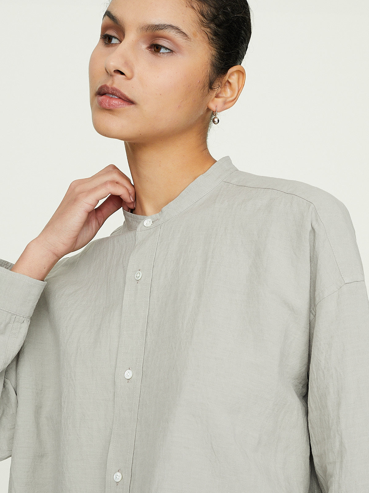 Regular shirt in greige cotton/silk washer. Banded collar, front button fastening and long sleeves with a dropped shoulder and buttoned cuffs. Back yoke. Curved hemline with side slits.
