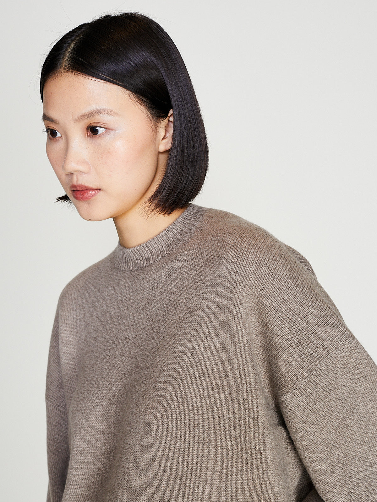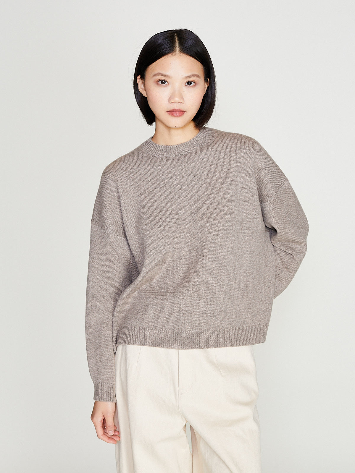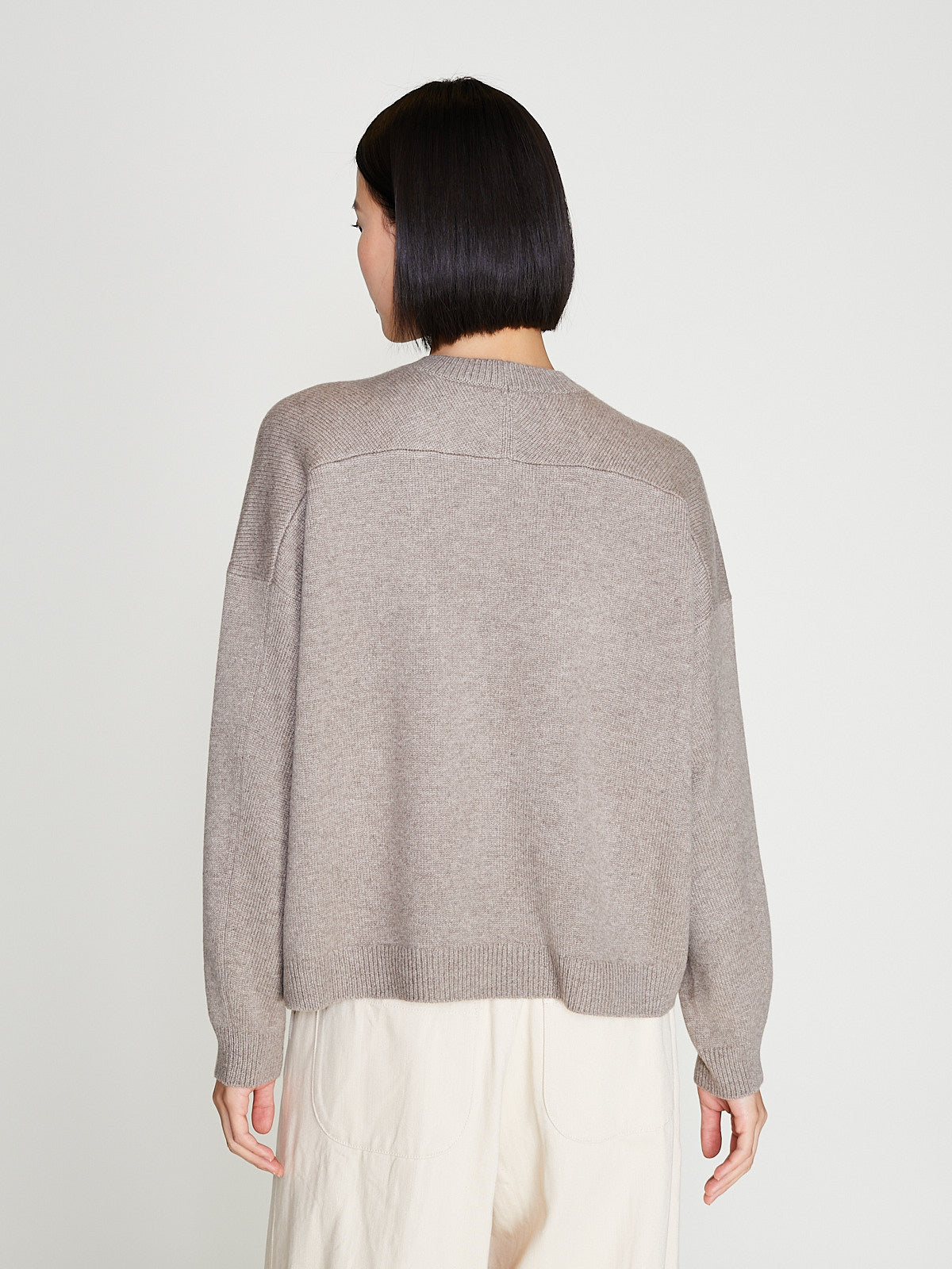 Relaxed sweater in dark beige bulky cashmere. Crewneck, long sleeves with a dropped shoulder and a back yoke detail. Features a rib detail around the neck, cuffs and bottom hem.