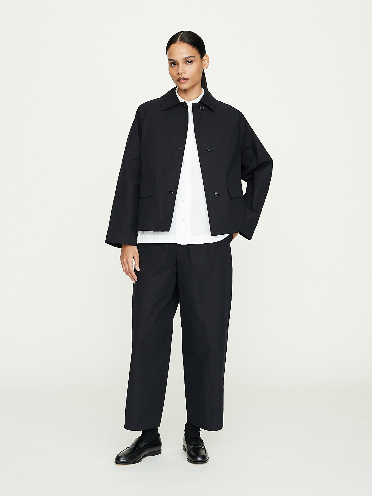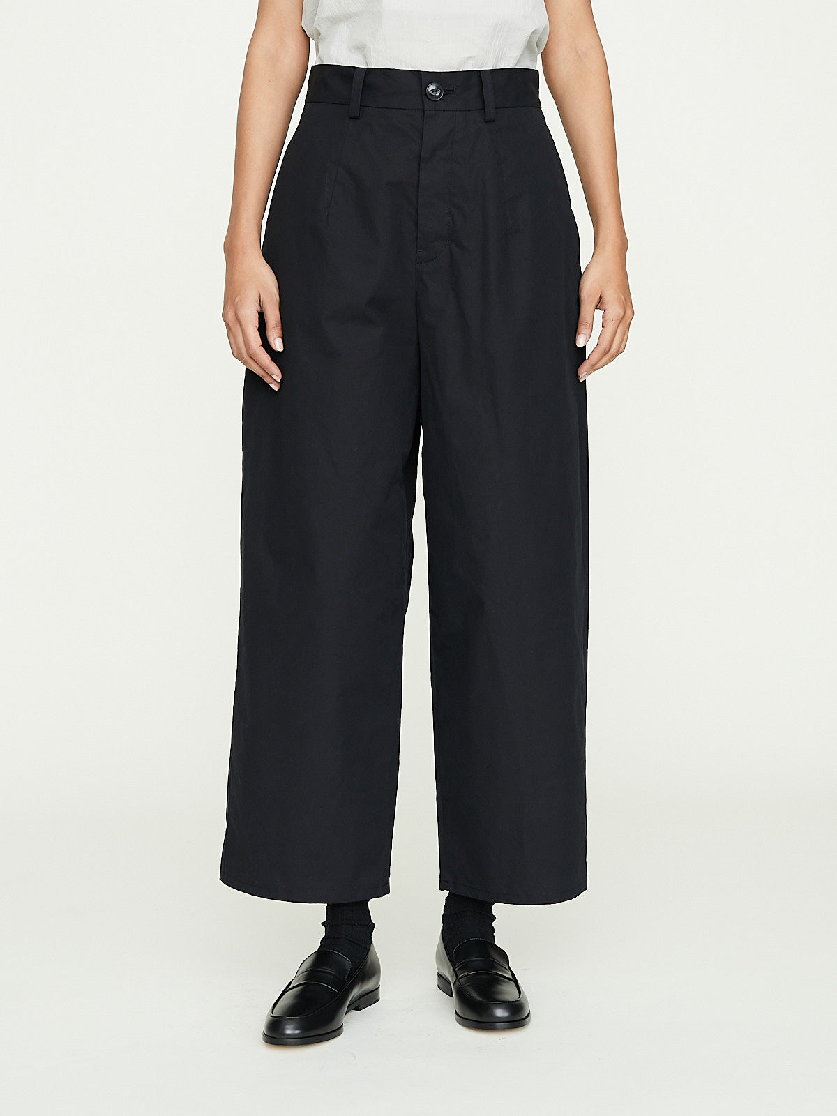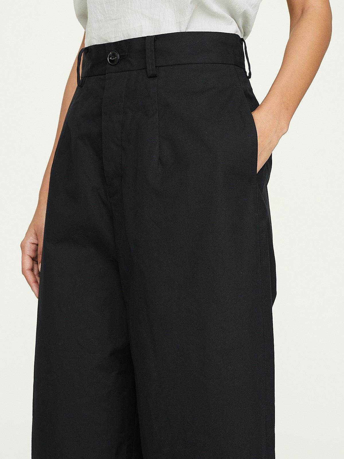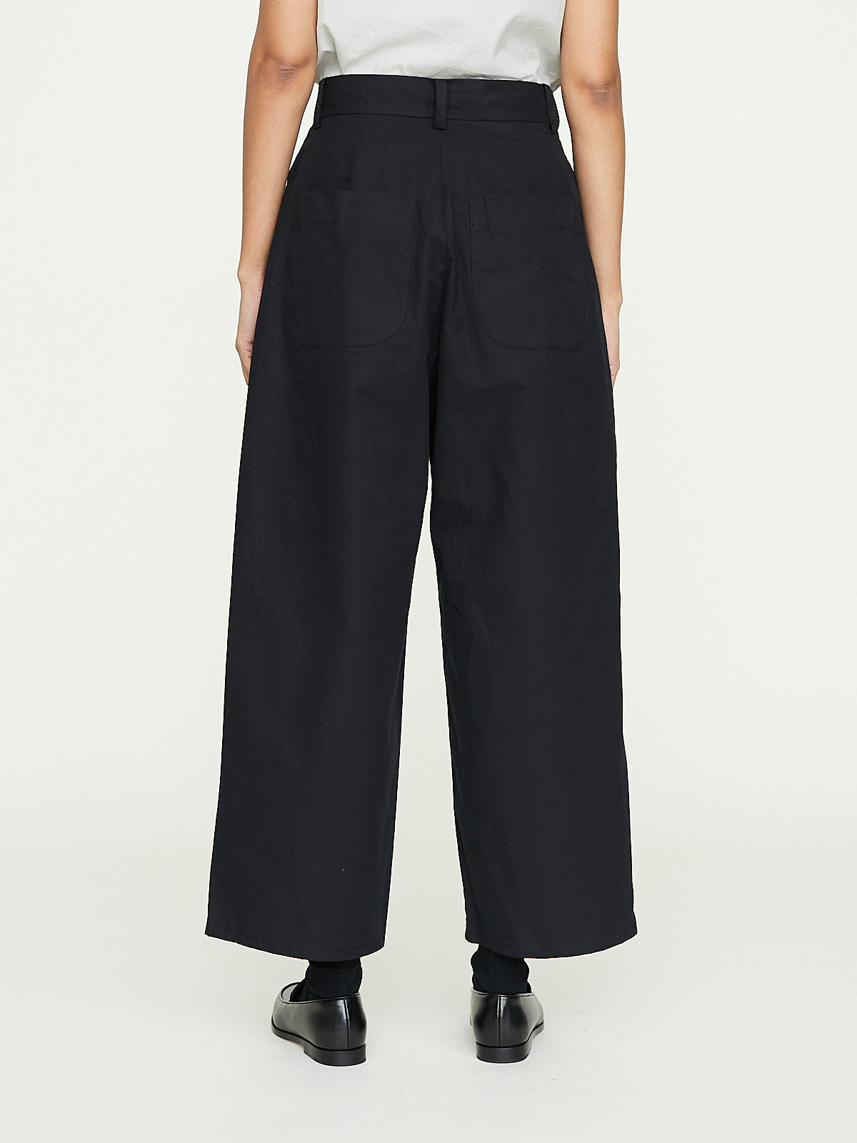 Oversized chino pants in black cotton canvas. High waist, single button fastening and zip fly. Belt loops and side seam pockets. Large patch pockets on the back. Darts at the waist on the front and back. Wide straight legs.