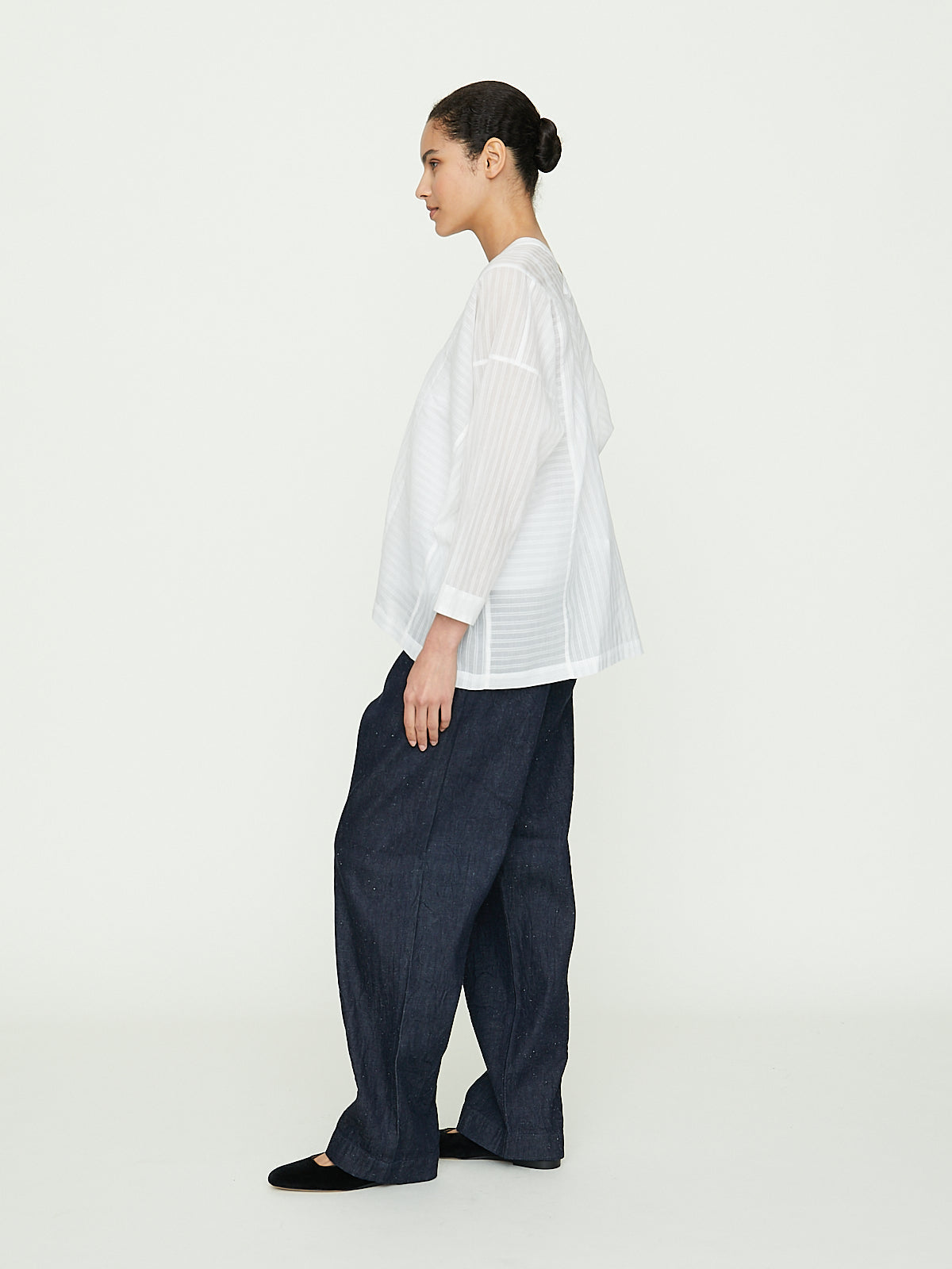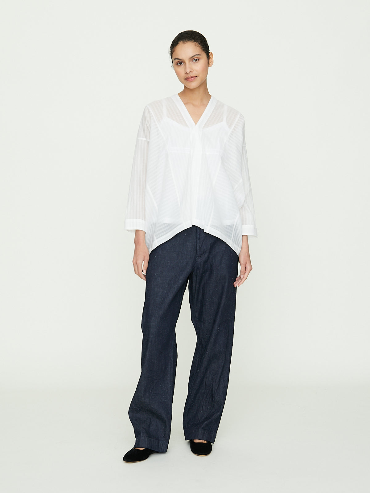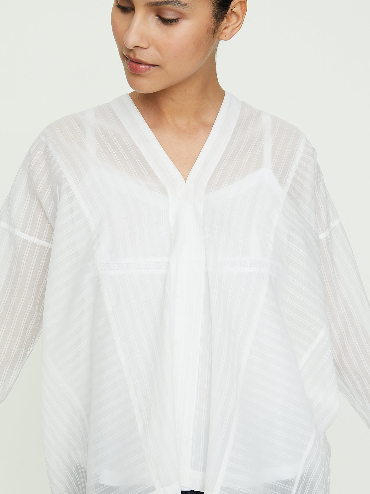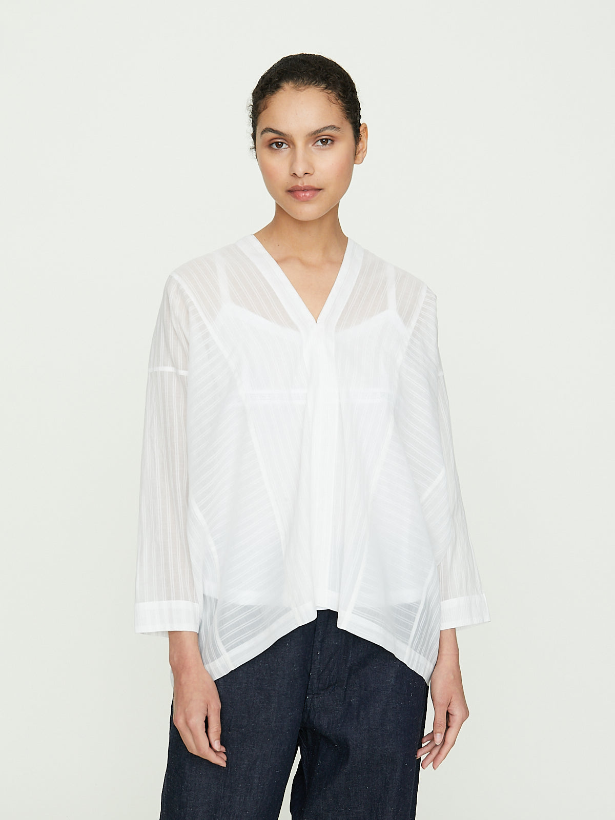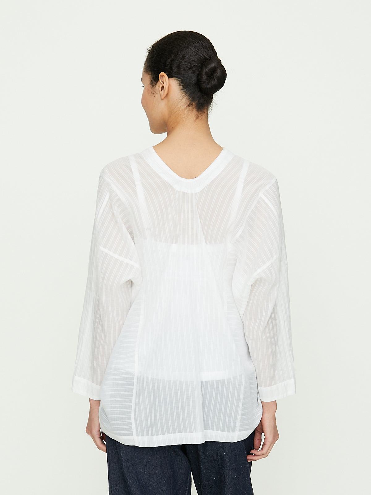 Oversized blouse in sheer striped pale grey cotton/silk. V-neck on the front and a subtle scoop neck on the back. Cropped dolman sleeves. Features panelling details throughout.