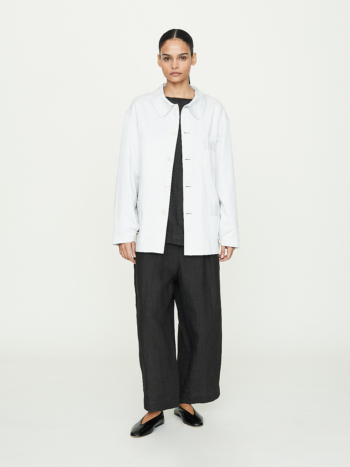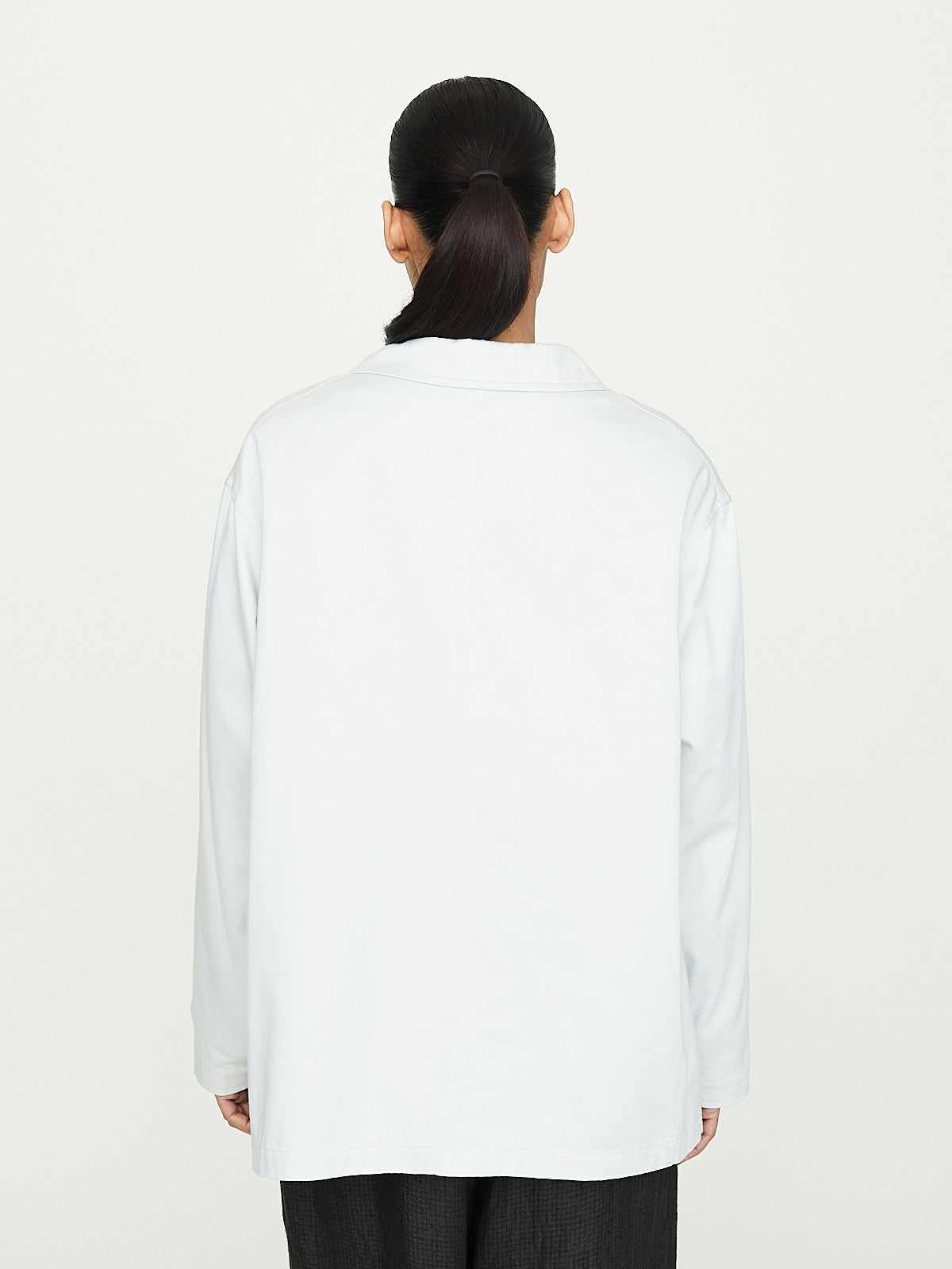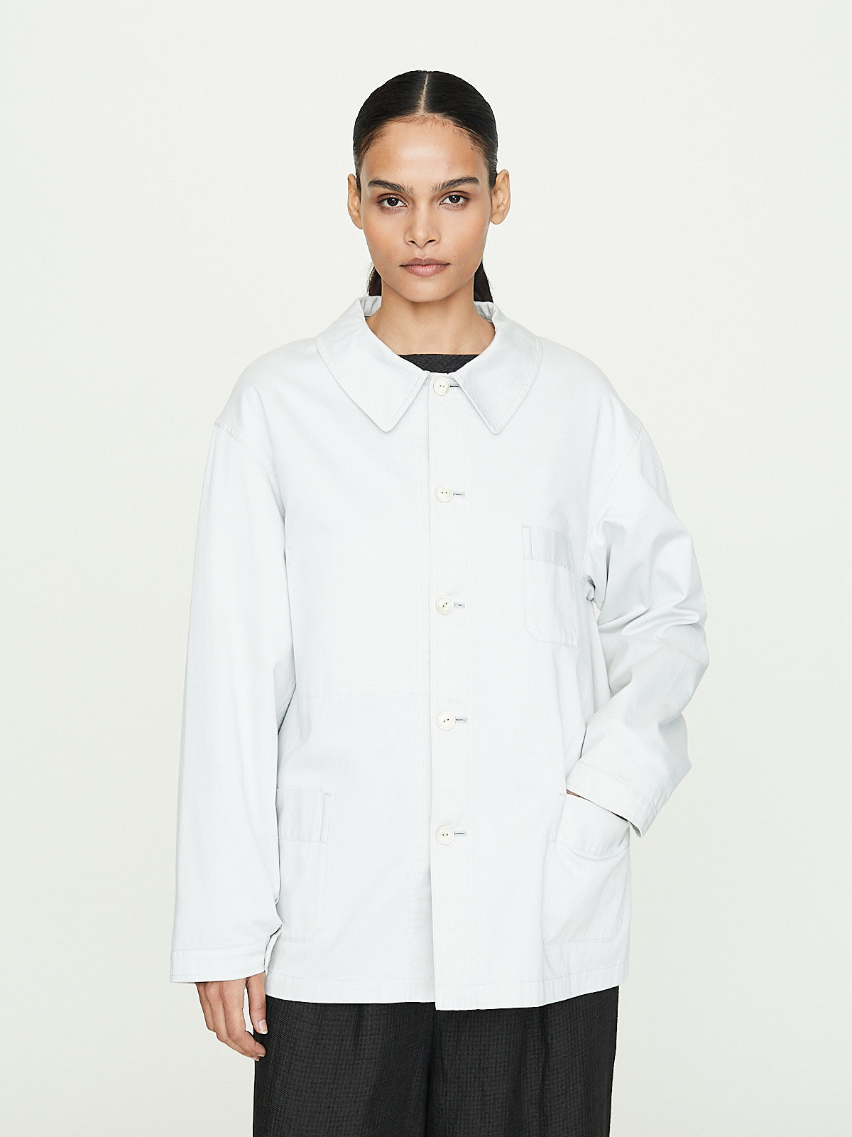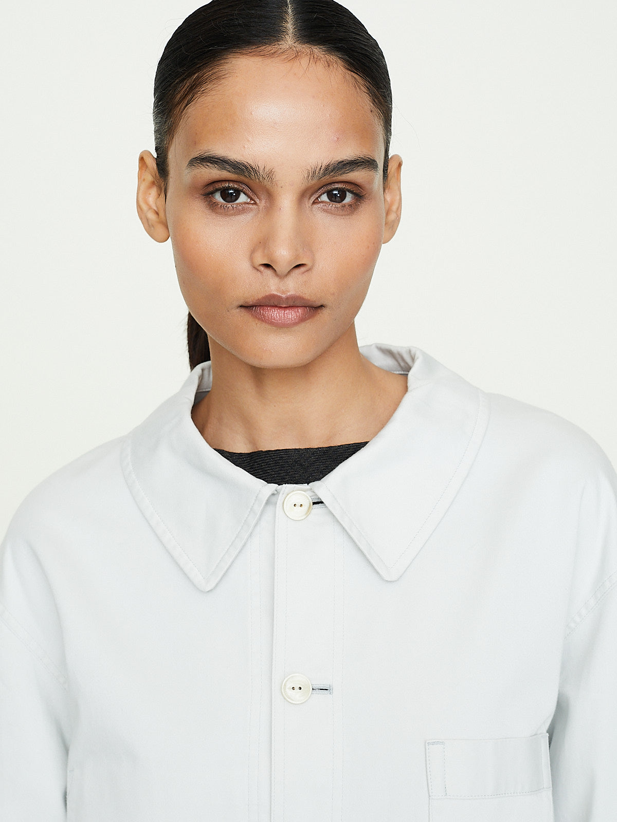 Workwear-inspired jacket in white cotton with a stain weave. Pointed collar, front button fastening and patch pockets on the front. Single chest pocket and buttoned cuffs. Boxy fit.