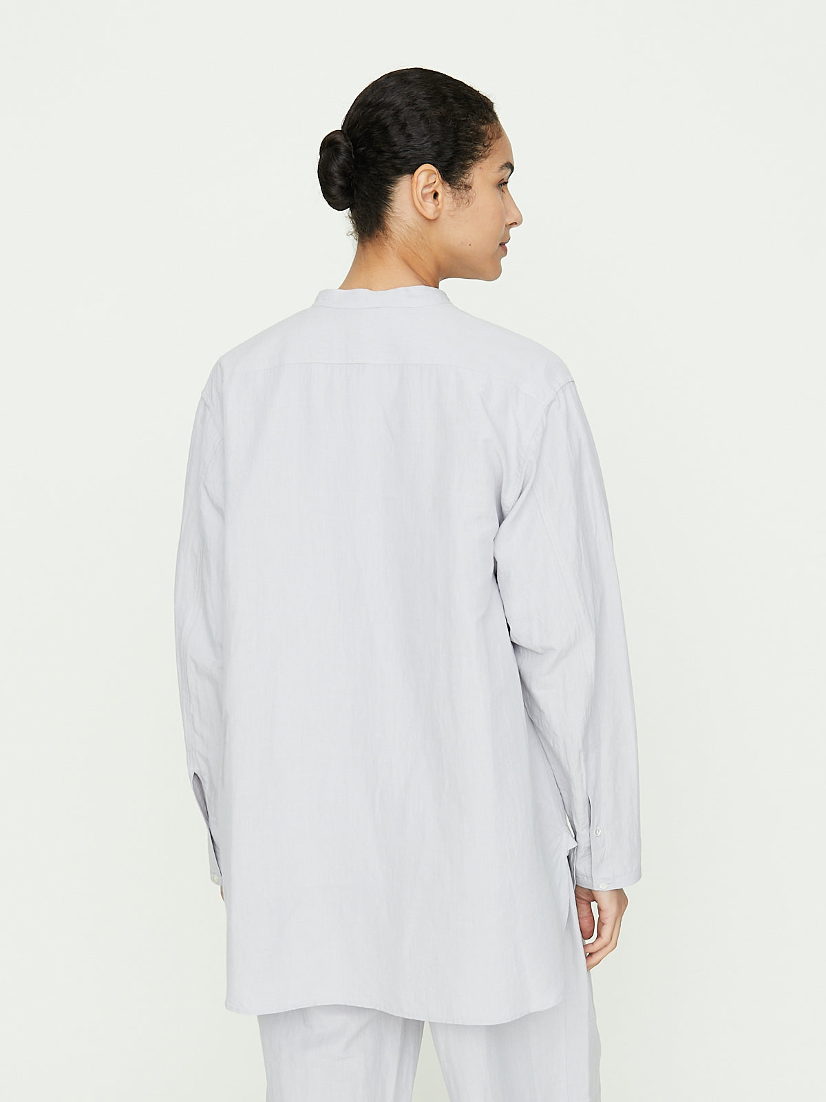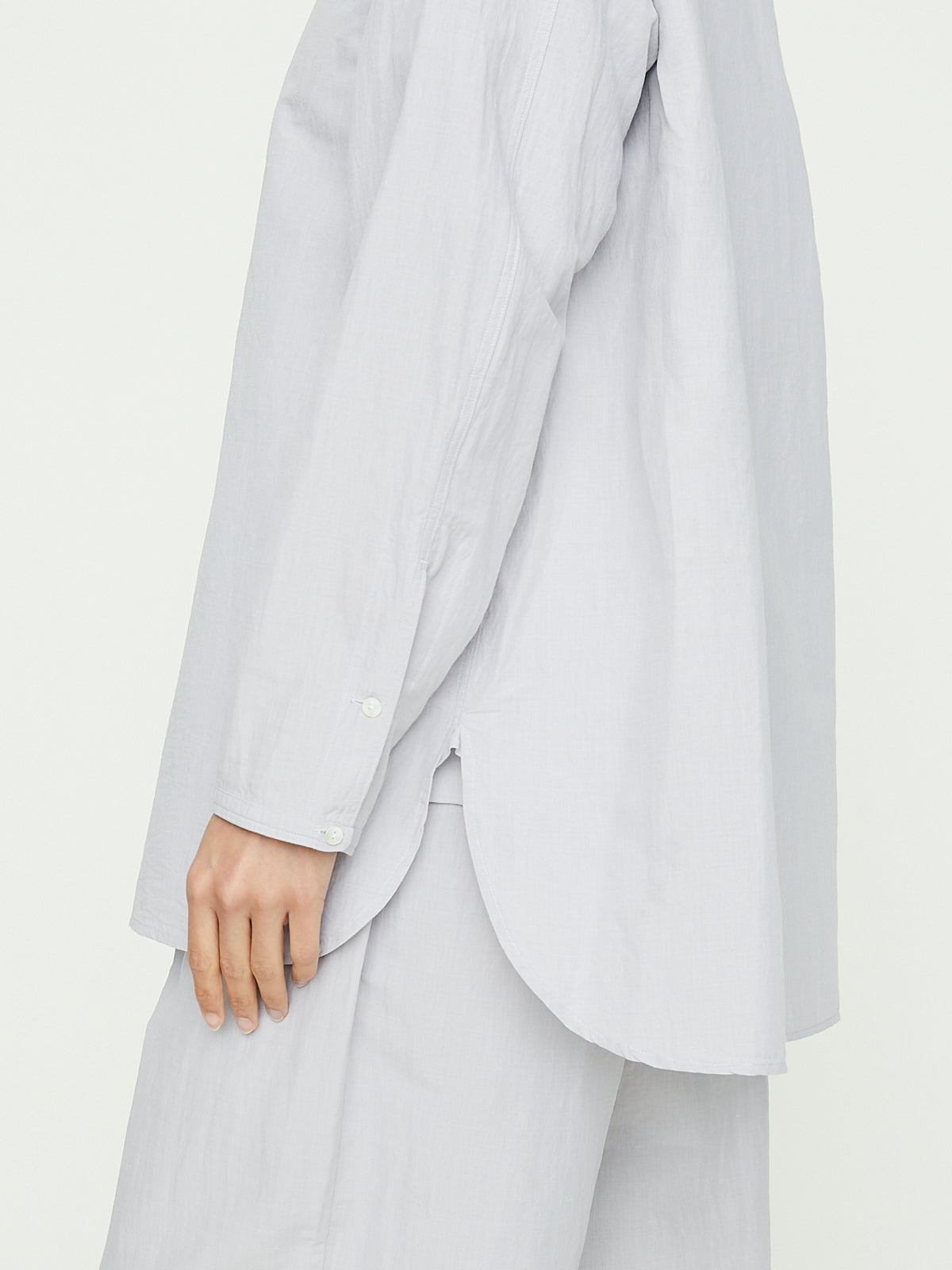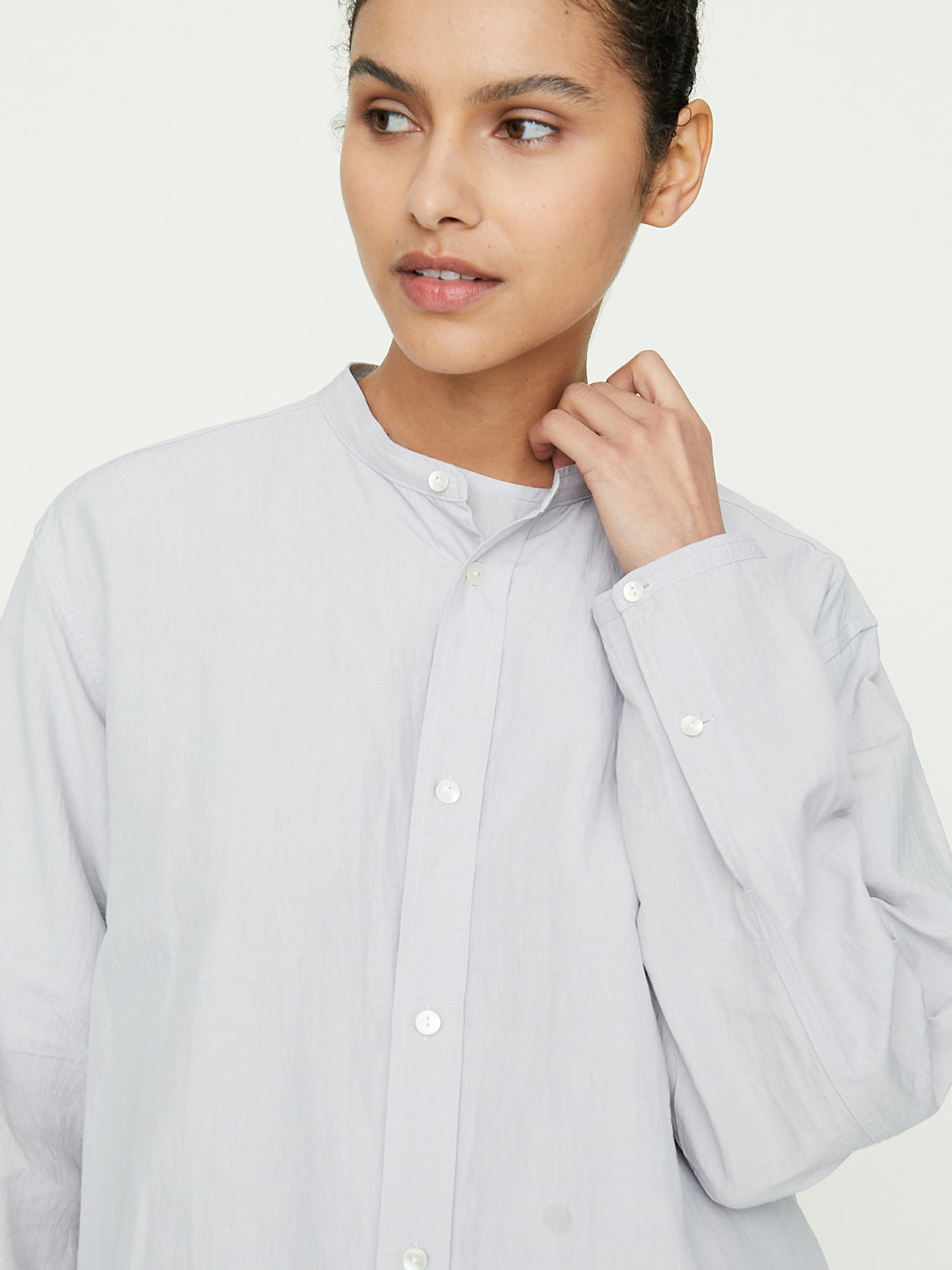 Relaxed shirt in a light grey cotton blend. Banded collar and a front button fastening. Long sleeves with a dropped shoulder and buttoned cuffs. Features a back yoke. Curved hemline that is slightly longer at the back with side slits.