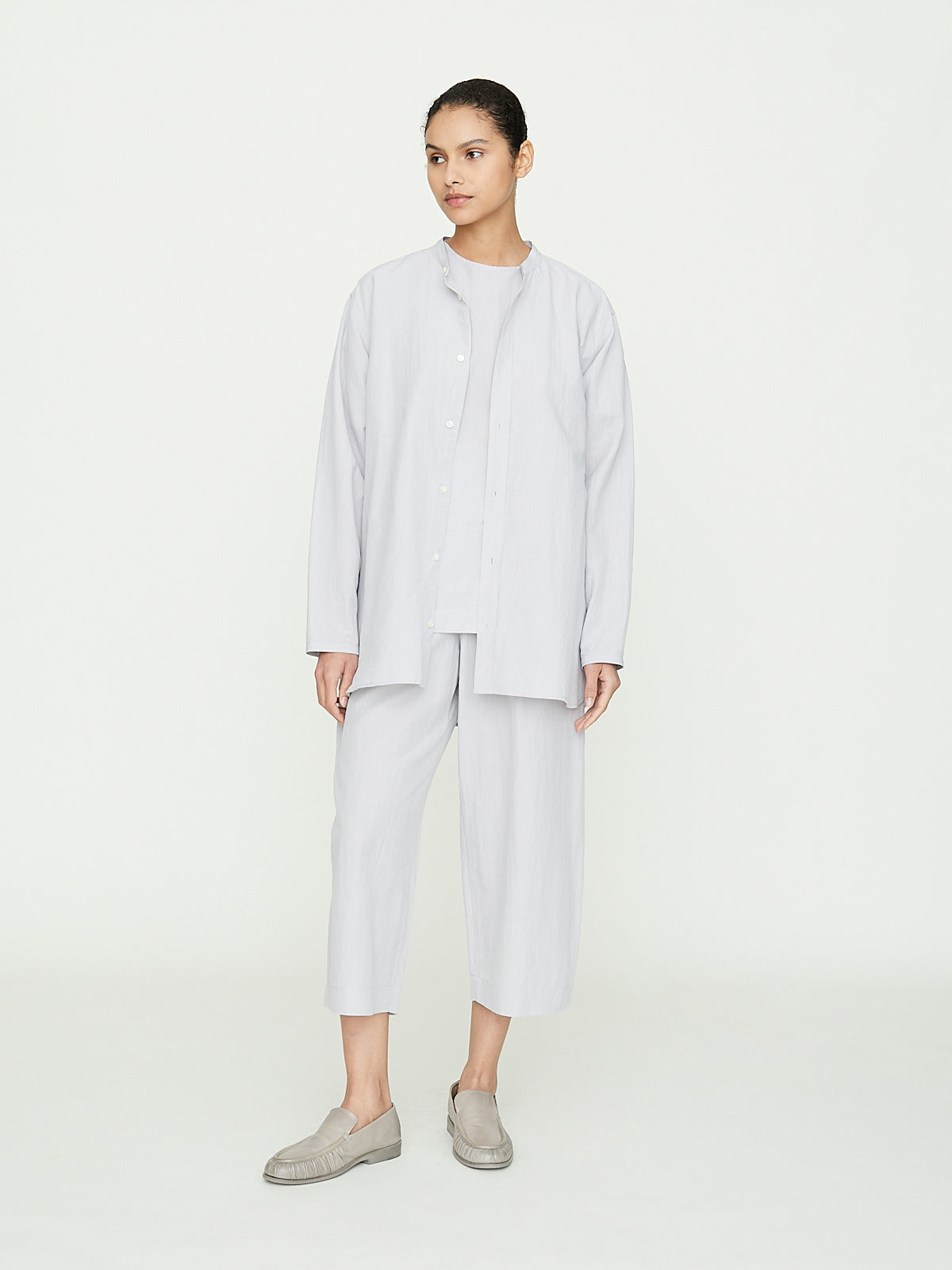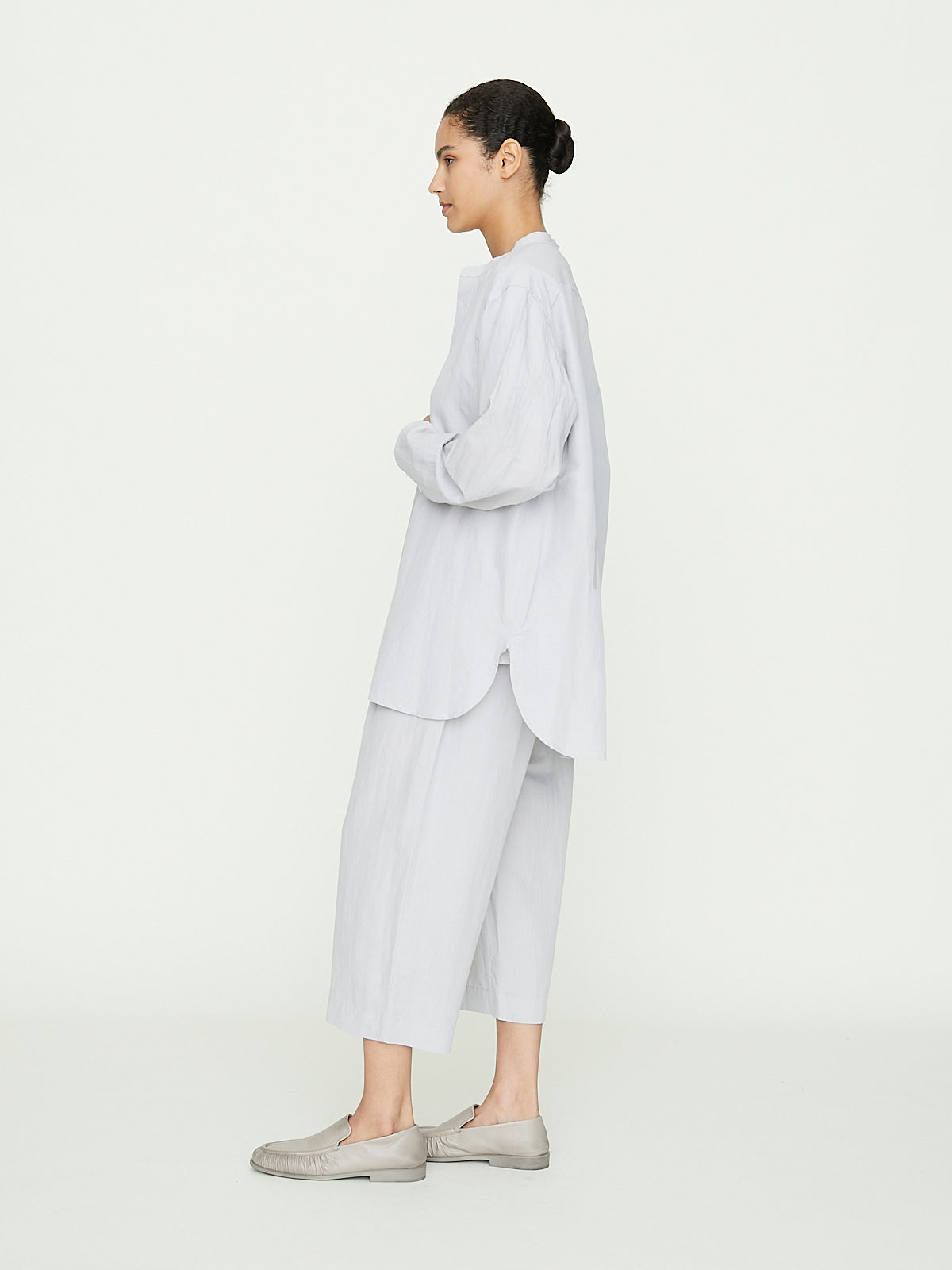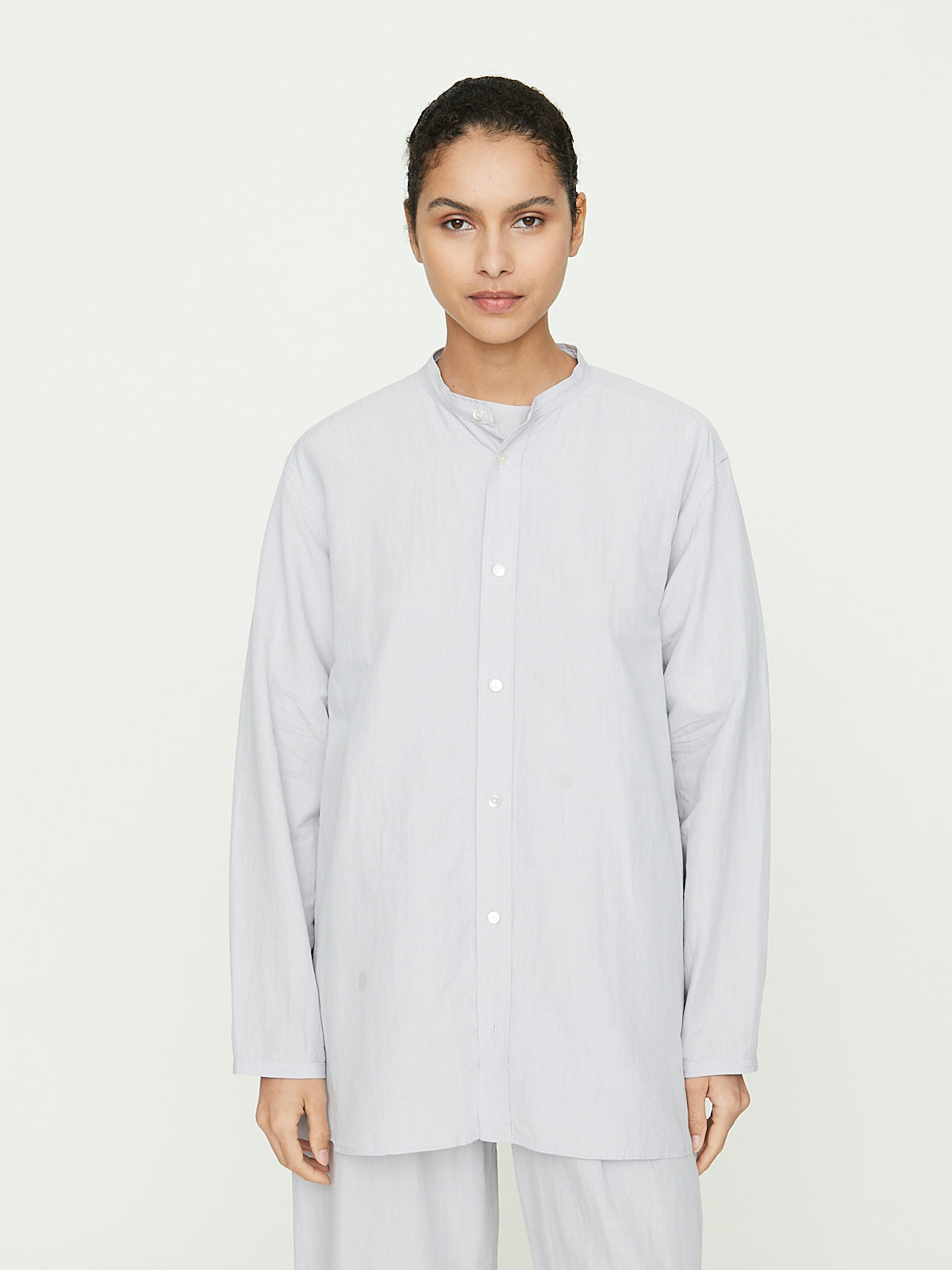 Relaxed shirt in a light grey cotton blend. Banded collar and a front button fastening. Long sleeves with a dropped shoulder and buttoned cuffs. Features a back yoke. Curved hemline that is slightly longer at the back with side slits.