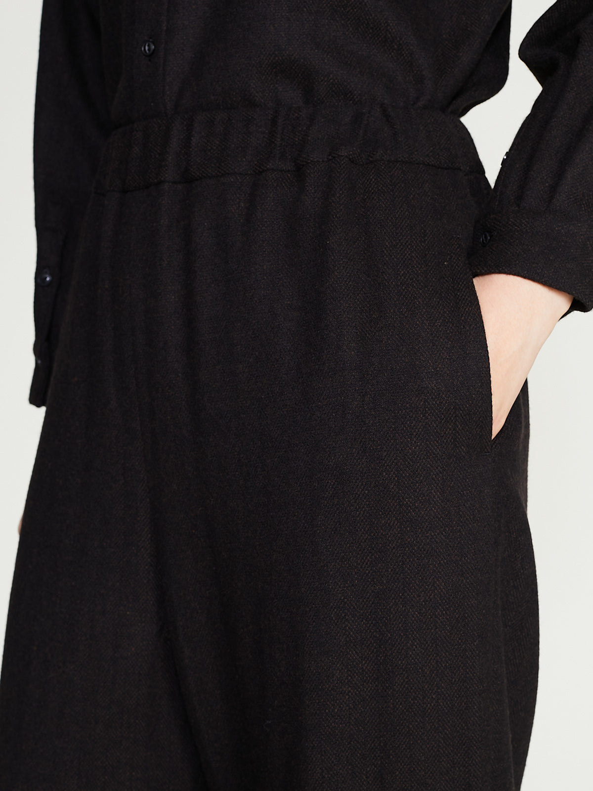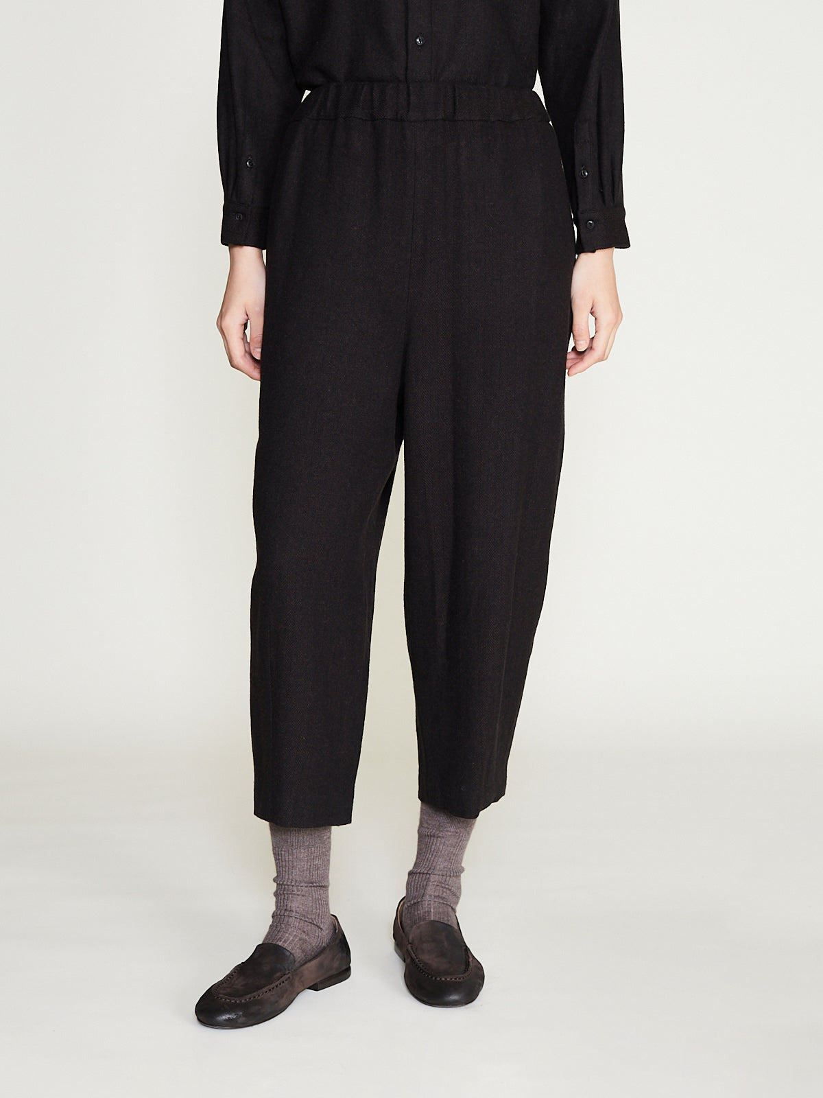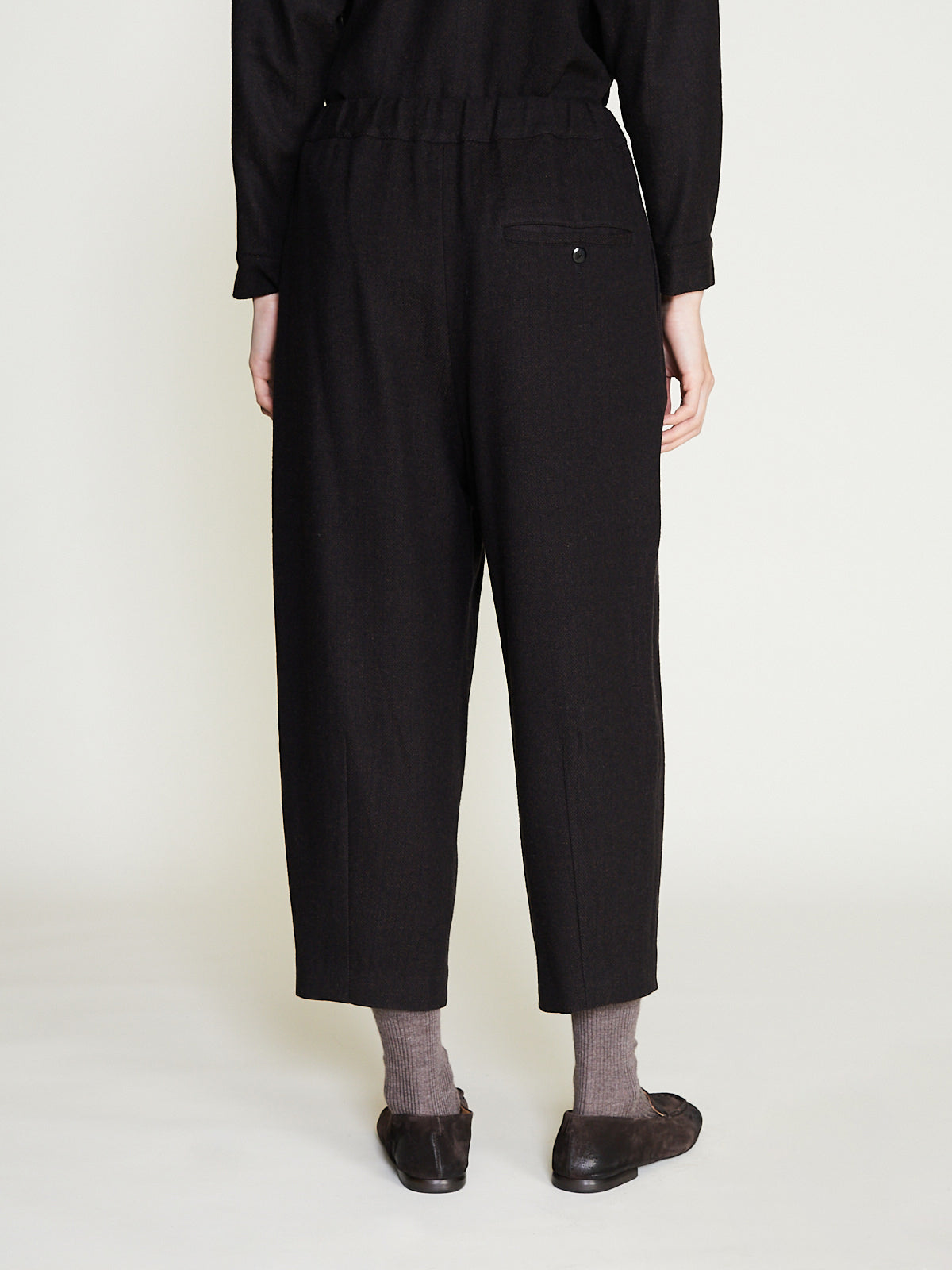 Cropped easy pants in brown wool/silk herringbone. Pull-on style with an elasticated waistband and side seam pockets. Single welted pocket with a button fastening on the back. Features hem darts. Subtle balloon shape.