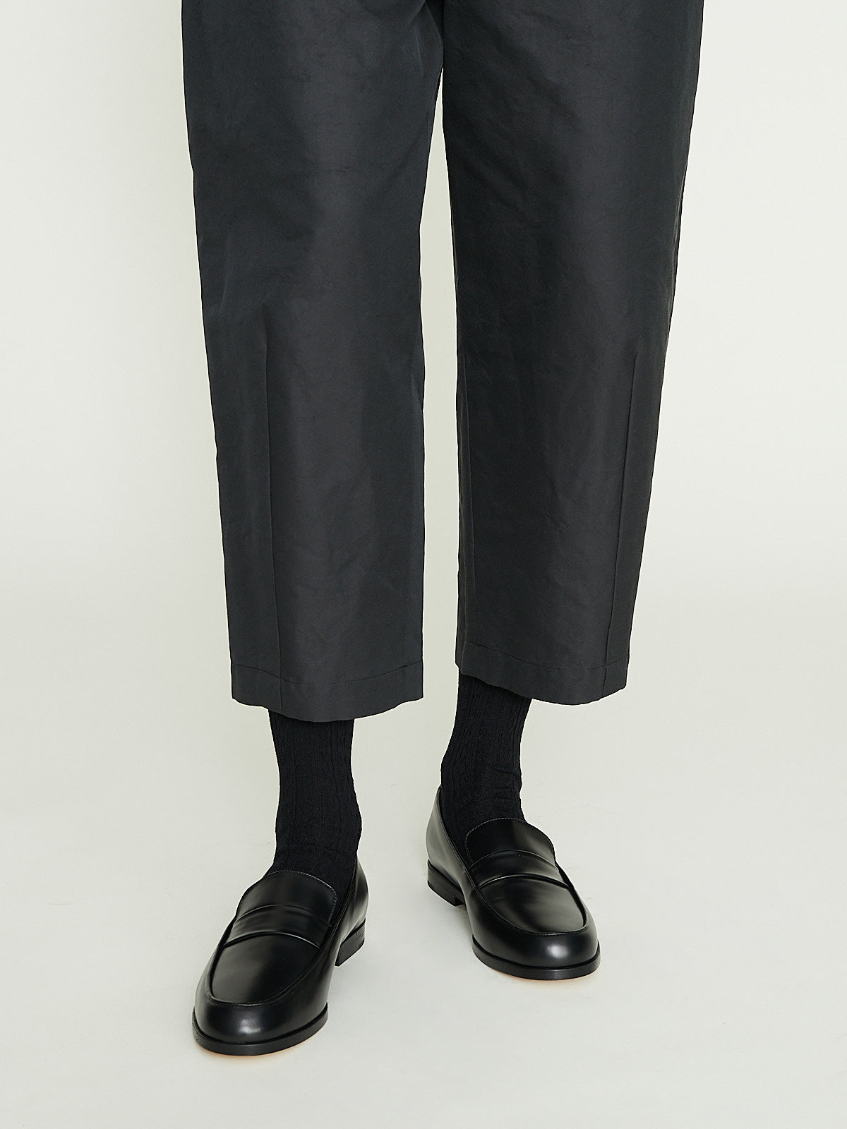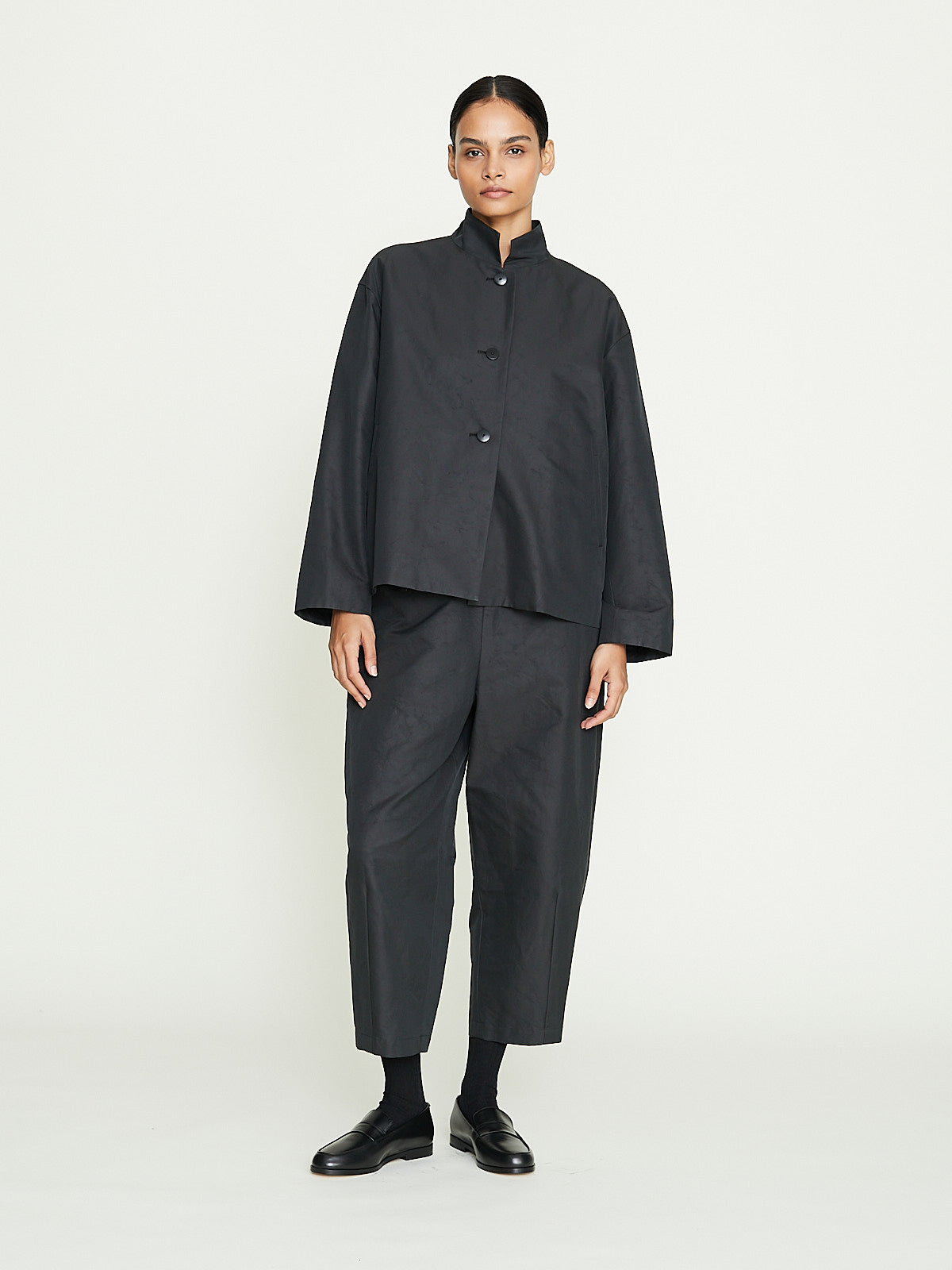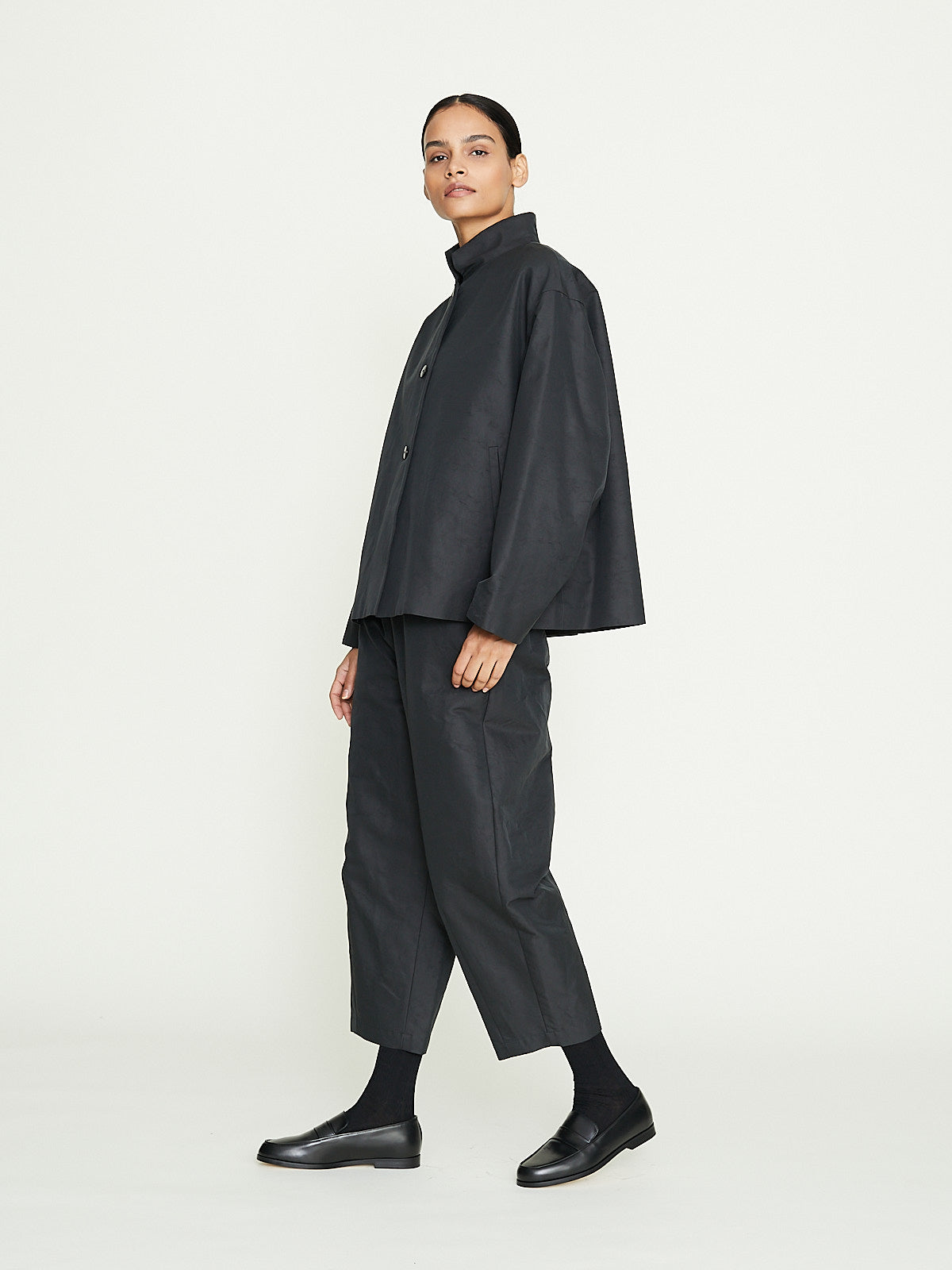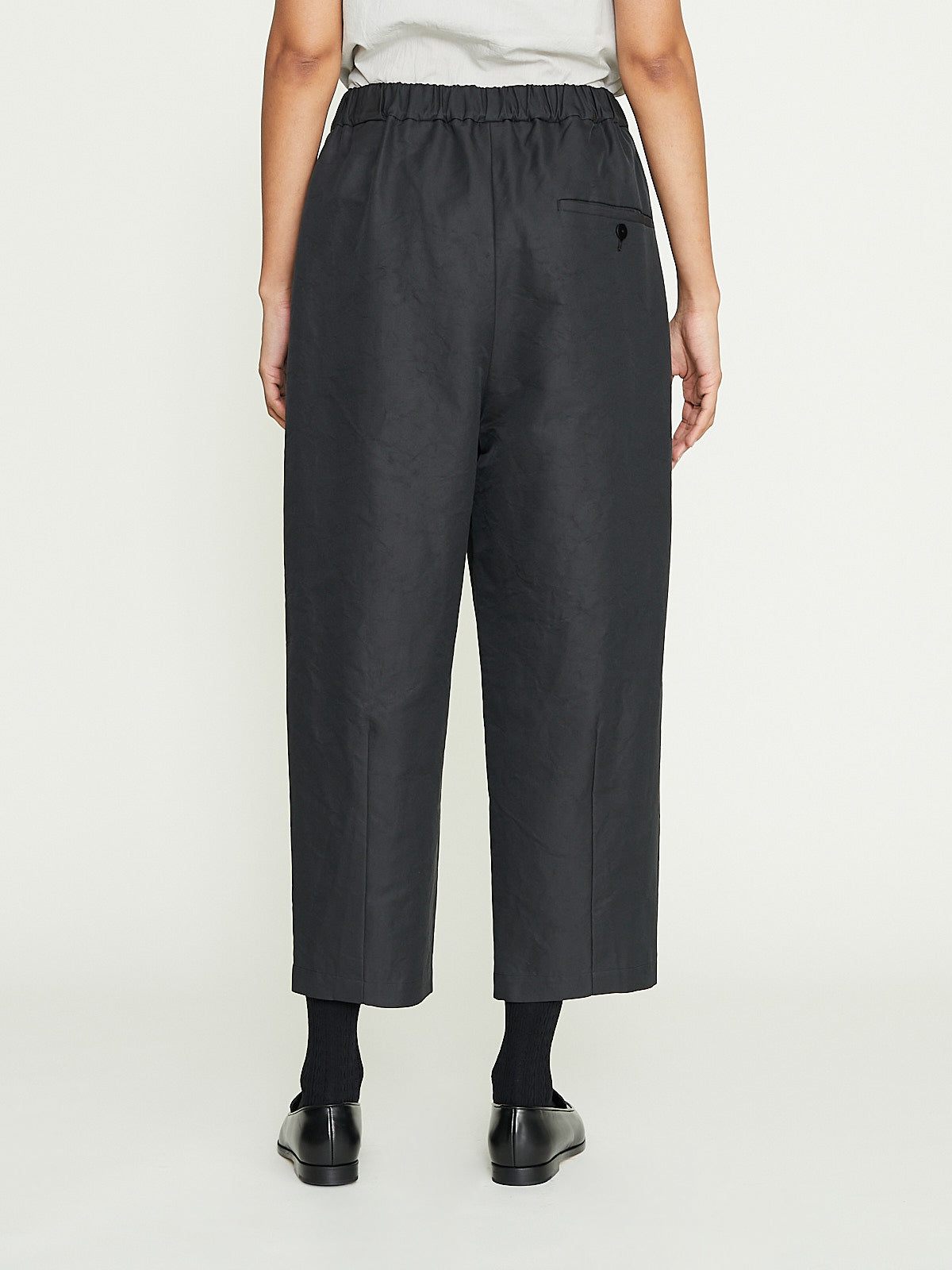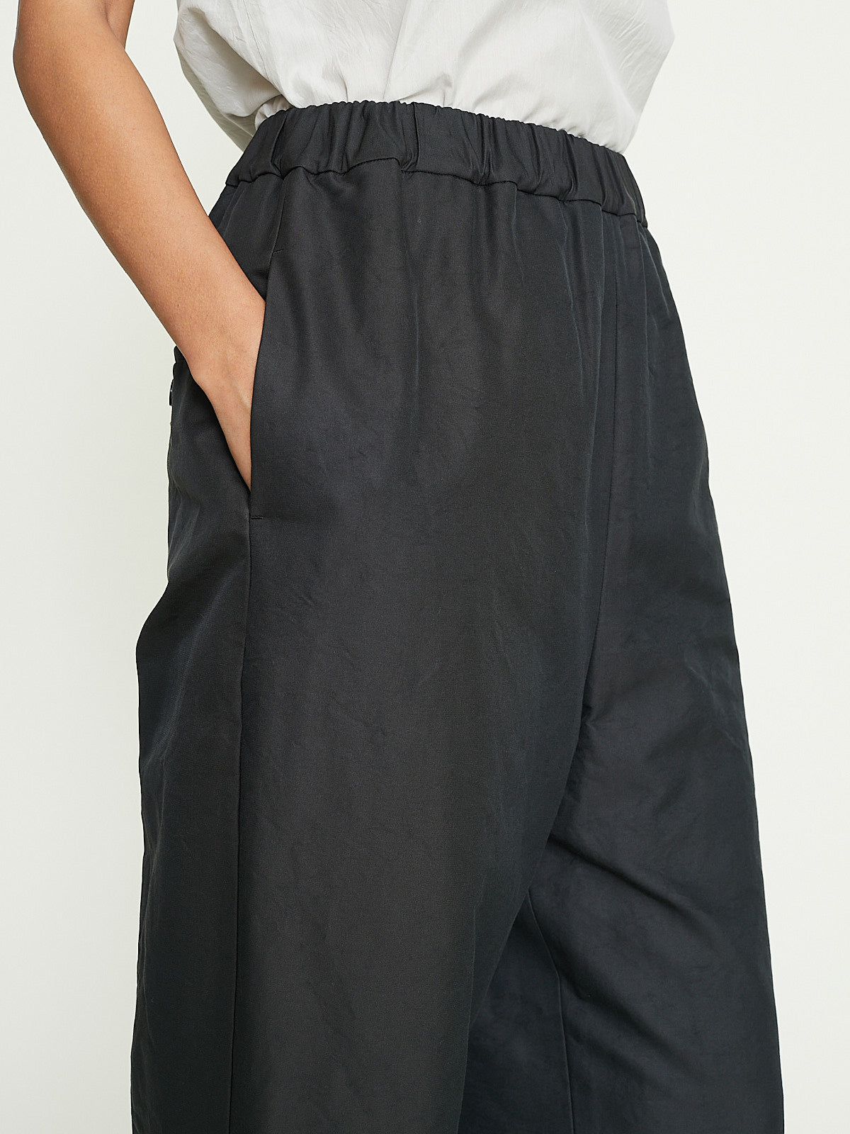 Easy pants in vintage black cotton/silk. Pull-on style with an elasticated waistband and side seam pockets. Single welted pocket with a button fastening on the back. Features hem darts. Subtle balloon shape.