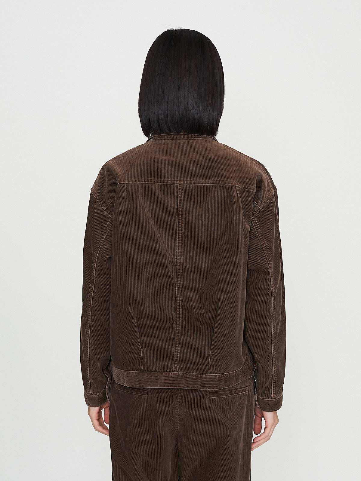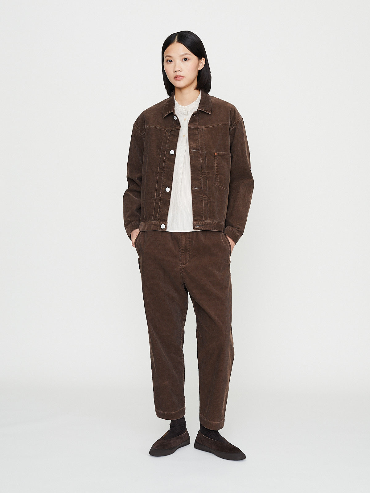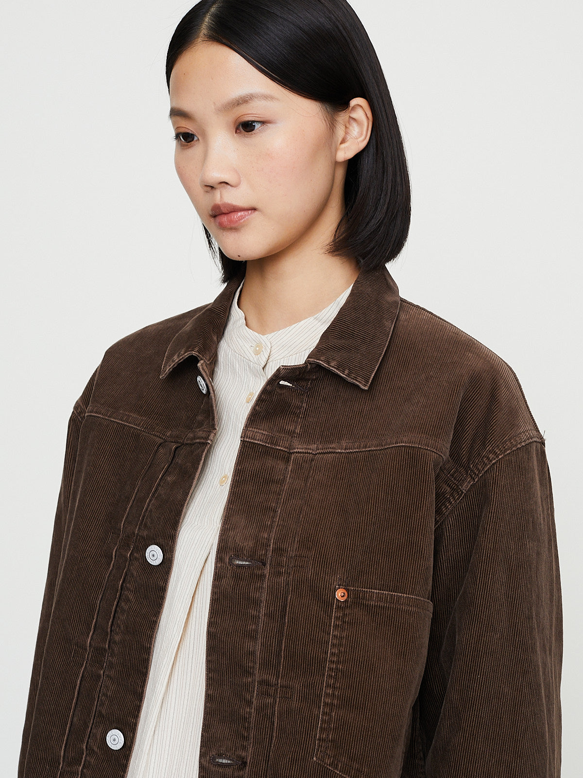 Unisex trucker jacket in brown sulfur-dyed cotton blend corduroy. Classic collar, front button fastening with tuck detailing at the placket. Long sleeves with buttoned cuffs and a single patch pocket on the front. Front and back yoke. Topstitching throughout. Regular fit.