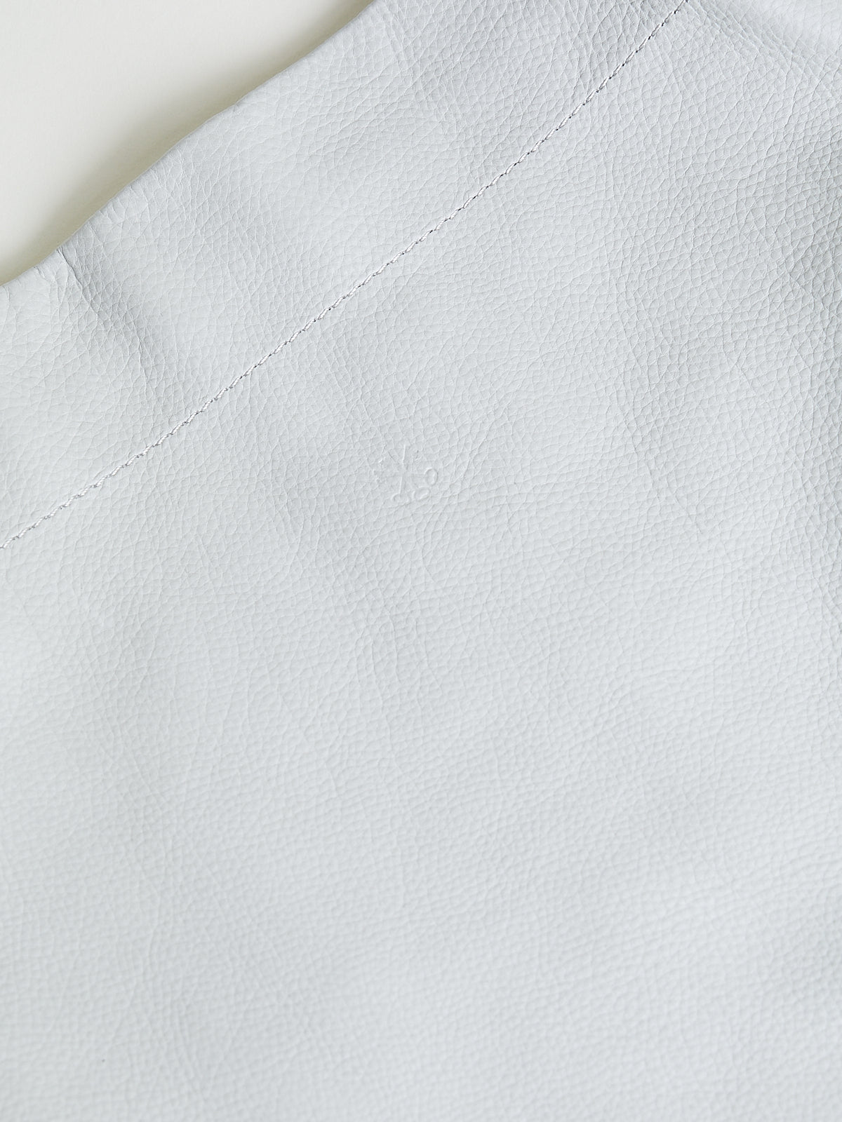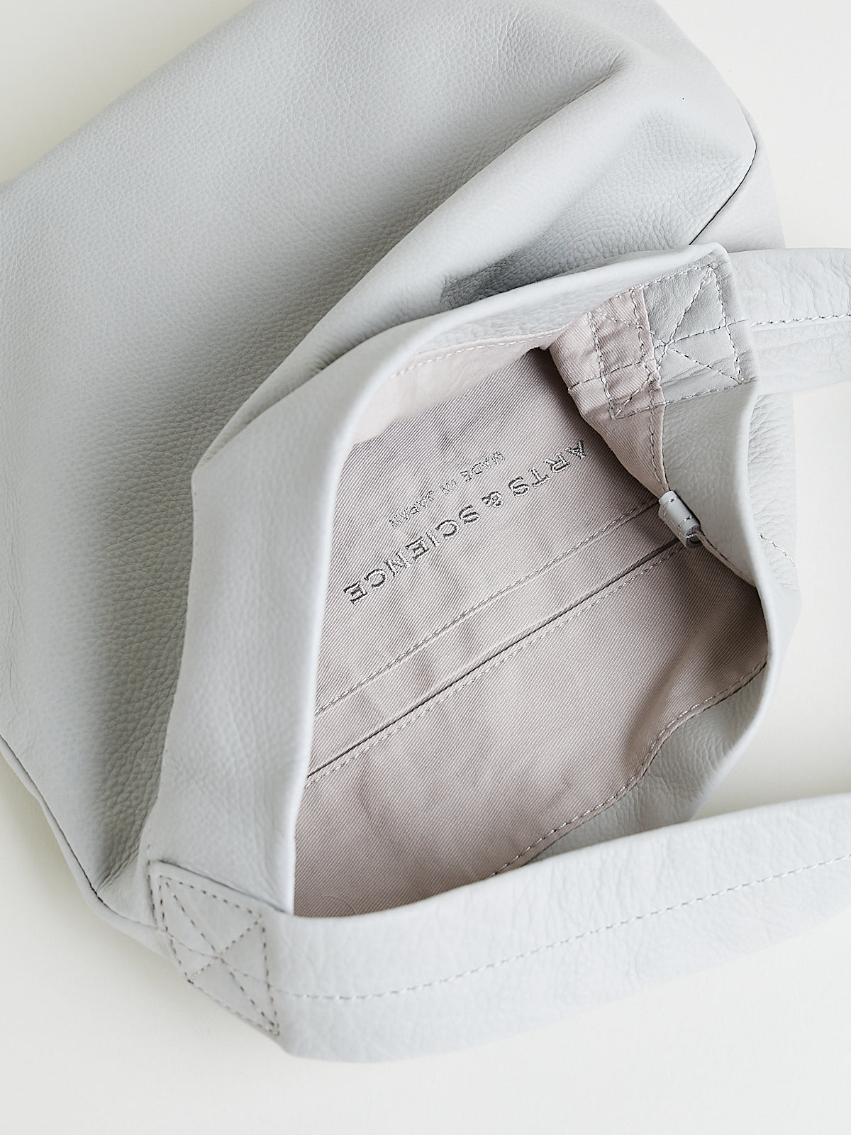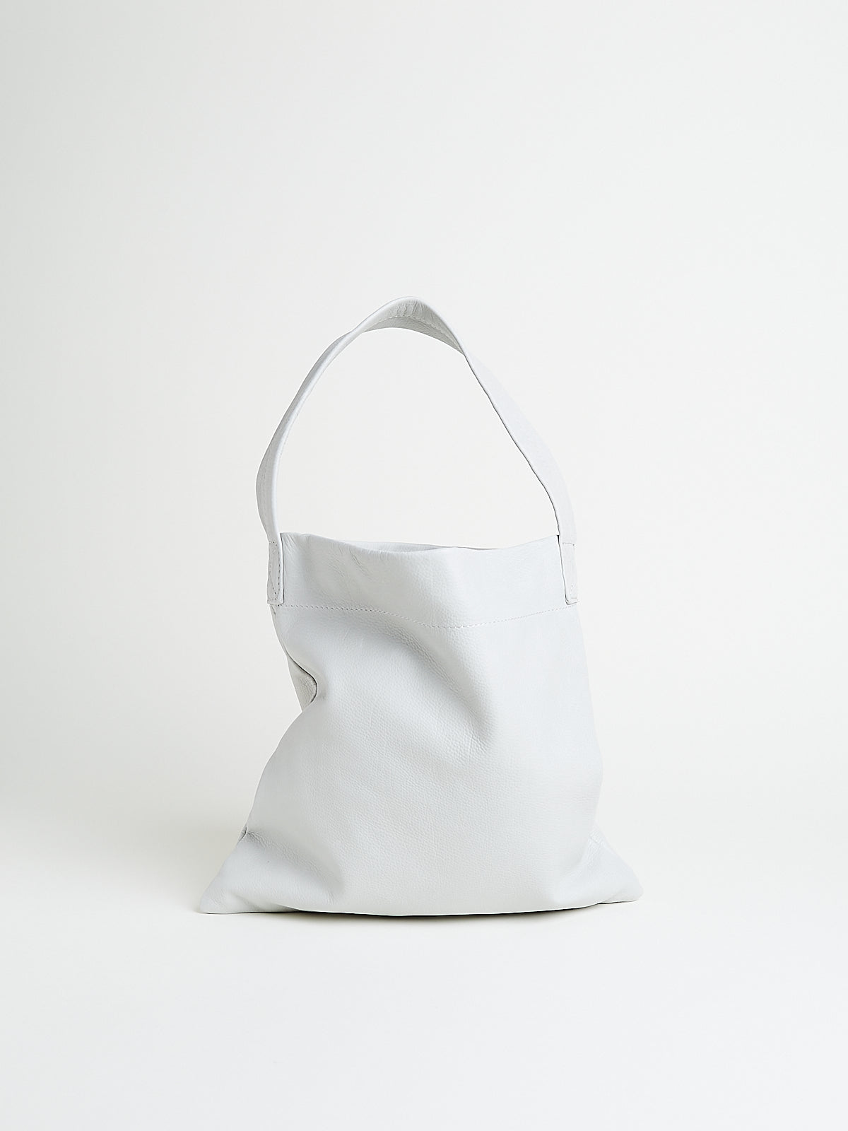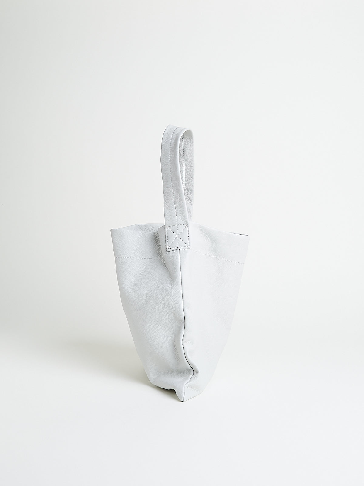 Small classic tote bag in soft light grey calf leather with a natural grain and creases. Features a single shoulder strap, an internal pocket and leather loop for keys. Fully lined in matching cotton and linen blend. Stamped logo on the outside, embroidered logo on the inside. Softens and ages beautiful by use, creates a supple and glossy look.