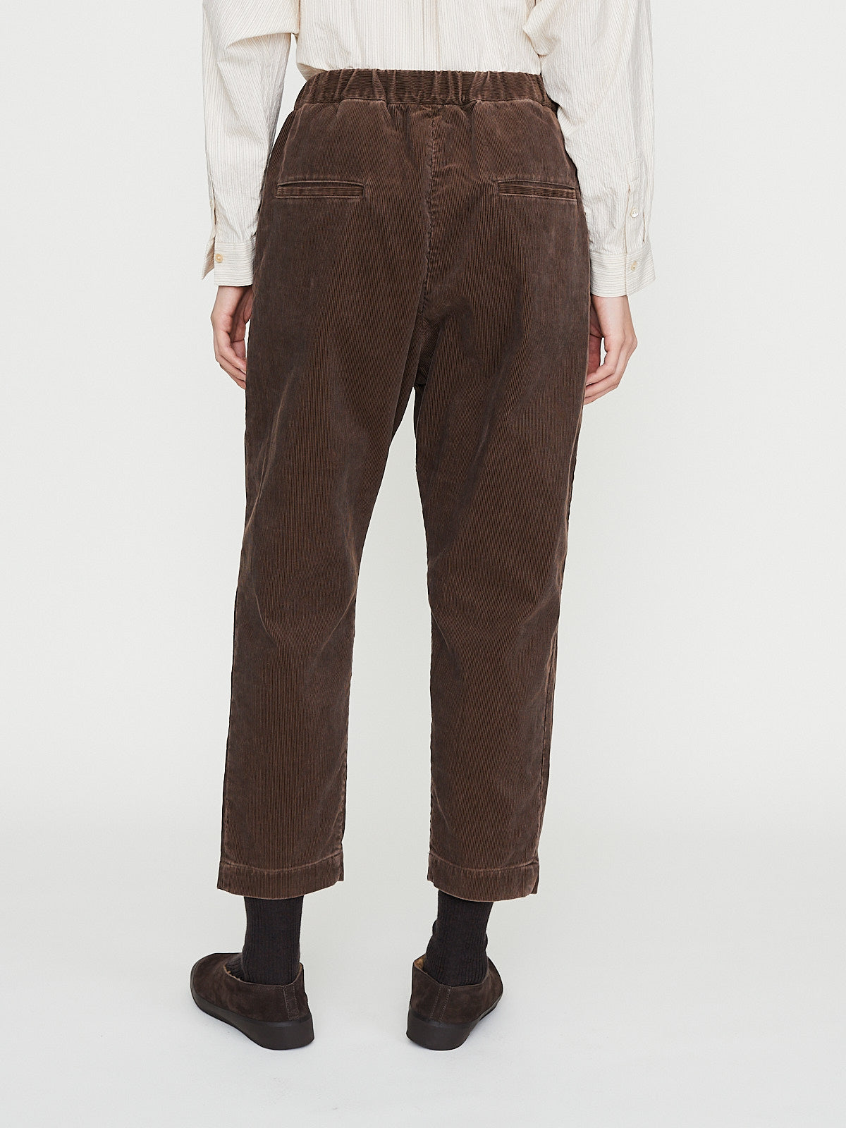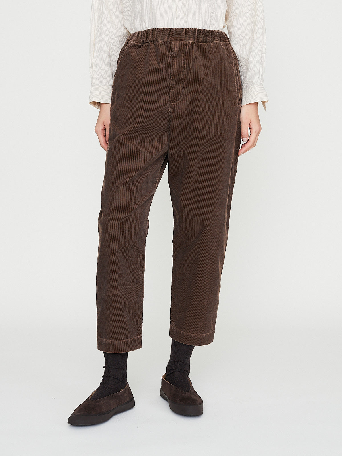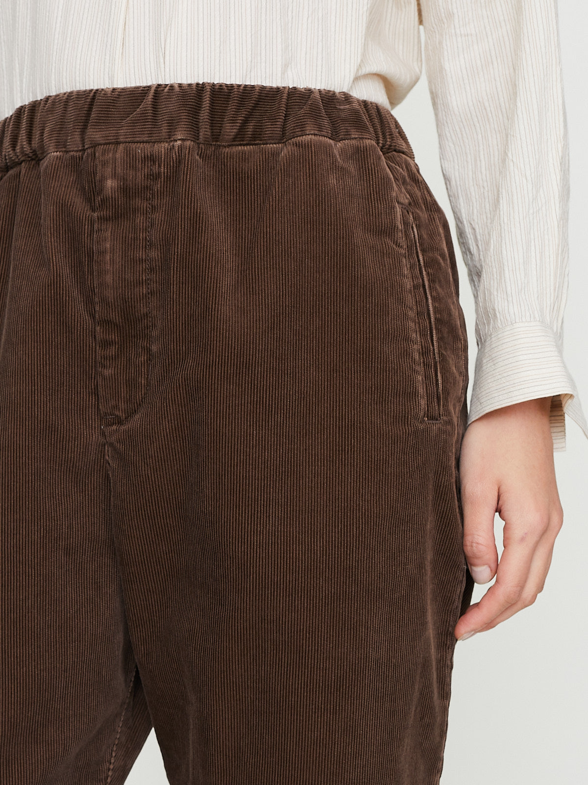 Unisex easy pants in brown cotton blend corduroy. Pull-on style with an elasticated waistband and welted pockets on the sides. Welted back pockets. Legs slightly taper at the cuffs.