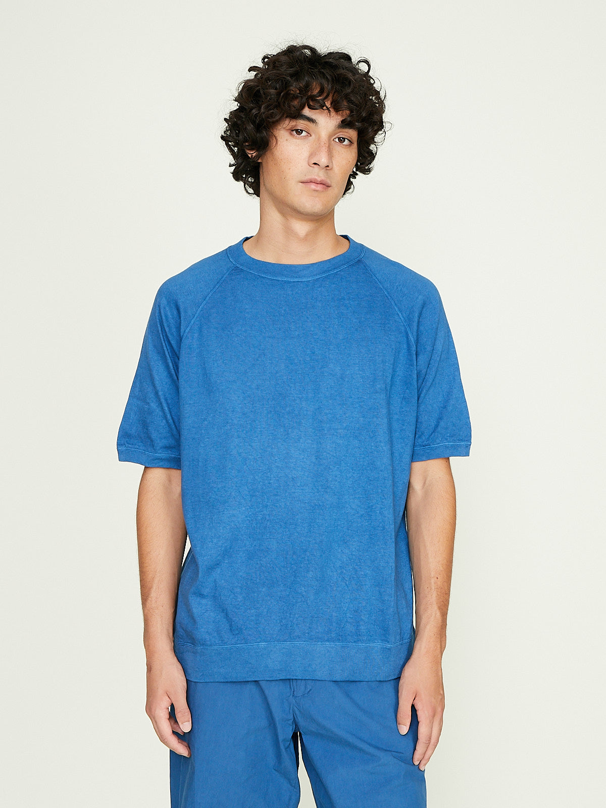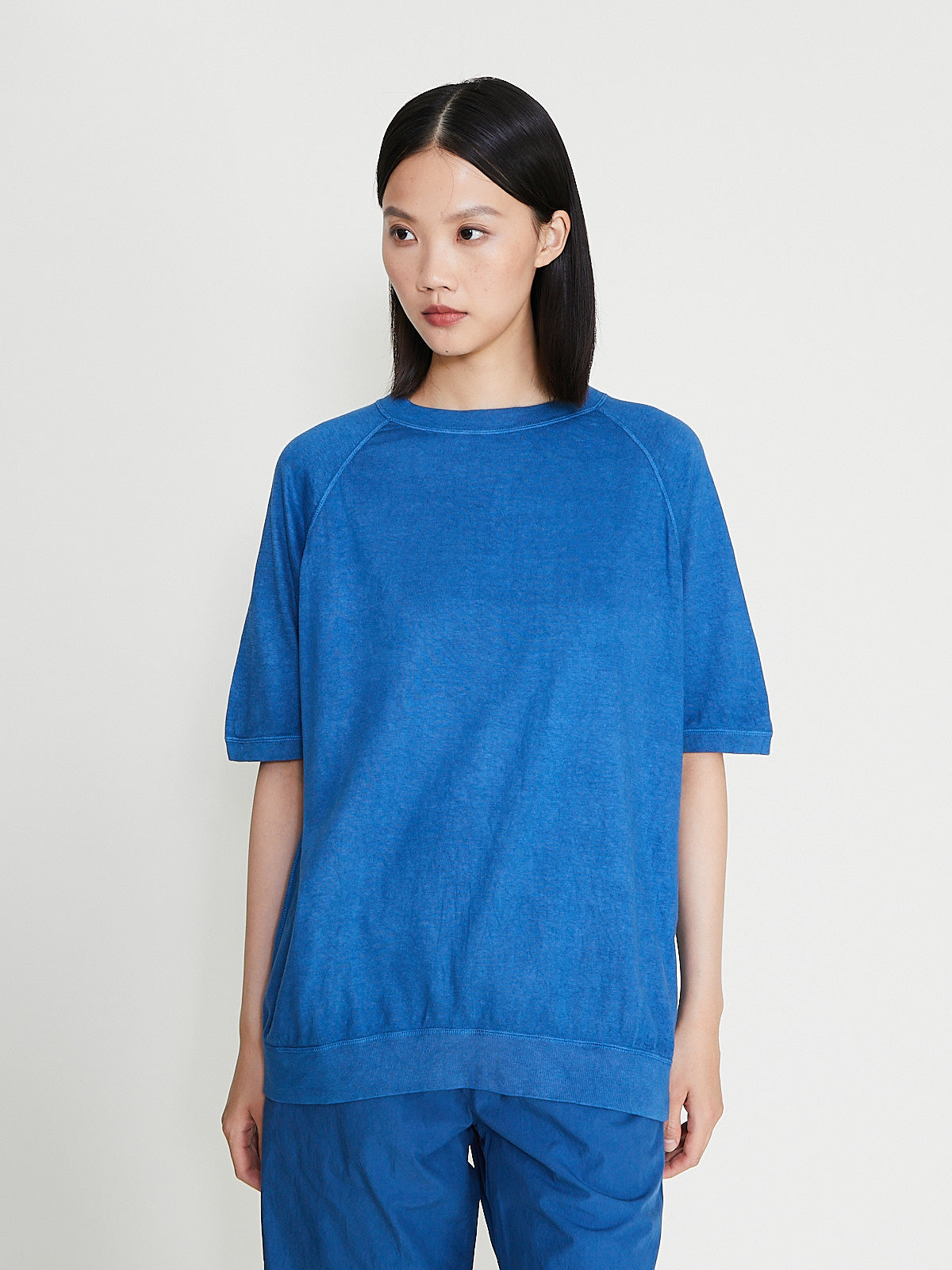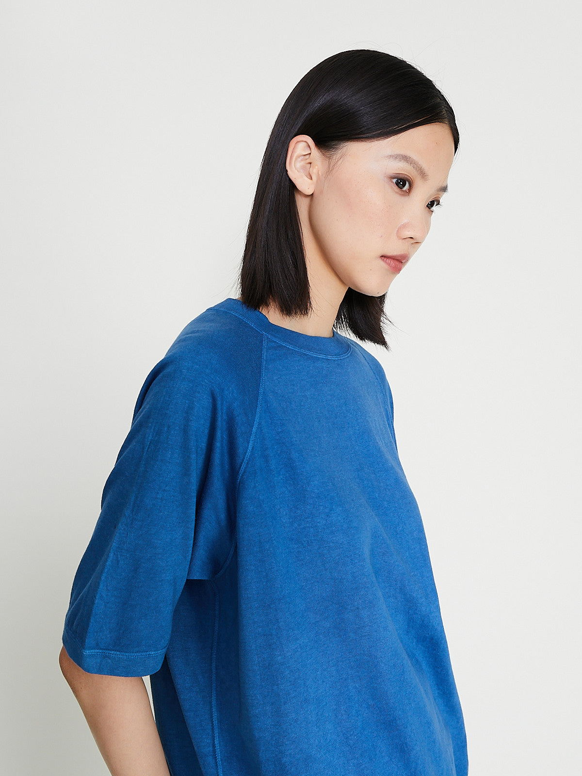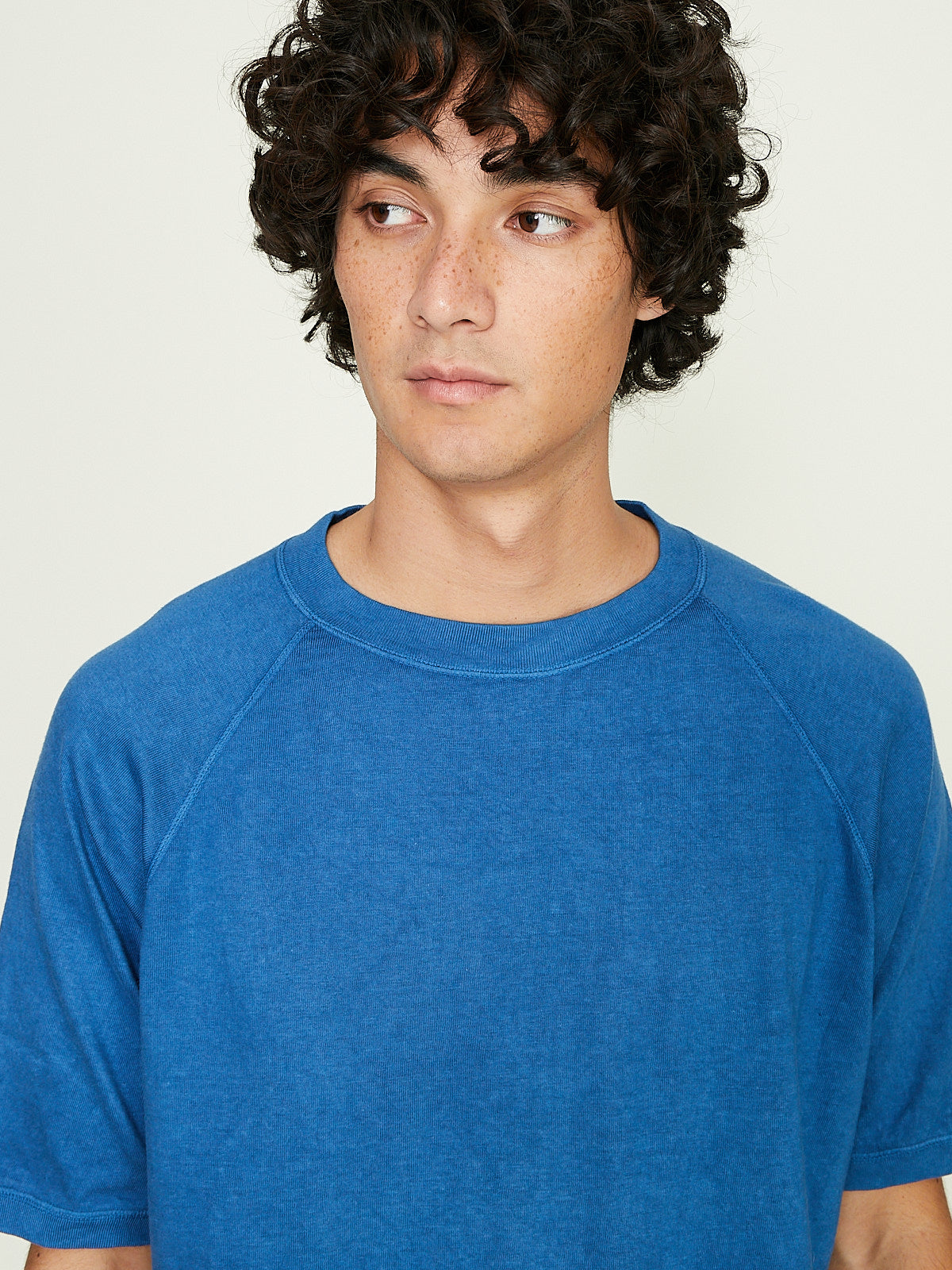 Relaxed unisex t-shirt in bright blue cotton jersey. Round neckline and short raglan sleeves. Features a rib detail around the neck, cuffs and bottom hem.