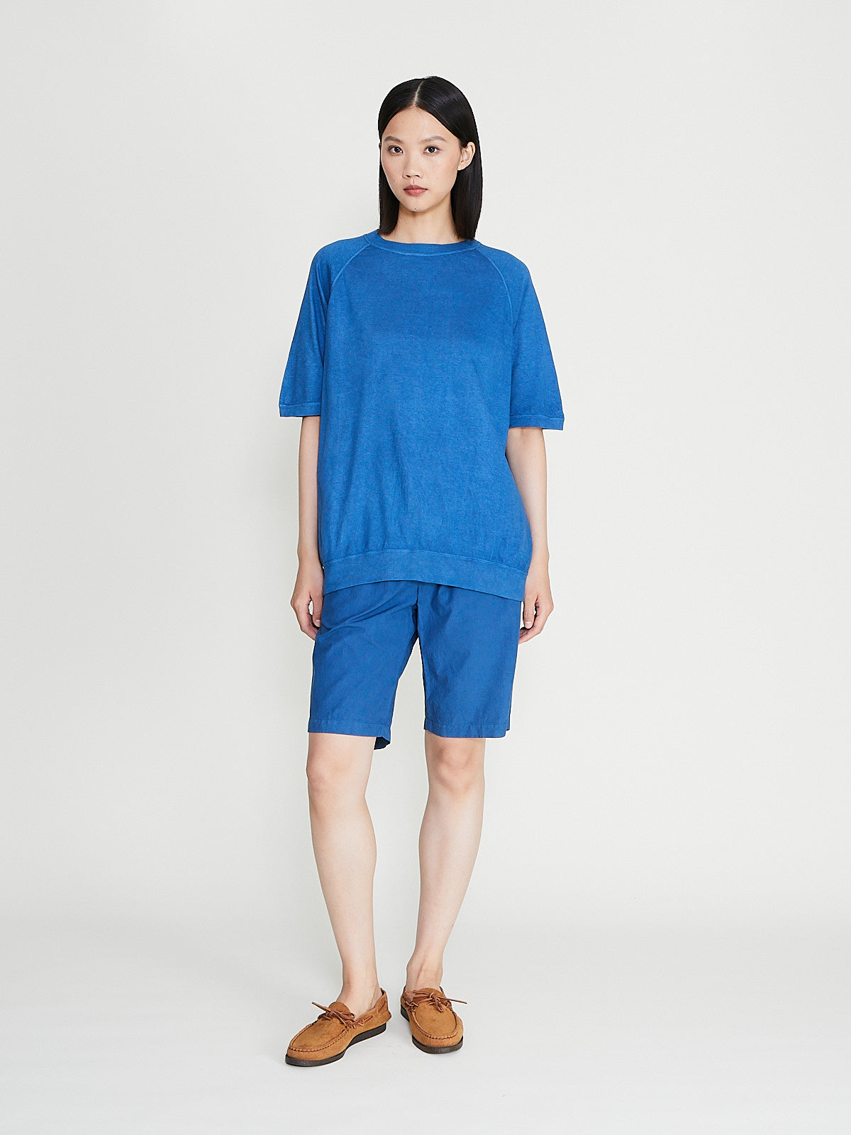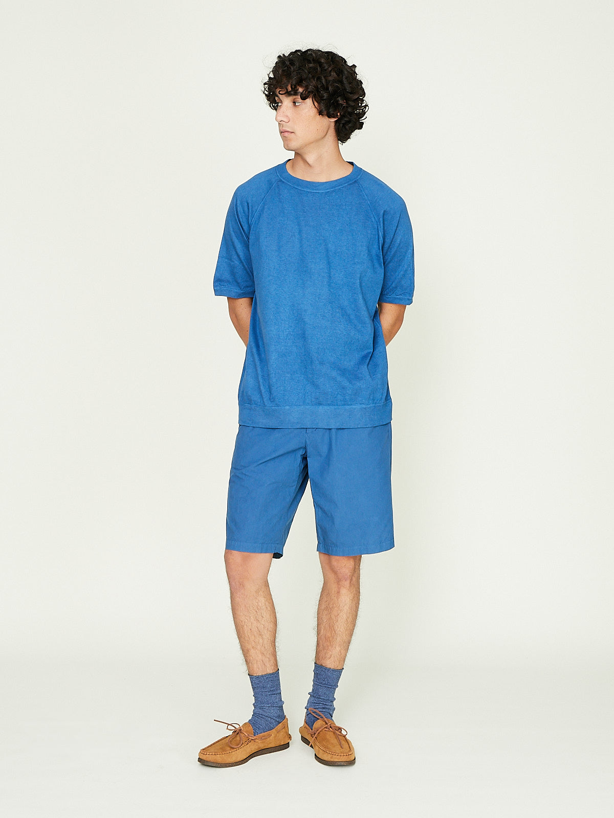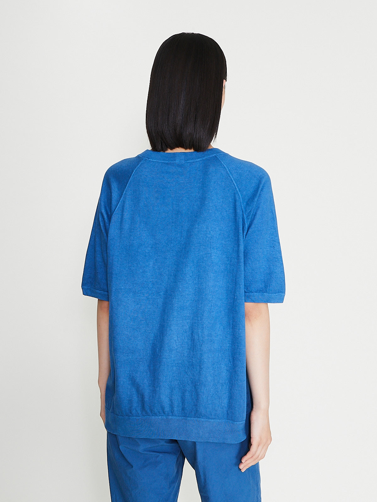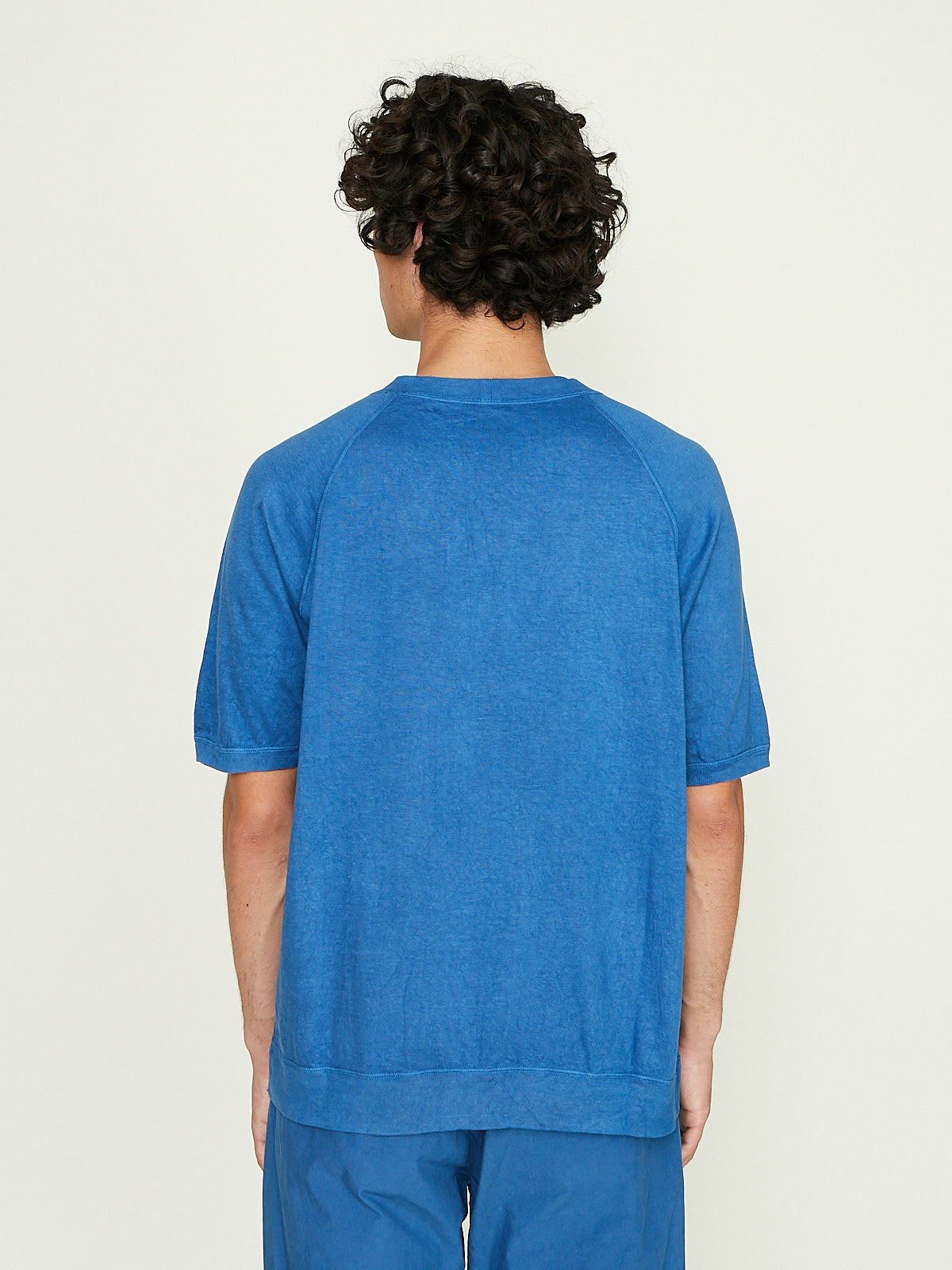 Relaxed unisex t-shirt in bright blue cotton jersey. Round neckline and short raglan sleeves. Features a rib detail around the neck, cuffs and bottom hem.