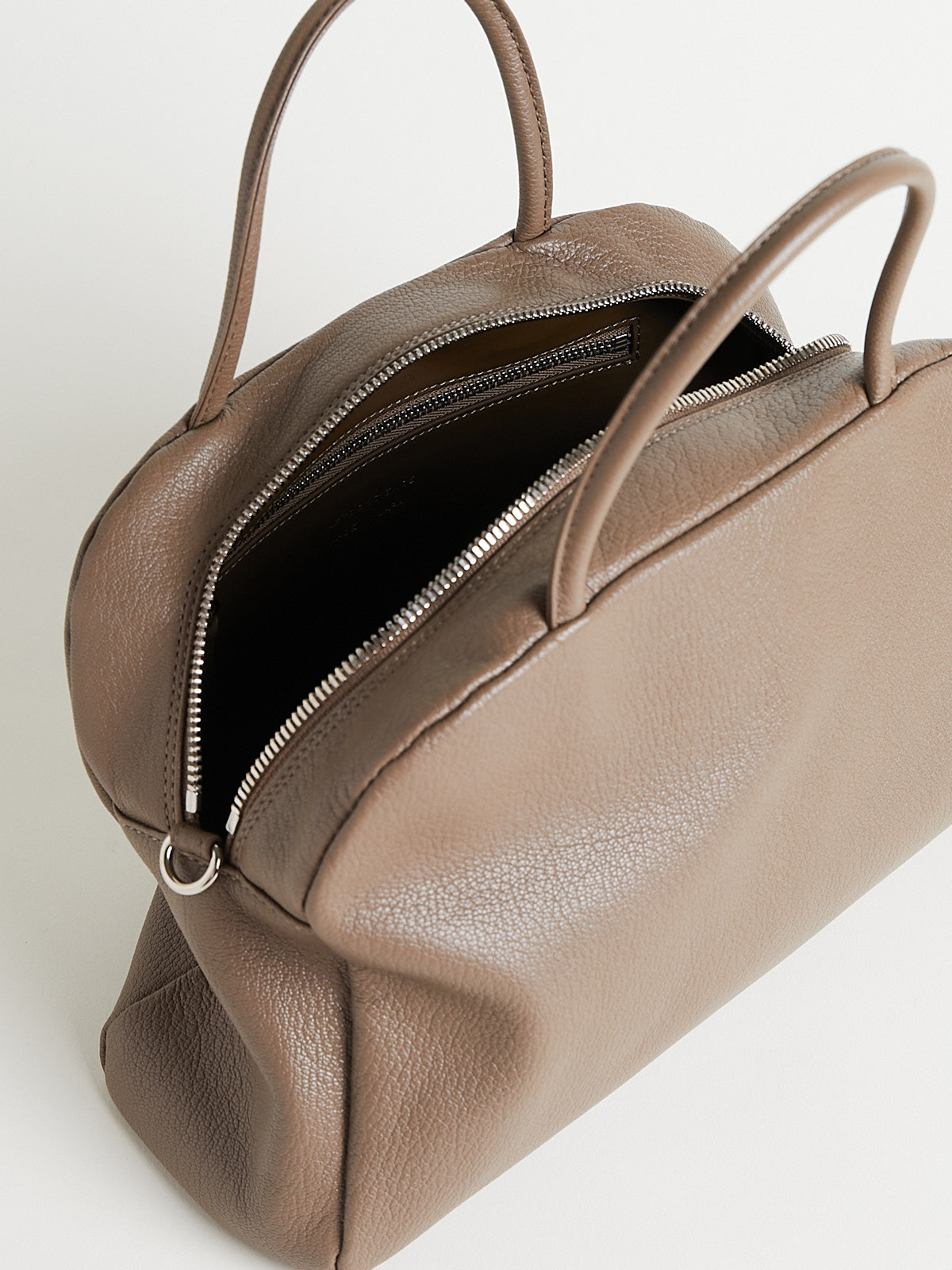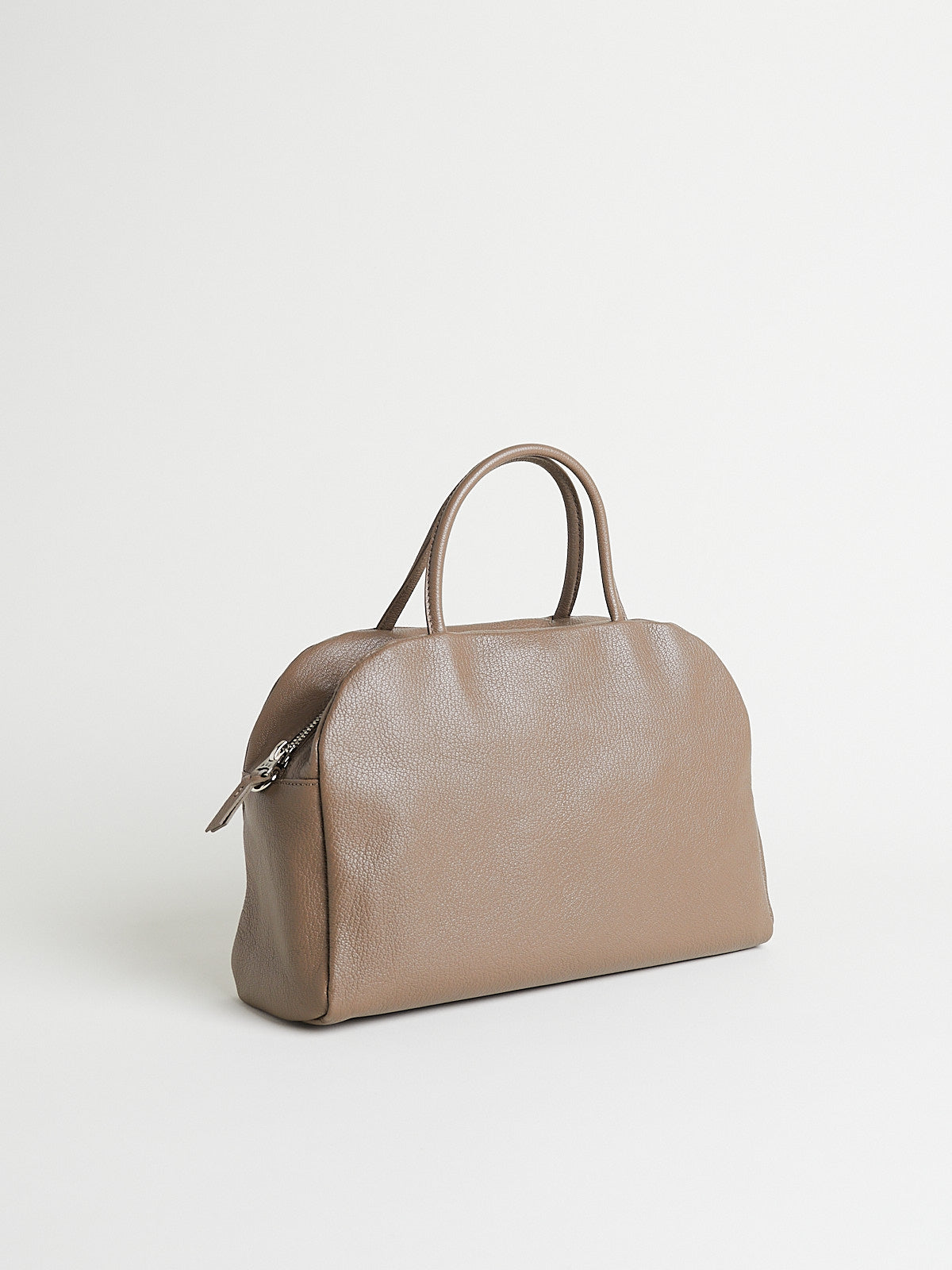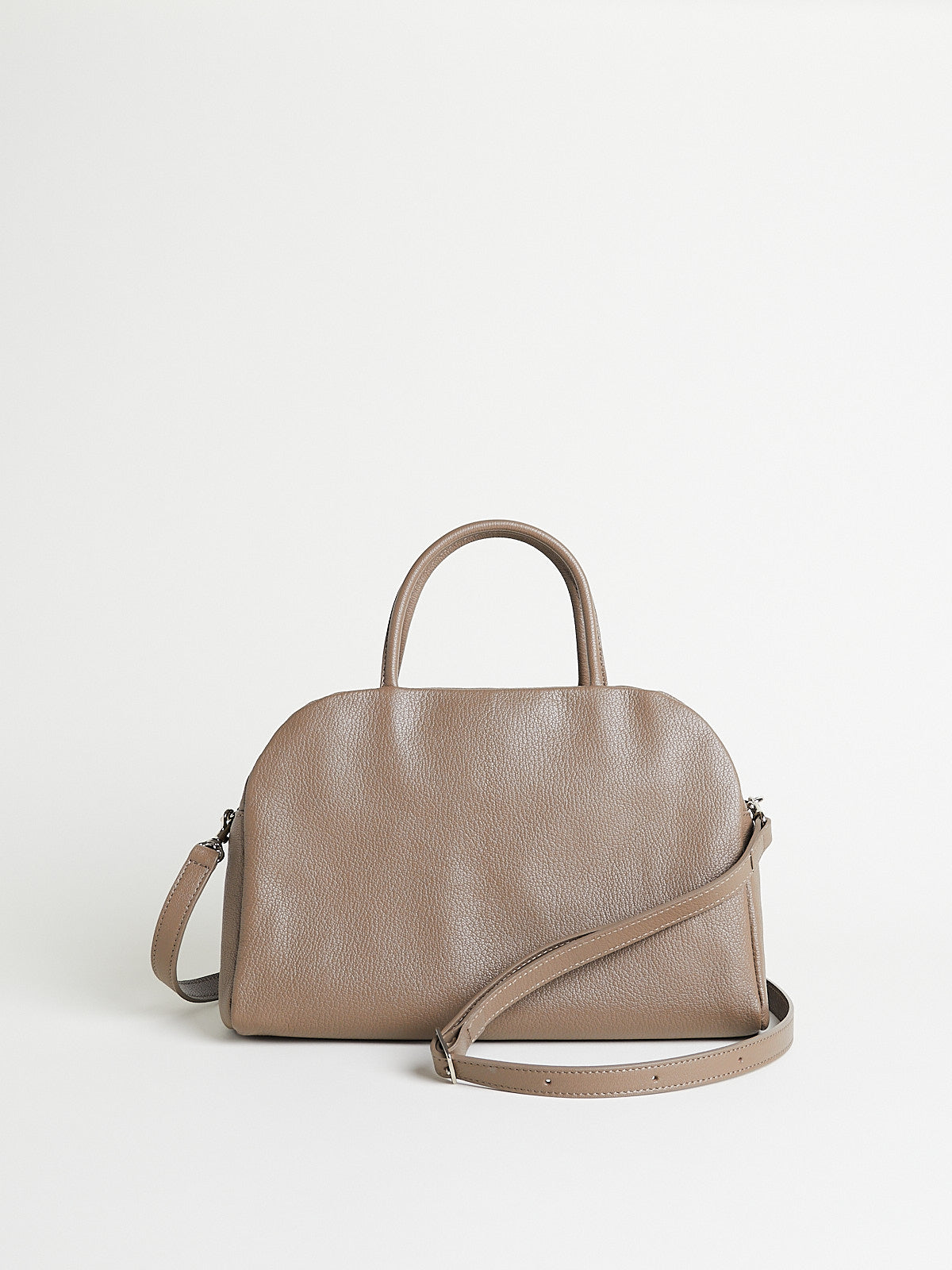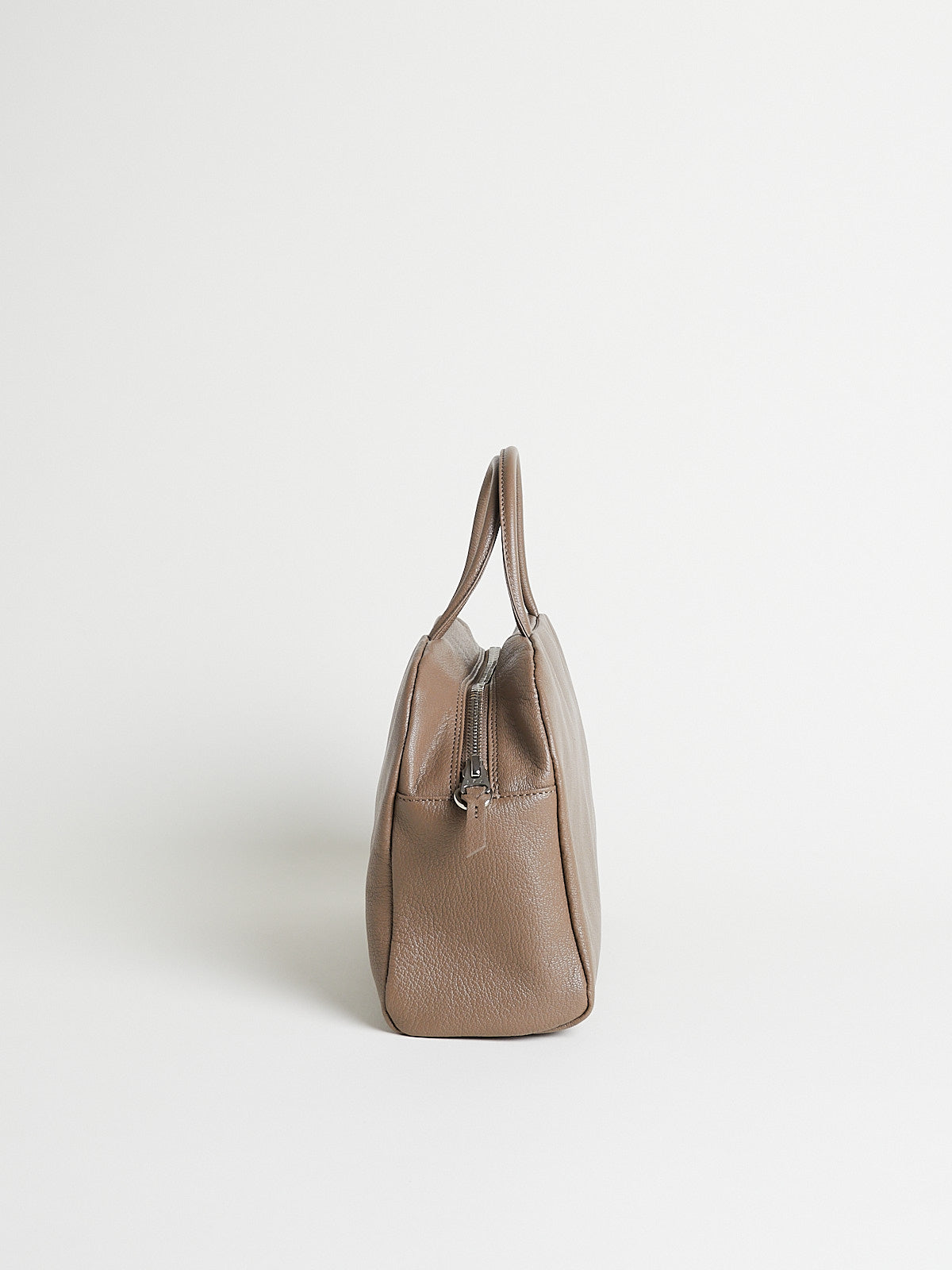 Classic structured small school bag in greige cow leather. Two short handles and a detachable shoulder strap. Features one main large compartment and an internal slip pocket with a zip fastening. Lined in leather.
