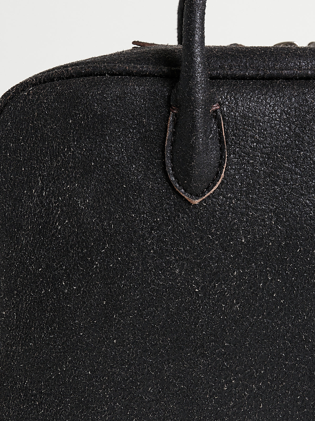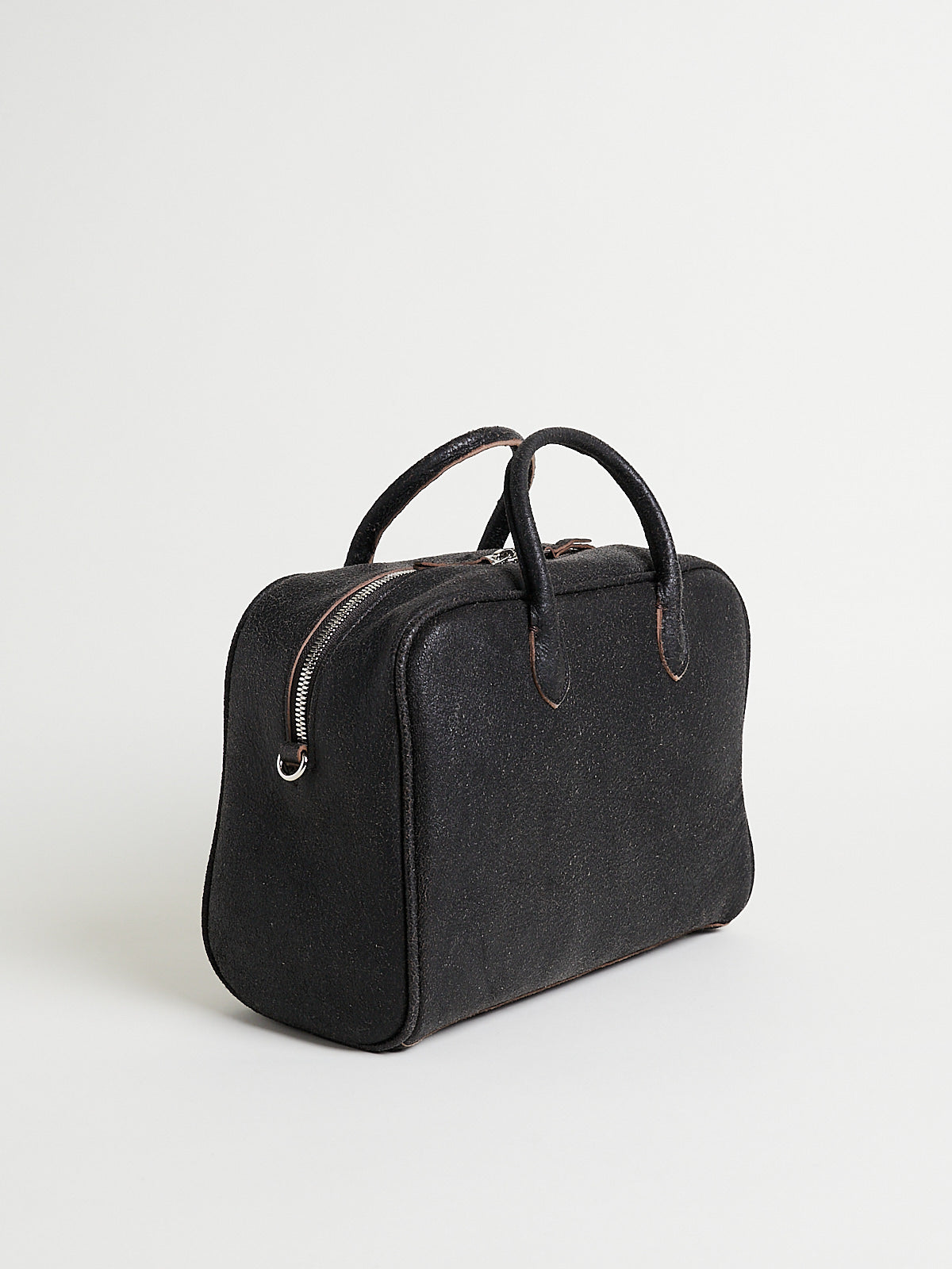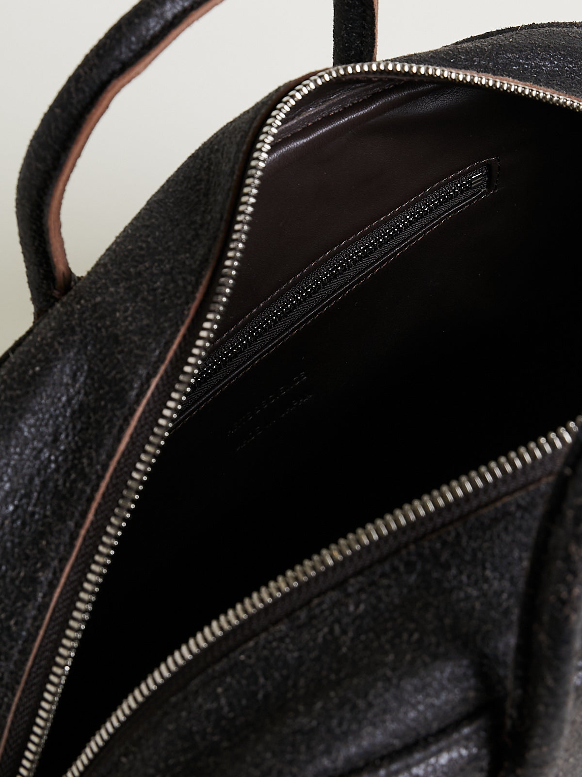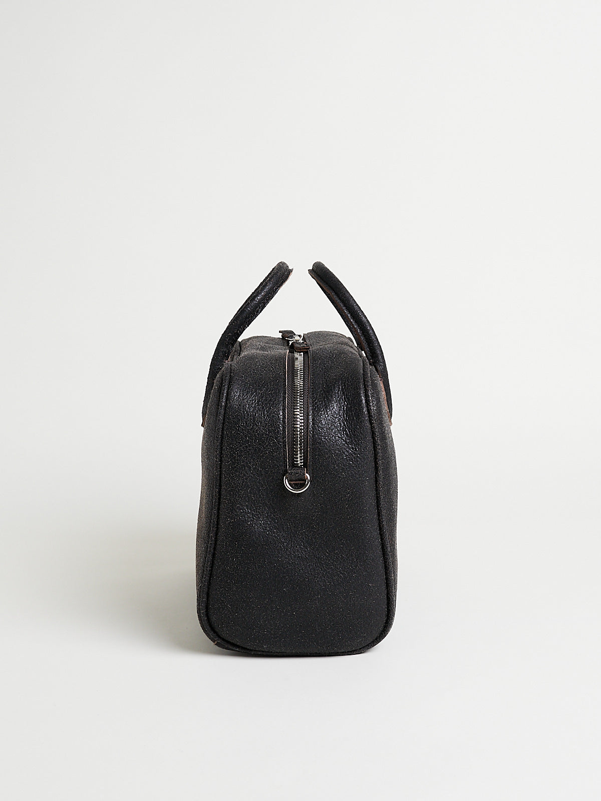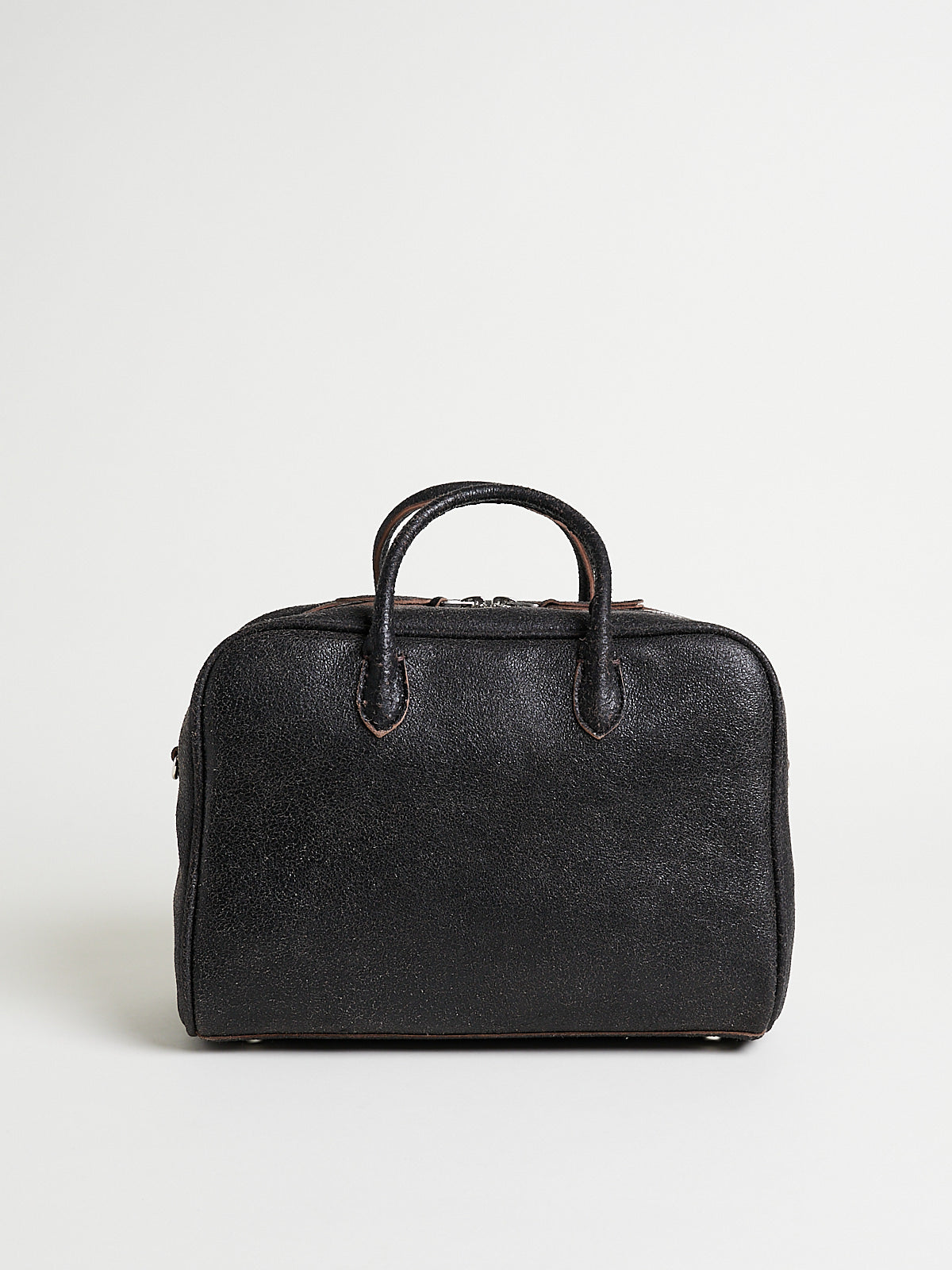 Structured bowling bag in dark brown cracked deer leather. Two short handles and a double zip fastening. One main compartment and an internal pocket with a zip fastening. Features metal studs on the bottom to elevate the bag. Lined in leather.