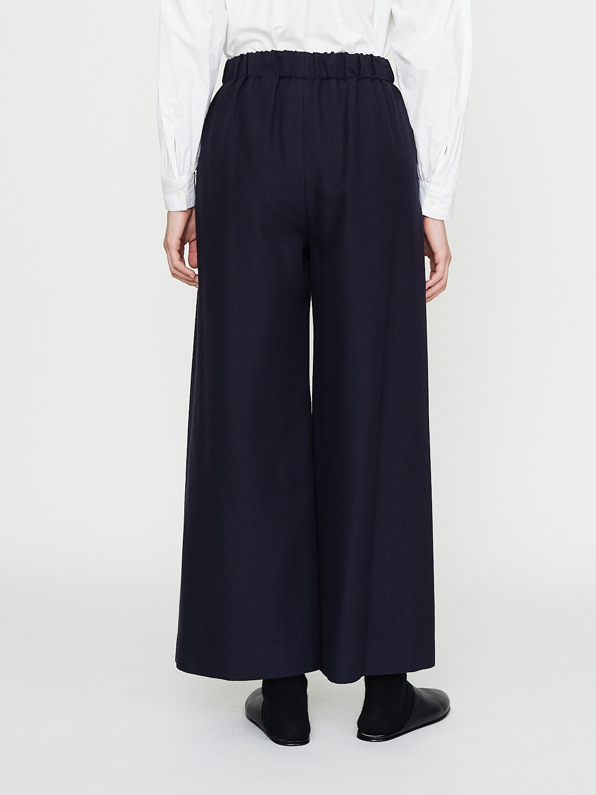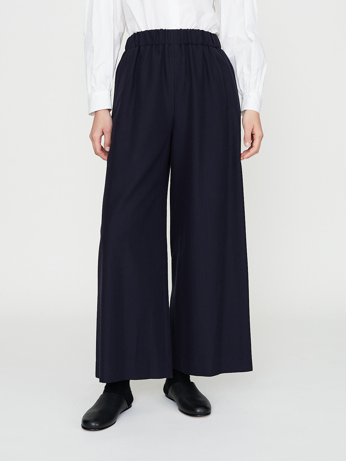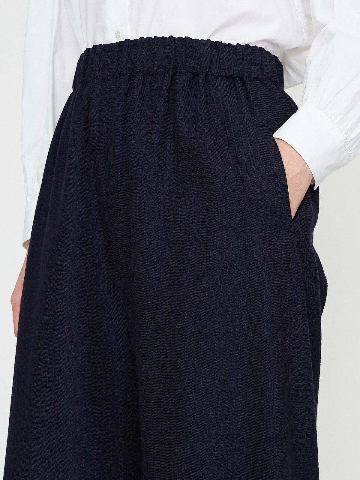 Wide pants in striped dark navy wool blend. Pull-on style with an elasticated waistband and welted slip pockets on the sides. Features no side seams.