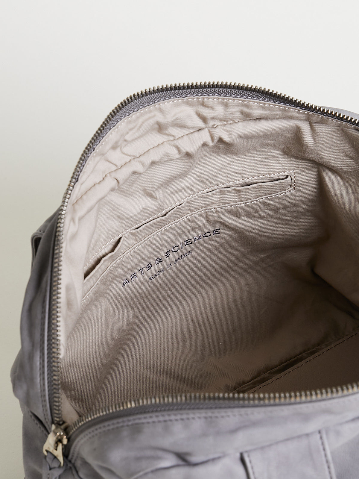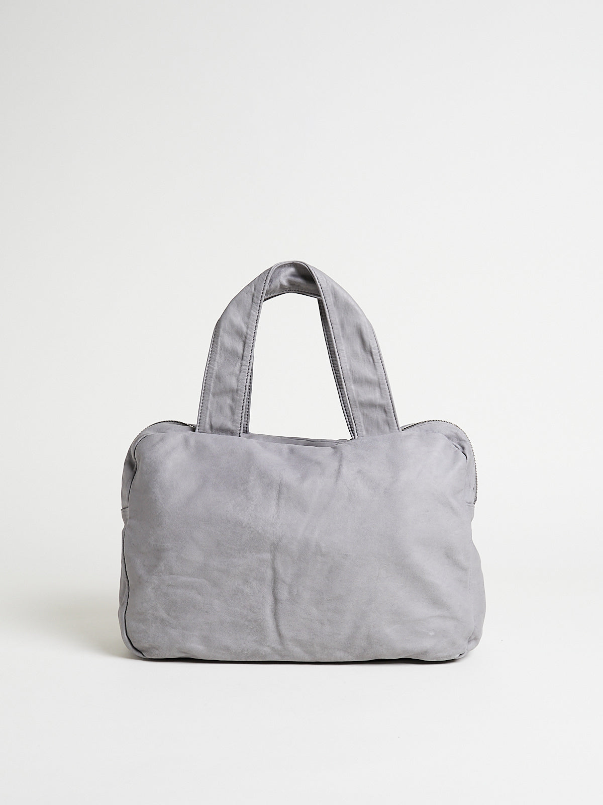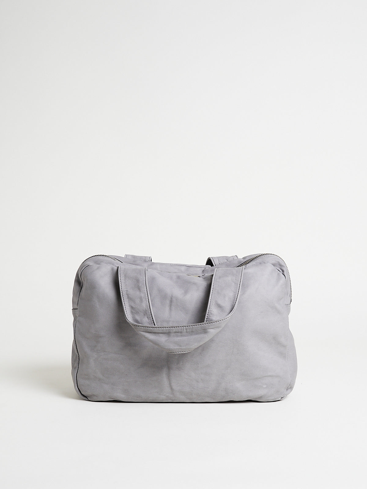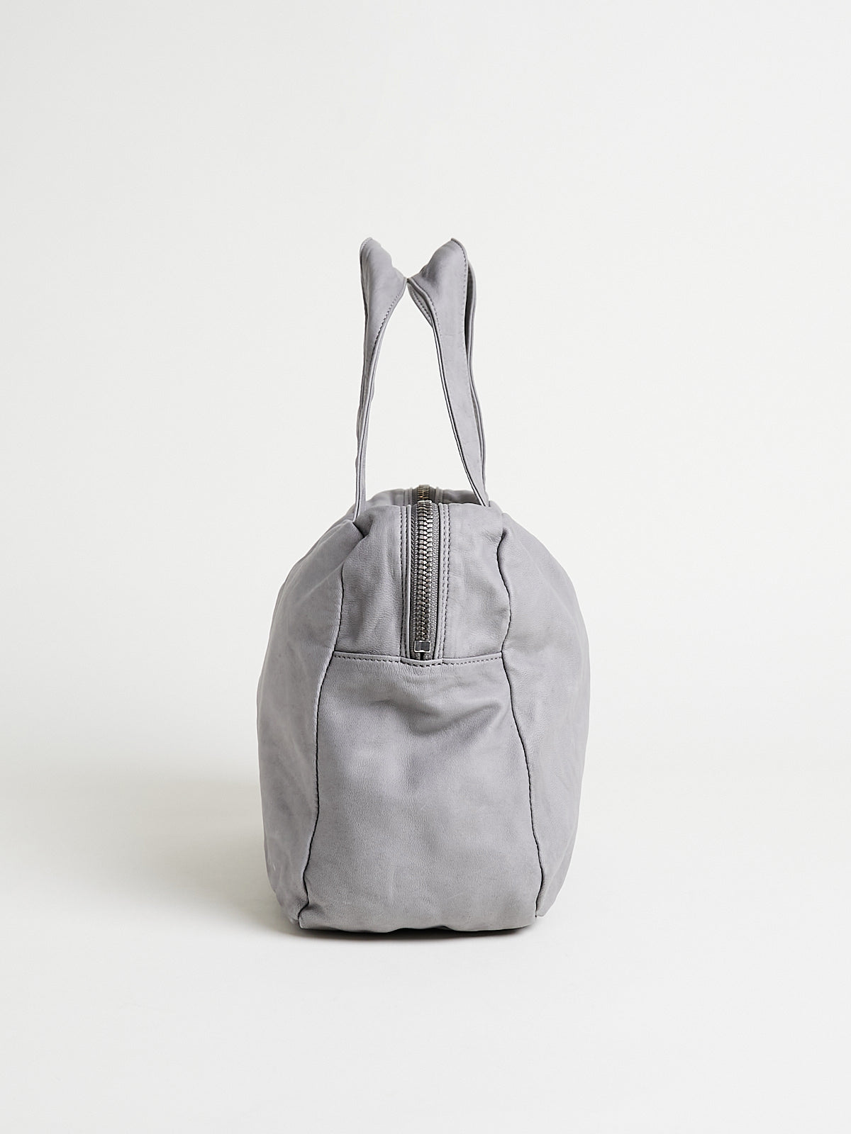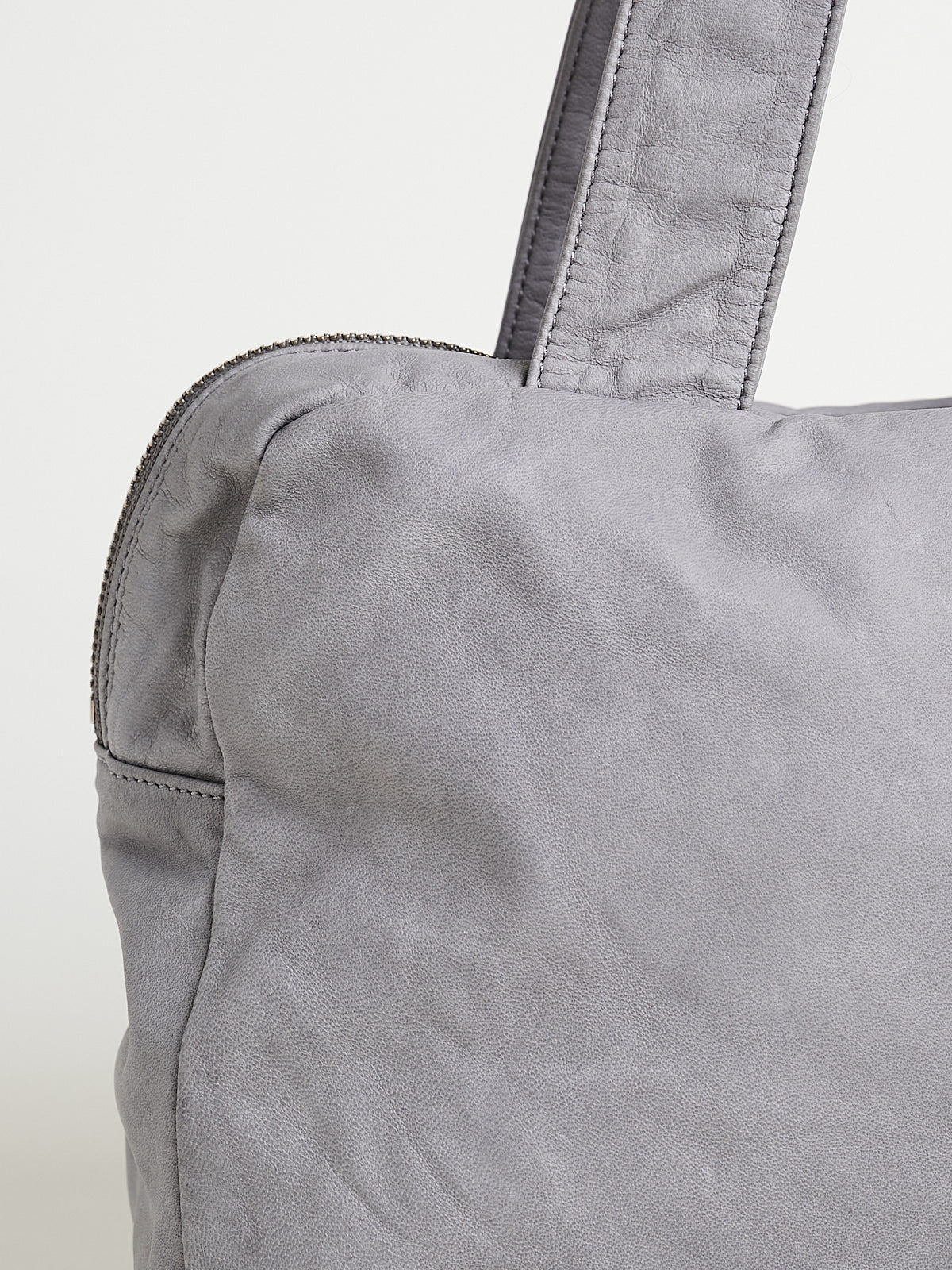 Square tote bag with two handles in smooth grey horse leather. Double zip fastening and one main compartment with an internal slip pocket. Fully lined in ecru cotton/linen.