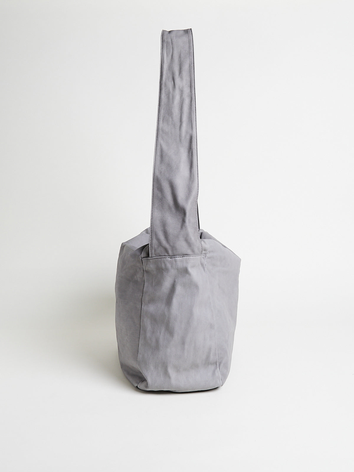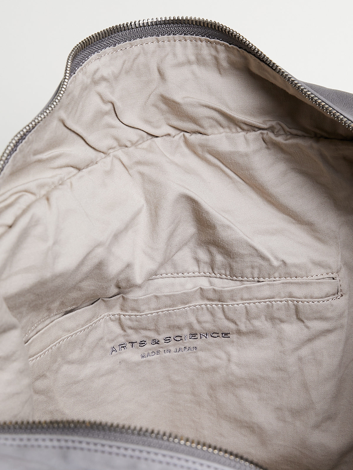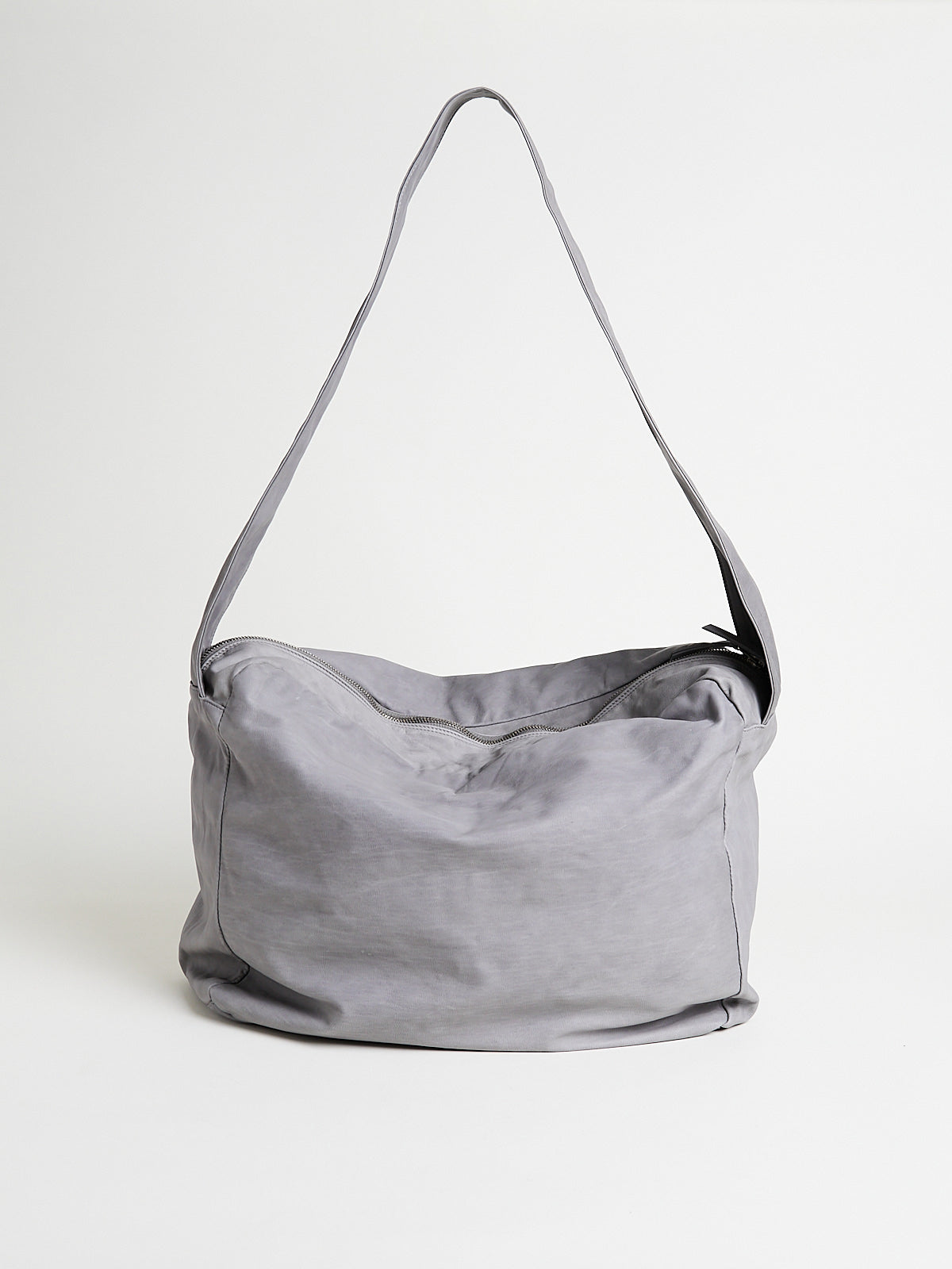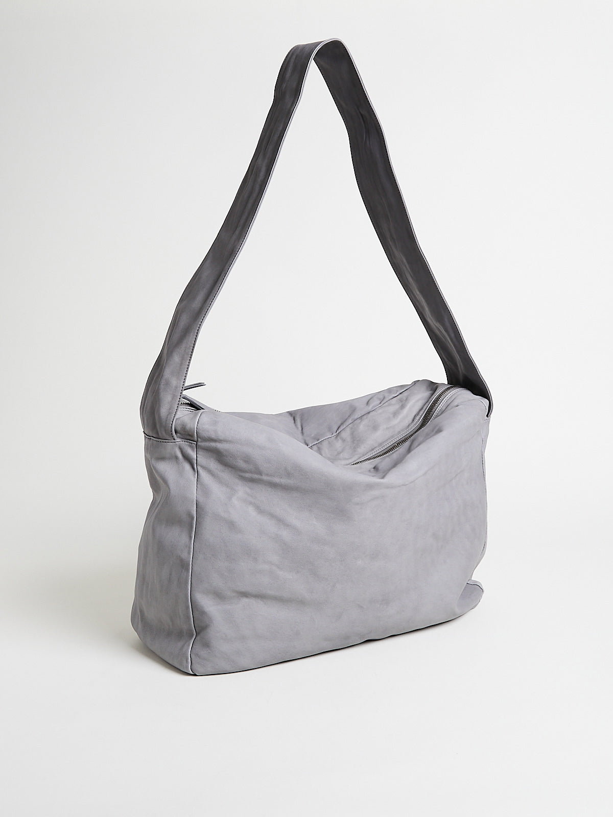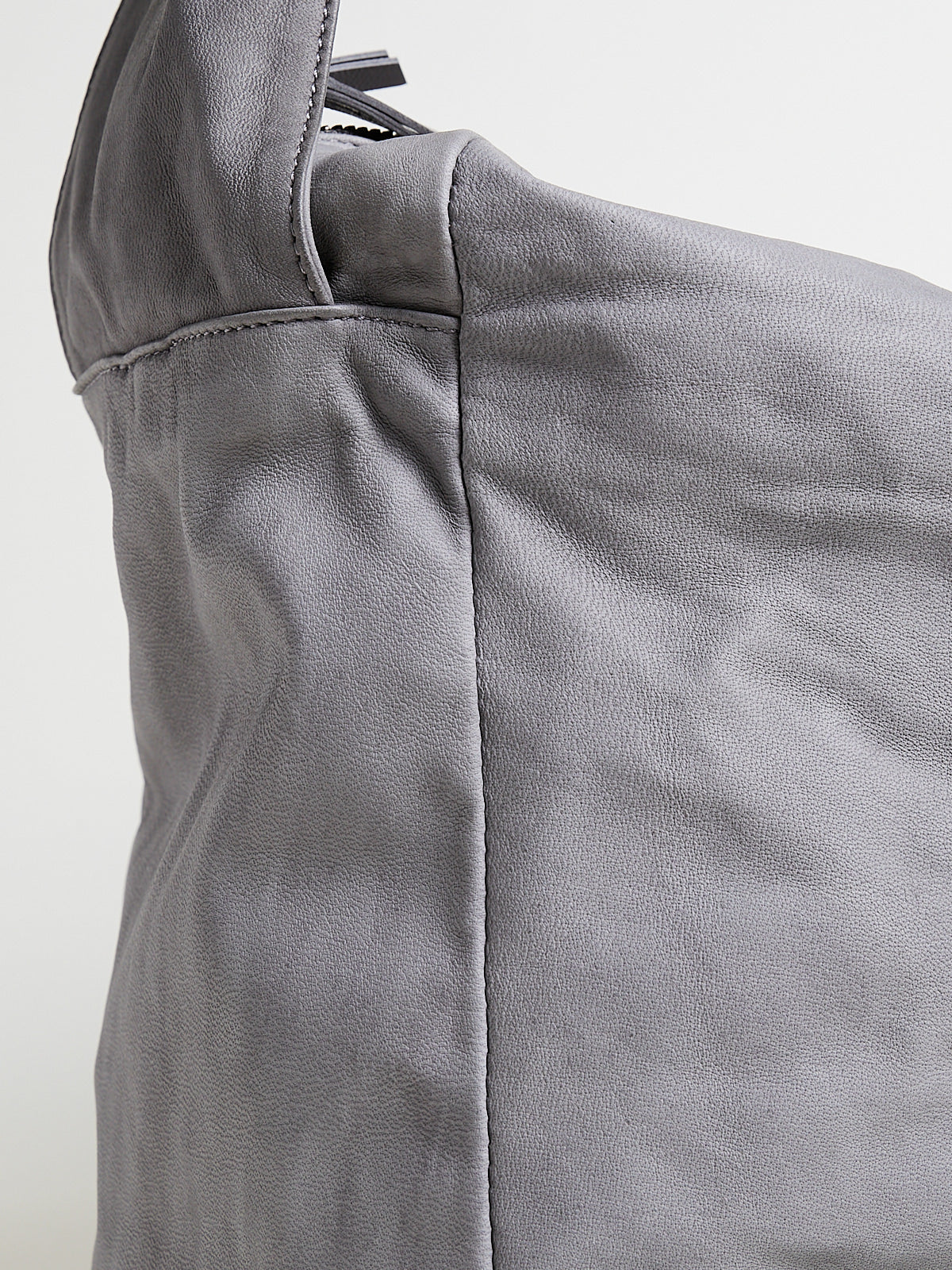 Square shoulder bag in a washed smooth grey horse leather. Double zip fastening and one main compartment with an internal pocket. Features long shoulder strap. Fully lined in ecru cotton/linen.