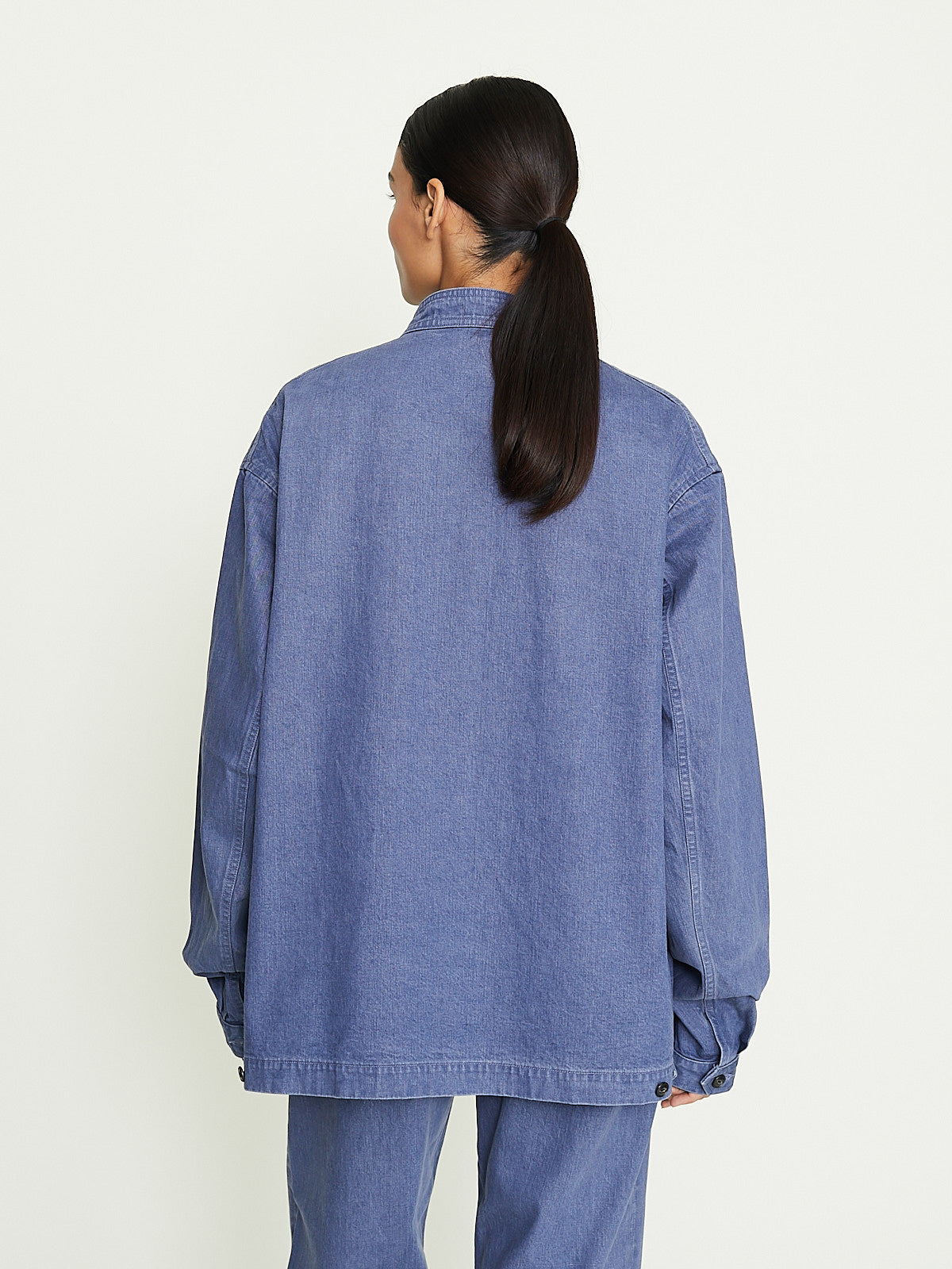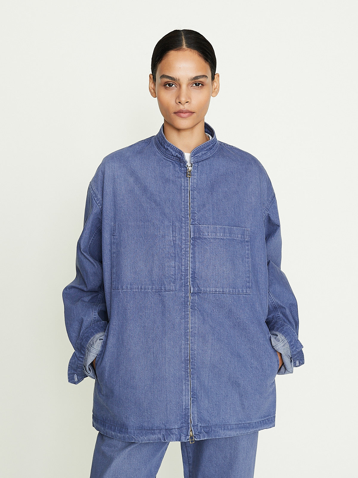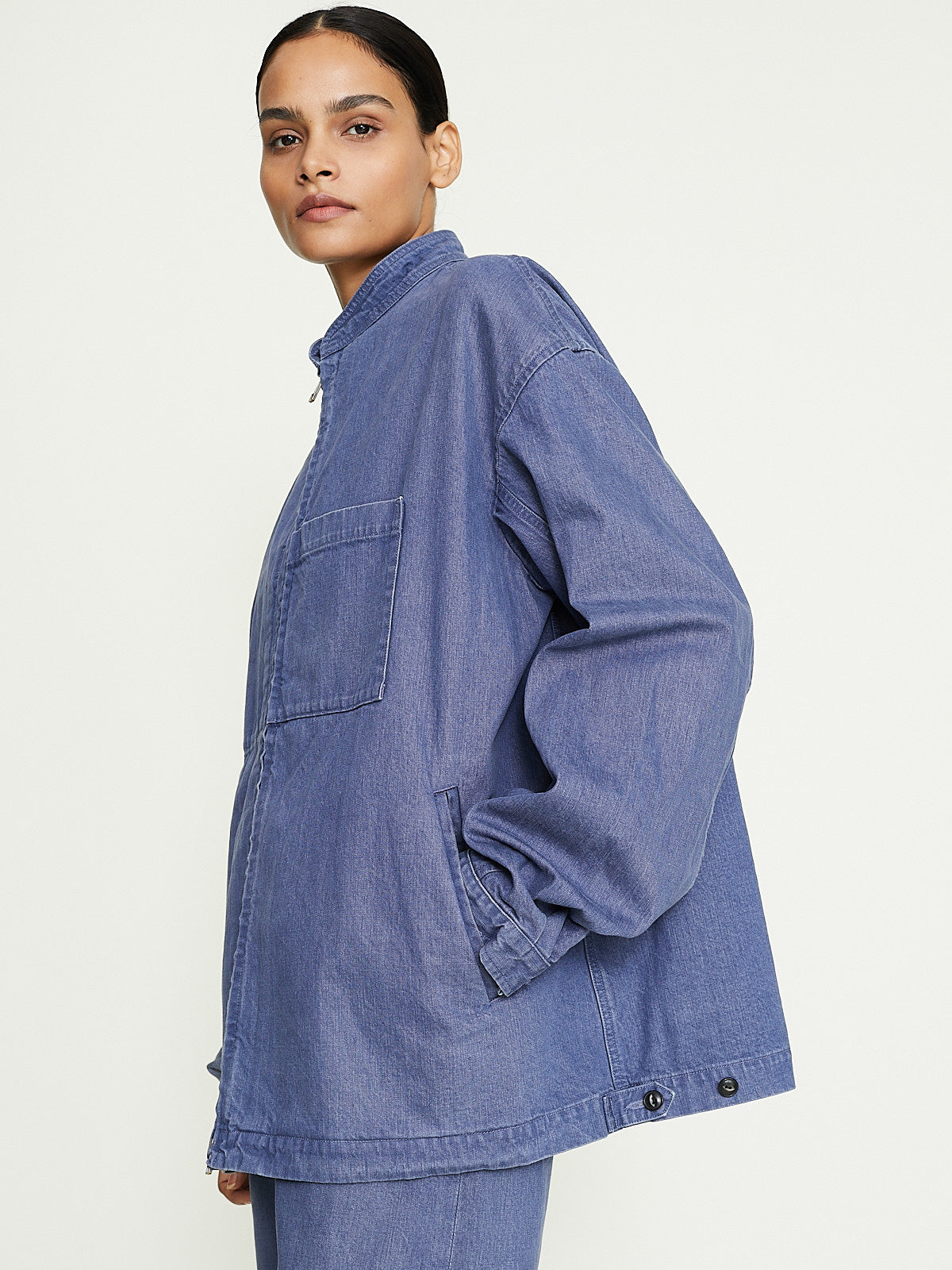 Oversized blouson in blue grey cotton denim. Banded collar, front zip fastening and long sleeves with buttoned cuffs. Welted slip pockets on the front and one external and one internal chest pocket. Adjustable button tabs on the sides of the waistband. Features contrasting topstitching throughout.