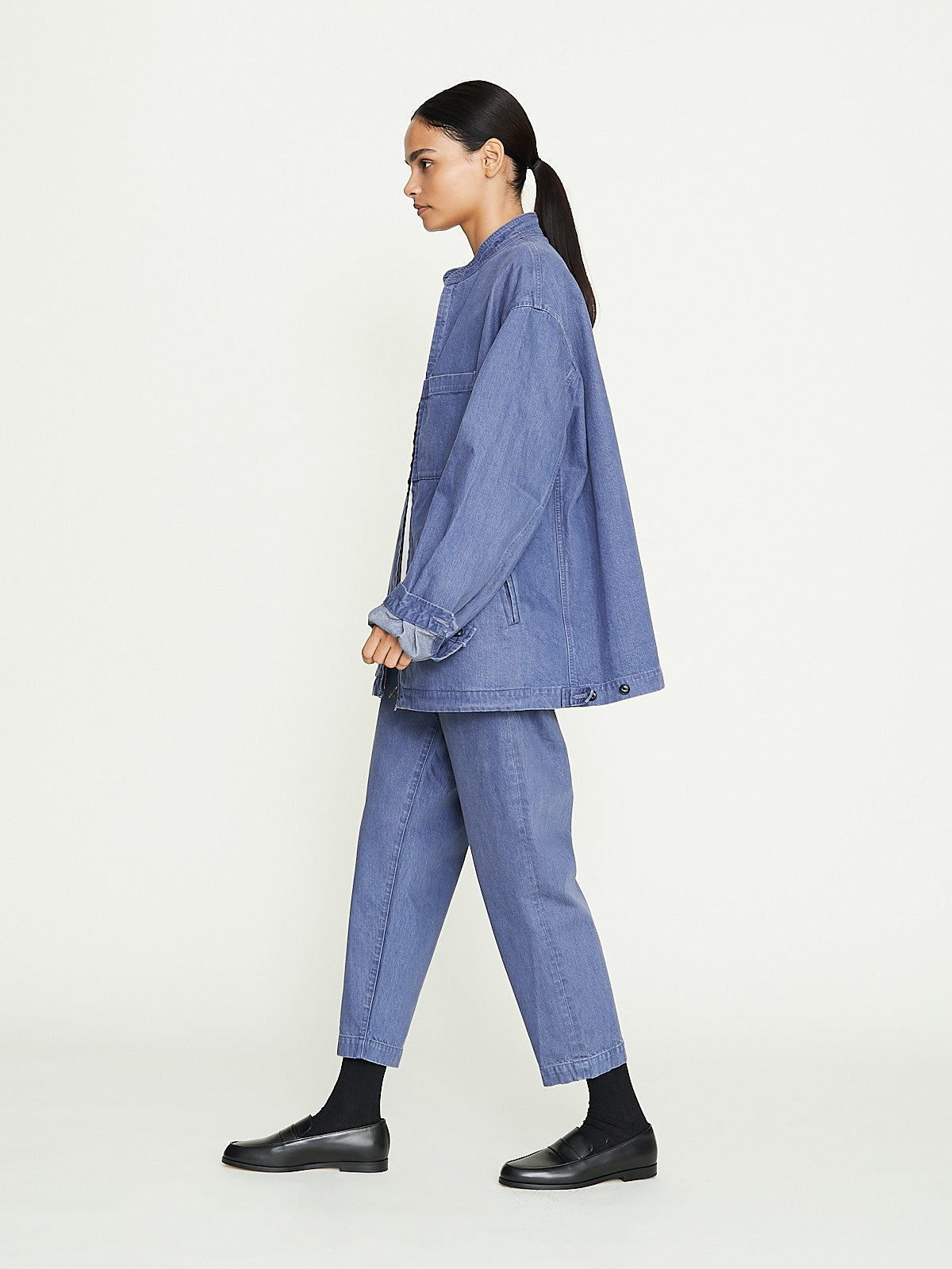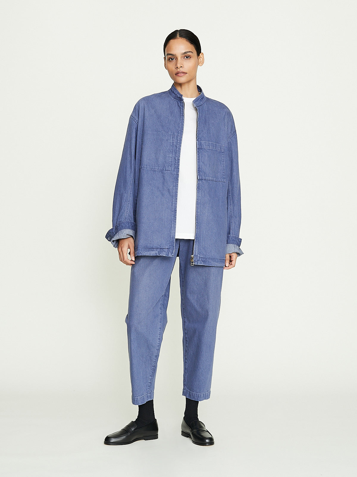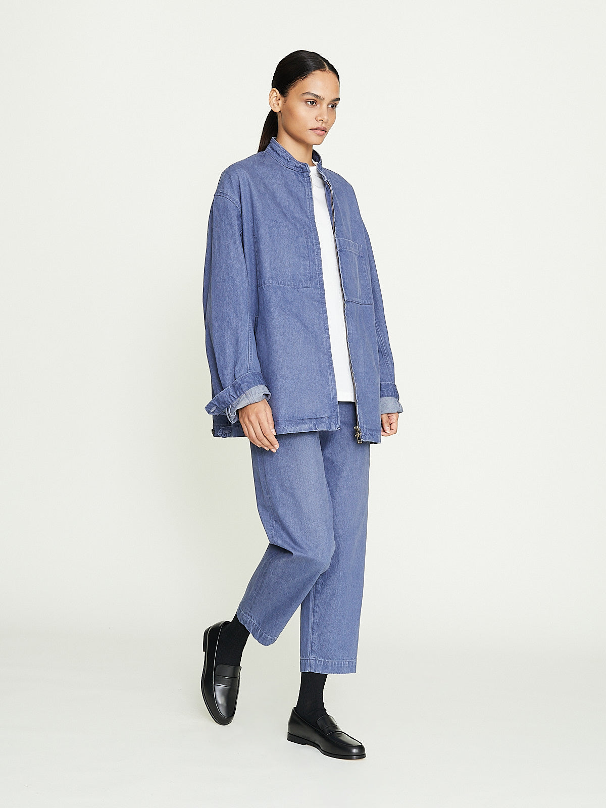 Oversized blouson in blue grey cotton denim. Banded collar, front zip fastening and long sleeves with buttoned cuffs. Welted slip pockets on the front and one external and one internal chest pocket. Adjustable button tabs on the sides of the waistband. Features contrasting topstitching throughout.